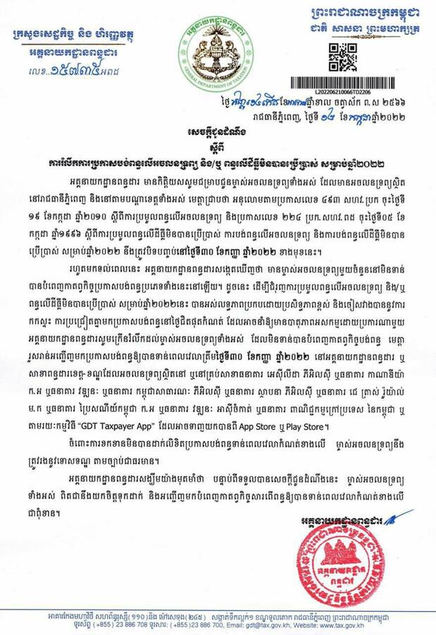យោងតាមការចុះផ្សាយរបស់ក្រសួងព័ត៌មាននៅថ្ងៃទី១៣ ខែកក្កដា នេះបានឱ្យដឹងថា អគ្គនាយកដ្ឋានពន្ធដារ បានក្រើនរំលឹកដល់ម្ចាស់ អចលនទ្រព្យទាំងអស់ ដែលមិនទាន់បានបំពេញកាតព្វកិច្ចបង់ពន្ធ រួសរាន់អញ្ជើញ ប្រកាសបង់ពន្ធឲ្យបានទាន់ពេលវេលា ត្រឹមថ្ងៃទី៣០ ខែកញ្ញា ឆ្នាំ២០២២ ខាងមុខ។