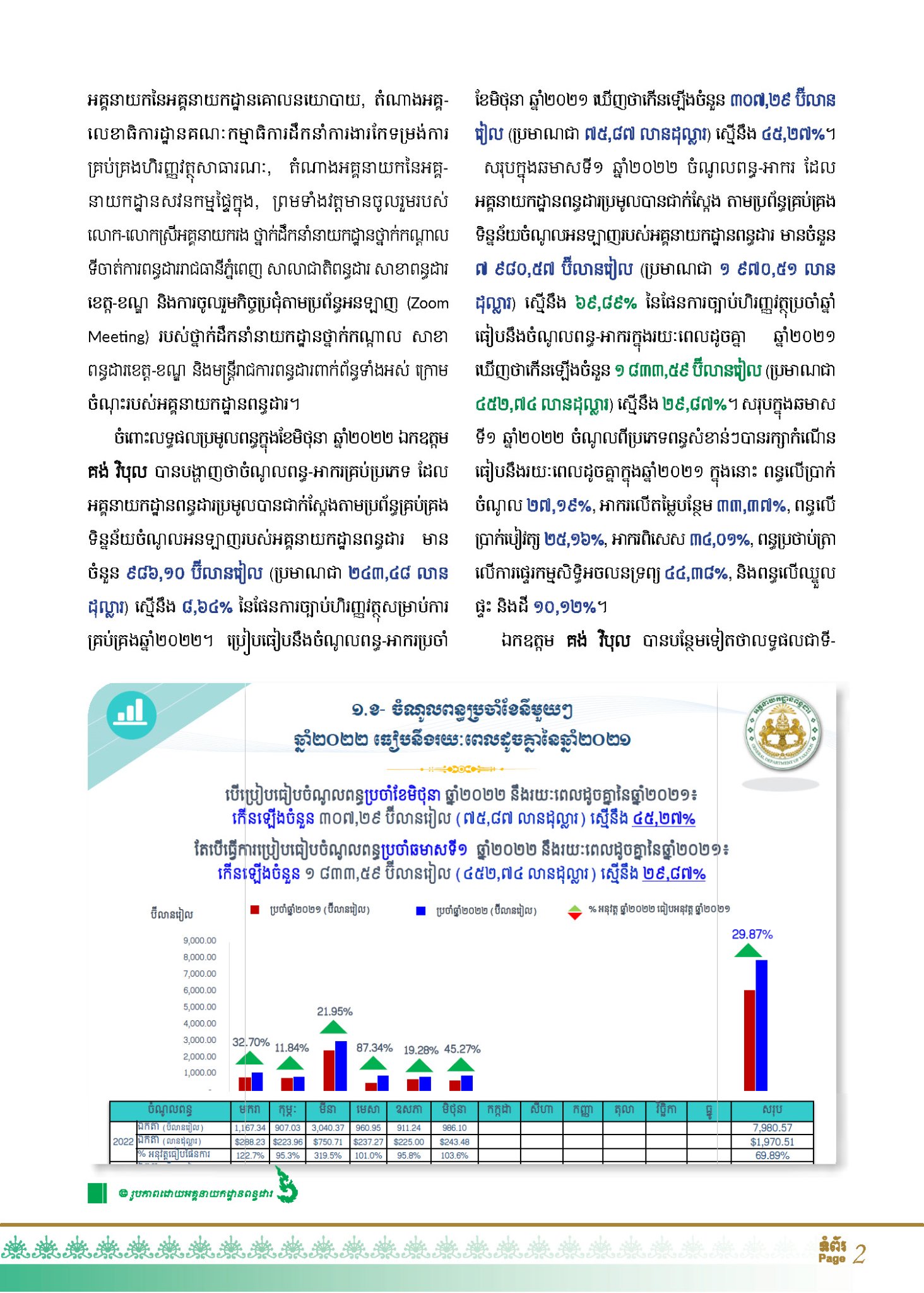 តួលេខនេះត្រូវបានបង្ហាញដោយ ឯកឧត្តម គង់ វិបុល ប្រតិភូរាជរដ្ឋាភិបាលទទួលបន្ទុកជាអគ្គនាយកនៃអគ្គនាយកដ្ឋានពន្ធដារ នៅក្នុងកិច្ចប្រជុំបូកសរុបលទ្ធផលប្រមូលចំណូលពន្ធប្រចាំខែមិថុនា និងប្រចាំឆមាសទី១ នៃឆ្នាំ២០២២ ព្រមទាំងទិសដៅសម្រាប់អនុវត្តបន្ត នៅថ្ងៃទី១៩ ខែកក្កដា ឆ្នាំ២០២២។