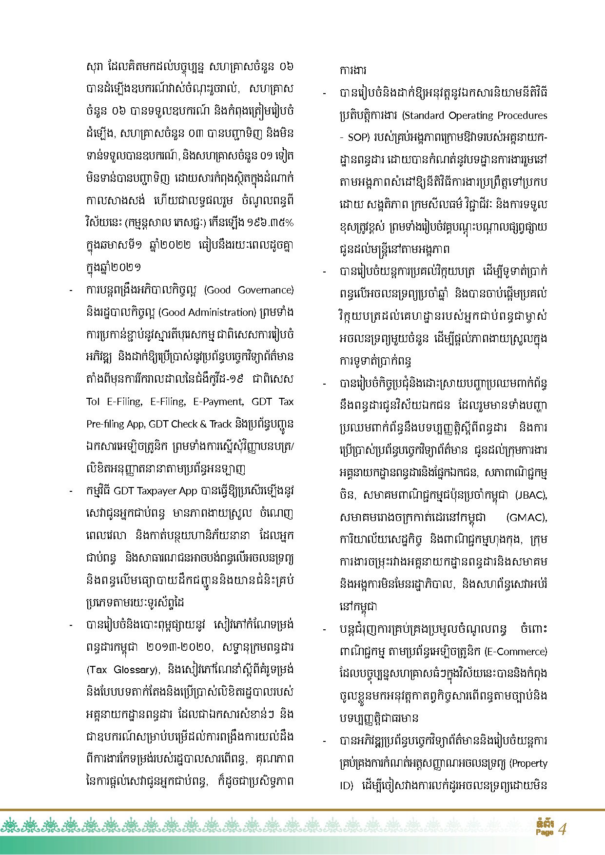 បើតាមអគ្គនាយកដ្ឋានពន្ធដារ សរុបមកក្នុងឆមាសទី១ ឆ្នាំ២០២២ ចំណូលពីប្រភេទពន្ធសំខាន់ៗ បានរក្សាកំណើនធៀបនឹងរយៈពេលដូចគ្នាក្នុងឆ្នាំ២០២១ ក្នុងនោះ ពន្ធលើប្រាក់ចំណូល ២៧.១៩% អាករលើតម្លៃបន្ថែម ៣៣.៣៧% ពន្ធលើប្រាក់បៀវត្ស ២៥.១៦% អាករពិសេស ៣៤.០១% ពន្ធប្រថាប់ត្រាលើការផ្ទេរកម្មសិទ្ធិអចលនទ្រព្យ ៤៤.៣៨%, និងពន្ធលើឈ្នួលផ្ទះ និងដី ១០.១២%៕