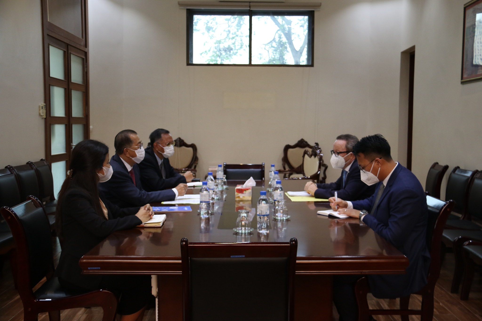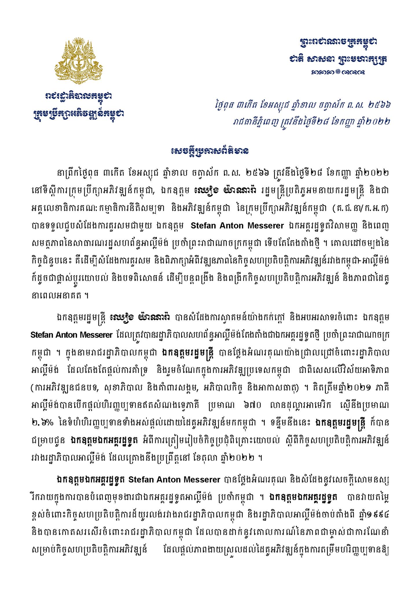 ឯកឧត្តមឯកអគ្គរដ្ឋទូត Stefan Anton Messerer បានសំដែង នូវសេចក្តីសោមនស្ស រីករាយក្នុងការបានបំពេញមុខងារជាឯកអគ្គរដ្ឋទូតអាល្លឺម៉ង់ប្រចាំកម្ពុជា។ ឯកឧត្តមឯកអគ្គរដ្ឋទូត បានវាយតម្លៃខ្ពស់ចំពោះកិច្ចសហប្រតិបត្តិការដ៏យូរលង់រវាងរាជរដ្ឋាភិបាលកម្ពុជា និងរដ្ឋាភិបាលអាល្លឺម៉ង់ចាប់តាំងពី ឆ្នាំ១៩៩៤។ ឯកឧត្តមរដ្ឋមន្រ្តី និង ឯកឧត្តមឯកអគ្គរដ្ឋទូត សង្ឃឹមជឿជាក់ថា ចំណងការទូត និងភាពជា ដៃគូក្នុង កិច្ចសហប្រតិបត្តិការទ្វេភាគី នឹងត្រូវបានបន្តពង្រឹង និងពង្រីកកាន់តែល្អប្រសើរបន្ថែមទៀតនាពេលខាងមុខ។ លើសពីនេះ ភាគីទាំងពីរក៏បានពិភាក្សា និងផ្លាស់ប្ដូរយោបល់លើប្រធានបទពាក់ព័ន្ធ រួមមាន វិស័យមីក្រូហិរញ្ញវត្ថុ ហិរញ្ញប្បទានសម្បទាននិងវឌ្ឍនភាព នៃកិច្ចសហប្រតិបត្តិការអភិវឌ្ឍន៍ រវាងប្រទេស ទាំងពីរផងដែរ៕