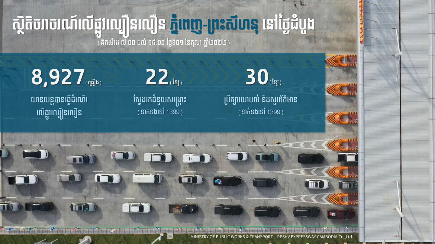 (ភ្នំពេញ)៖ ក្រសួងសាធារណការ និងដឹកជញ្ជូន កាលពីថ្ងៃទី០២ ខែតុលា ឆ្នាំ២០២២ បានបង្ហាញថាបើគិតពីម៉ោង ៧:០០នាទីព្រឹក ដល់ម៉ោង ១៨:០០នាទីល្ងាច ថ្ងៃសៅរ៍ ទី០១ ខែតុលា ឆ្នាំ២០២២នេះ មានយានយន្តចំនួន ៨,៩២៧ គ្រឿង ដែលបាននាំគ្នាធ្វើដំណើរលើផ្លូវល្បឿនលឿន ភ្នំពេញ-ព្រះសីហនុ ដោយចេញចូលតាមស្ថានីយទាំង០៨ទីតាំង។ ក្រសួងបន្តថា មិនត្រឹមតែមានអ្នកដំណើរកម្សាន្តជាលក្ខណៈគ្រួសារ ក្នុងថ្ងៃឈប់សម្រាកចុងសប្តាហ៍ប៉ុណ្ណោះទេ លើសពីនេះទៅទៀត ក៏មានយានយន្តដឹកជញ្ជូនដែលស្របតាមលក្ខណៈបច្ចេកទេស ក៏បានយកឱកាសនេះក្នុងការដឹកជញ្ជូនទំនិញរបស់ខ្លួនផងដែរ ដែលនេះសបញ្ជាក់ឱ្យឃើញថា ផ្លូវល្បឿនលឿន គឺពិតជាខែ្សបន្ទាត់សេដ្ឋកិច្ចដែលមានសក្តានុពលពិតមែន។