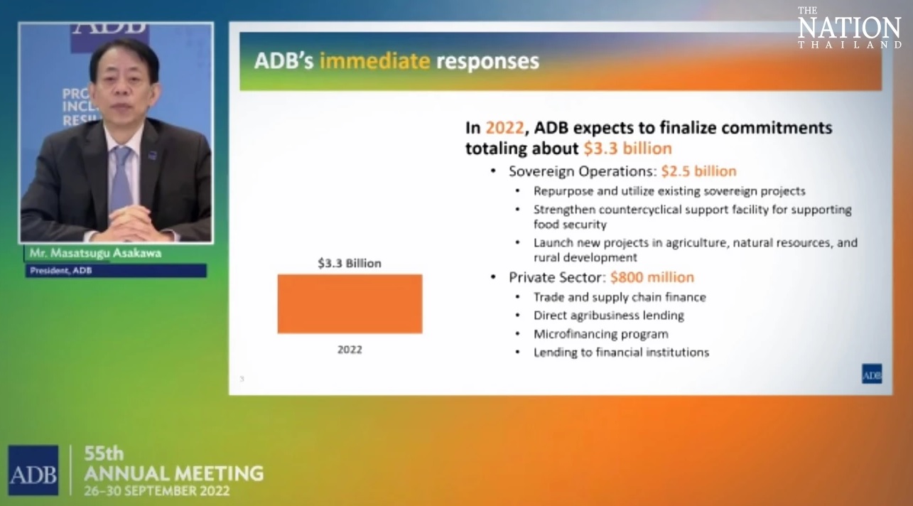 ប្រធាន ADB លោក Masatsugu Asakawa ថ្លែងក្នុងសន្និសីទសារព័ត៌មានតាមអ៊ីនធឺណិតកាលពីថ្ងៃអង្គារថា តំបន់អាស៊ីប៉ាស៊ីហ្វិកឥឡូវនេះកំពុងប្រឈមមុខនឹងបញ្ហាជាច្រើនដូចជាការរឹតបន្តឹងរូបិយវត្ថុ ការធ្លាក់ថ្លៃរូបិយប័ណ្ណ និងអសន្តិសុខស្បៀងយ៉ាងធ្ងន់ធ្ងរ។ បញ្ហាអសន្តិសុខស្បៀង យោងទៅតាមលោក Asakawa គឺជាបញ្ហាដែលគួរឱ្យព្រួយបារម្ភបំផុតនៃបញ្ហាប្រឈមទាំងនេះ ព្រោះវាប៉ះពាល់ដល់ប្រទេសទាំងអស់ទាំង អ្នកមាន និងអ្នកក្រ។ ដូច្នេះ ADB បានសម្រេចចិត្តបង្កើនការផ្តល់ជំនួយរបស់ខ្លួនសម្រាប់សន្តិសុខស្បៀងក្នុងតំបន់ ដែលមនុស្សជិត ១.១ពាន់លាននាក់ខ្វះរបបអាហារ ដោយសារតែភាពក្រីក្រ និងការកើនឡើងតម្លៃស្បៀងនៅឆ្នាំនេះ។