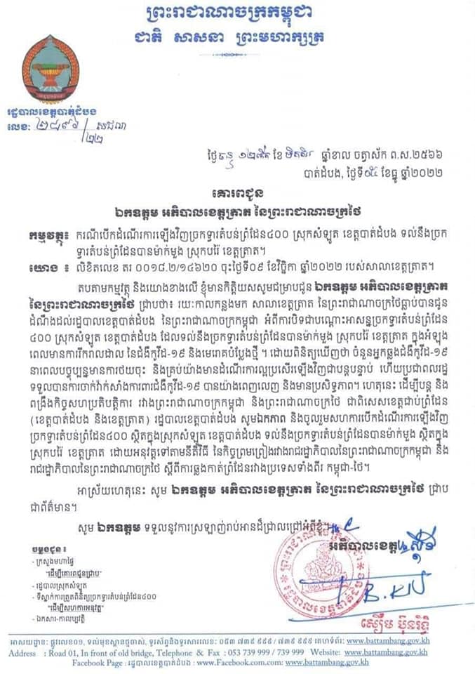 ហេតុនេះ ដើម្បីបន្ត និង ពង្រឹងកិច្ចសហប្រតិបត្តិការ រវាងព្រះរាជាណាចក្រកម្ពុជា និងព្រះរាជាណាចក្រថៃ ជាពិសេសខេត្តជាប់ព្រំដែន (ខេត្តបាត់ដំបង និងខេត្តត្រាត) រដ្ឋបាលខេត្តបាត់ដំបង សូមឯកភាព និងចូលរួមសហការបើកដំណើរការឡើងវិញ ច្រកទ្វារតំបន់ព្រំដែន៤០០ ស្ថិតក្នុងស្រុកសំឡូត ខេត្តបាត់ដំបង ទល់នឹងច្រកទ្វារតំបន់ព្រំដែនបានម៉ាក់មួង ស្ថិតក្នុង ស្រុកបរ៉ែ ខេត្តត្រាត ដោយអនុវត្តទៅតាមនីតិវិធី នៃកិច្ចព្រមព្រៀងរវាងរាជរដ្ឋាភិបាលនៃព្រះរាជាណាចក្រកម្ពុជា និង រាជរដ្ឋាភិបាលនៃព្រះរាជាណាចក្រថៃ ស្តីពីការឆ្លងកាត់ព្រំដែនរវាងប្រទេសទាំងពីរ កម្ពុជា-ថៃ ៕