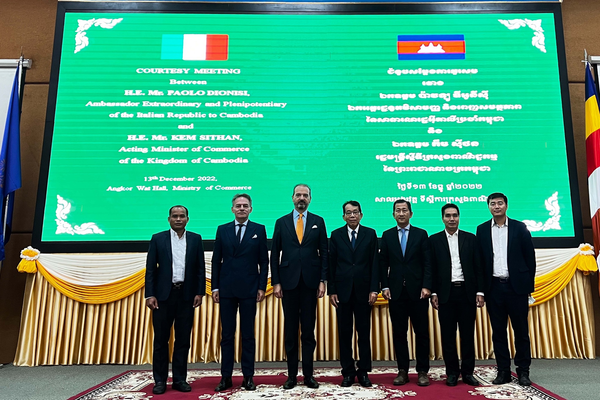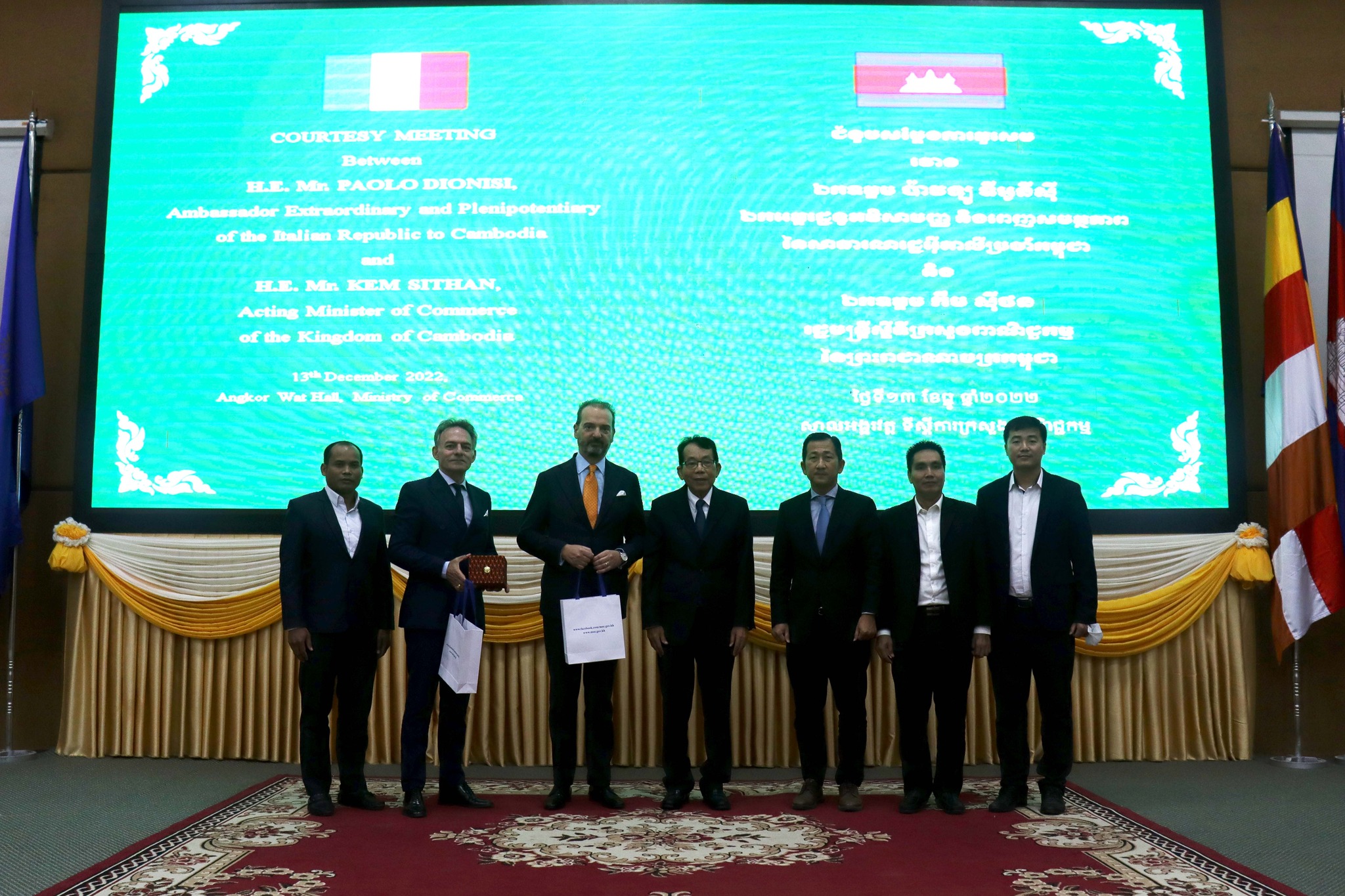 (ភ្នំពេញ)៖ ឯកឧត្តម កឹម ស៊ីថន រដ្ឋមន្ត្រីស្តីទីក្រសួងពាណិជ្ជកម្ម តំណាង ឯកឧត្តម ប៉ាន សូរស័ក្តិ រដ្ឋមន្ត្រីក្រសួងពាណិជ្ជកម្ម កាលពីថ្ងៃទី១៣ ខែធ្នូ ឆ្នាំ២០២២ នៅទីស្តីការក្រសួងពាណិជ្ជកម្ម បានទទួលជួបពិភាក្សាការងារជាមួយឯកឧត្តម PAOLO DIONISI ឯកអគ្គរដ្ឋទូតវិសាមញ្ញនិងពេញសមត្ថភាពនៃសាធារណរដ្ឋអ៊ីតាលីប្រចាំព្រះរាជាណាចក្រកម្ពុជា ដែលទើបតែងតាំងថ្មី និងមាននិវេសនដ្ឋាននៅទីក្រុងបាងកក ដើម្បីពិភាក្សានិងផ្លាស់ប្តូរយោបល់លើការពង្រឹងទំនាក់ទំនង និងកិច្ចសហប្រតិបត្តិការទ្វេភាគីលើវិស័យពាណិជ្ជកម្ម និងសេដ្ឋកិច្ច។