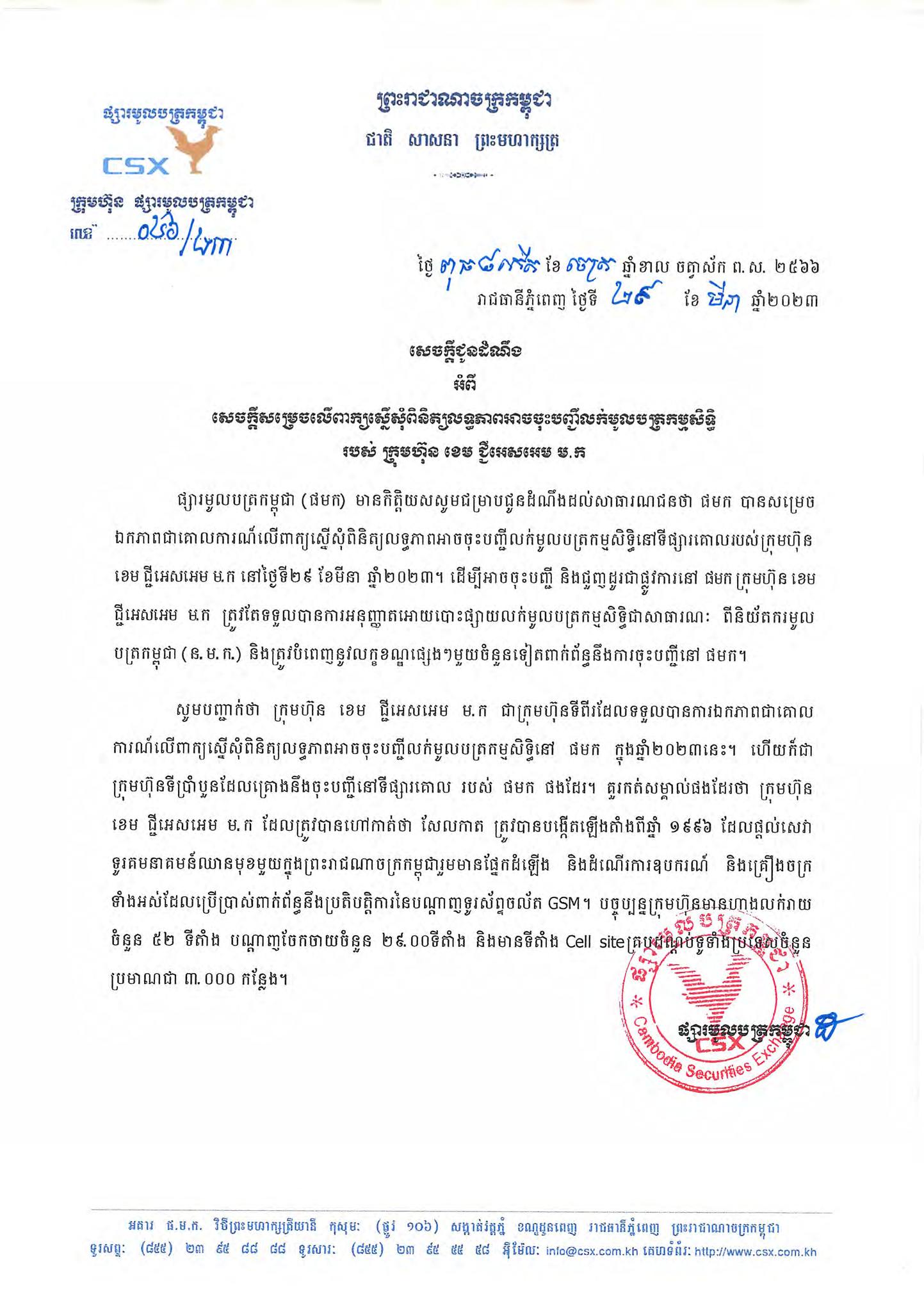 ក្រុមហ៊ុនផ្សារមូលបត្រកម្ពុជា (CSX) នៅថ្ងៃទី២៩ ខែមីនា ឆ្នាំ២០២៣ បានចេញសេចក្តីជូនដំណឹង ស្តីពីសេចក្ដីសម្រេចលើពាក្យស្នើសុំពិនិត្យលទ្ធភាព អាចចុះបញ្ជីលក់មូលបត្រកម្មសិទ្ធិ (ភាគហ៊ុន) របស់ក្រុមហ៊ុន CamGSM PLC ដែលគេស្គាល់ថា ជាក្រុមហ៊ុនទូរគមនាគមន៍ Cellcard របស់អ្នកឧកញ៉ា គិត ម៉េង ដែលជាក្រុមហ៊ុនរបស់ខ្មែរ។