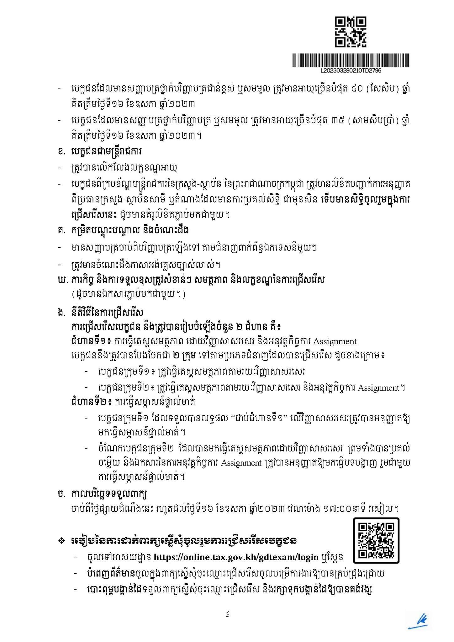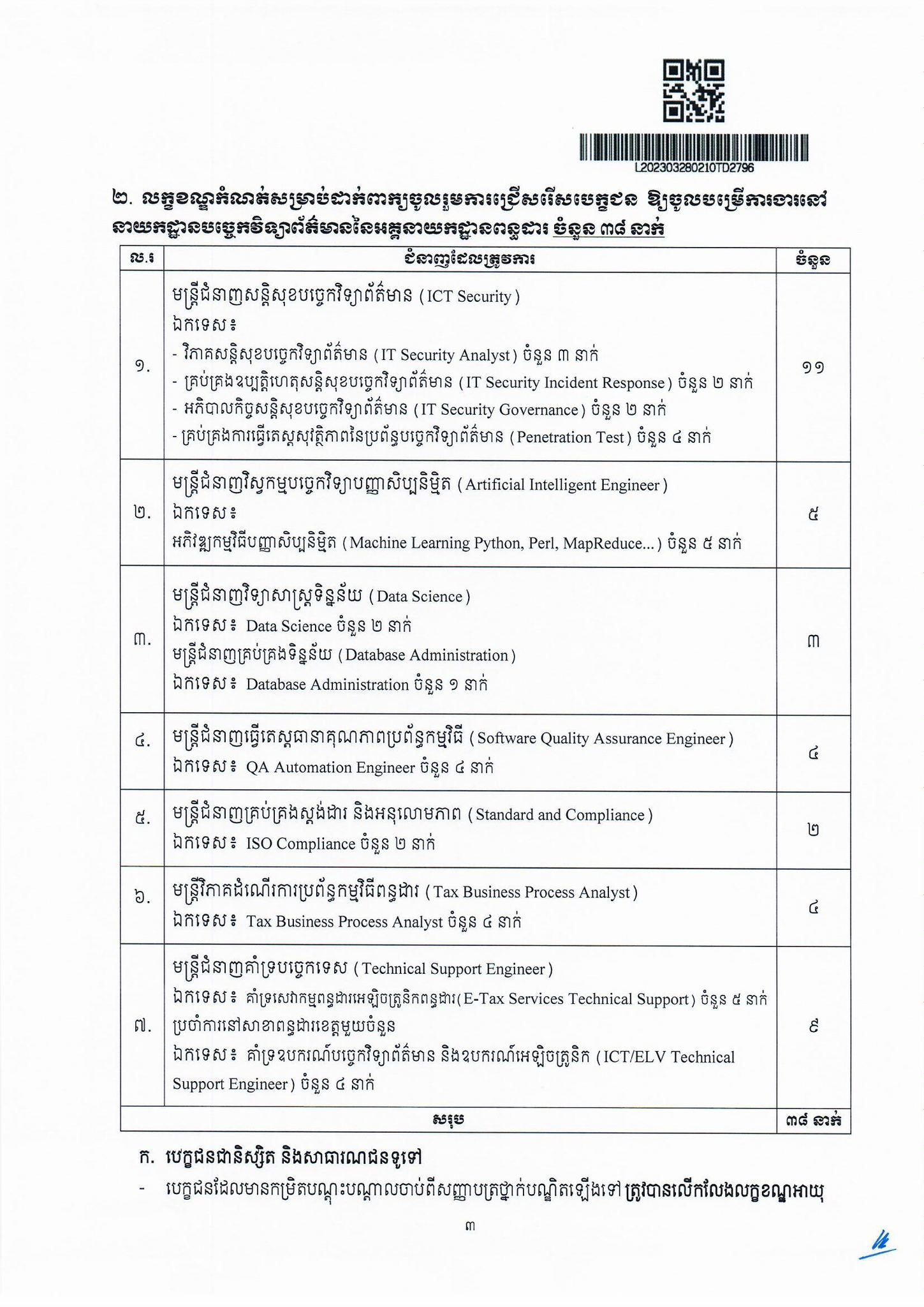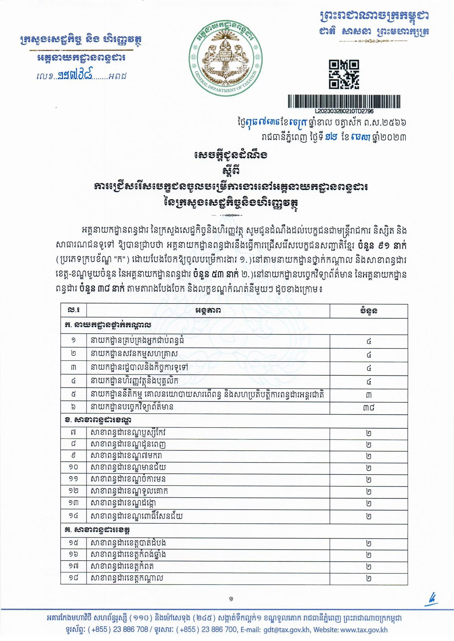 អគ្គនាយកដ្ឋានពន្ធដារនៃក្រសួងសេដ្ឋកិច្ច និងហិរញ្ញវត្ថុ ប្រកាសជ្រើសរើសបេក្ខជនចំនួន ៩១នាក់ ចូលបម្រើការងារក្នុងក្របខ័ណ្ឌ “ក” ដោយឈប់ទទួលពាក្យនៅថ្ងៃទី១៦ ខែឧសភា ឆ្នាំ២០២៣ ខាងមុខនេះ នេះបើយោងតាមសេចក្ដីជូនដំណឹងរបស់ អគ្គនាយកដ្ឋានពន្ធដារ ដែលបានចេញផ្សាយថ្ងៃទី២៥ ខែមេសា ឆ្នាំ២០២៣។