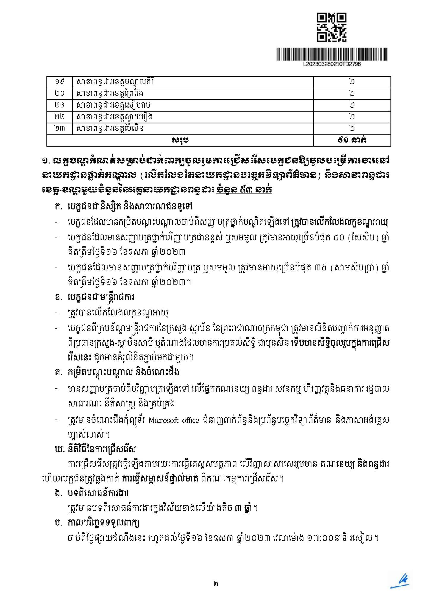 យោងតាមសេចក្ដីជូនដំណឹង បេក្ខជនដែលប្រកាសជ្រើសរើសខាងលើ នឹងត្រូវបានបែងចែកឱ្យចូលបម្រើការងារ នៅតាមនាយកដ្ឋានថ្នាក់កណ្ដាល និងសាខាពន្ធដារខេត្ត- ខណ្ឌមួយចំនួន នៃអគ្គនាយកដ្ឋានពន្ធដារចំនួន ៥៣នាក់ ខណៈចំនួន ៣៨នាក់ទៀត នឹងដាក់ចូលឱ្យបម្រើការងារនៅនាយកដ្ឋានបច្ចេកវិទ្យាព័ត៌មាន នៃអគ្គនាយកដ្ឋាន។
