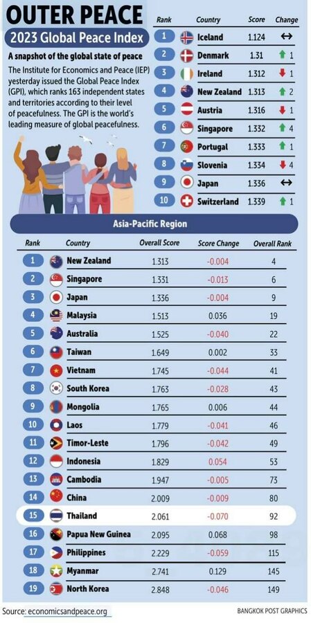 យោងតាមការចុះផ្សាយរបស់ ក្រសួងព័ត៌មាន បានឱ្យដឹងថា ព្រះរាជាណាចក្រកម្ពុជា ឈរនៅលេខរៀងទី១៣ ក្នុងតំបន់អាស៊ីប៉ាស៊ីហ្វិក និងស្ថិតនៅលេខរៀងទី៧៣ ក្នុងចំណោម១៦៣ប្រទេសជុំវិញពិភពលោក ក្នុងនាមជាប្រទេសដែលមានសុខសន្តិភាព។ នេះបើយោងតាមសន្ទស្សន៍សន្តិភាពសកលឆ្នាំ២០២៣ ដែលចេញផ្សាយកាលពីម្សិលមិញដោយវិទ្យាស្ថានសេដ្ឋកិច្ច និងសន្តិភាព (IEP) ដែលមានមូលដ្ឋាននៅទីក្រុងស៊ីដនី ប្រទេសអូស្ត្រាលី។