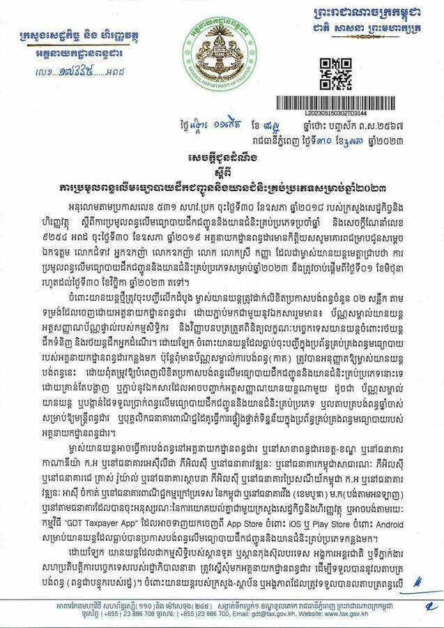 យោងតាមការចុះផ្សាយរបស់ ក្រសួងព័ត៌មាន បានឱ្យដឹងថា អគ្គនាយកដ្ឋានពន្ធដារ បានអំពាវនាវឱ្យប្រជាពលរដ្ឋអញ្ជើញទៅចូលរួមបង់ពន្ធលើមធ្យោបាយដឹកជញ្ជូន និងយានជំនិះគ្រប់ប្រភេទ សម្រាប់ឆ្នាំ២០២៣ ដើម្បីអាចប្រមូលពន្ធជូនរដ្ឋទៅតាមផែនការនយោបាយជាតិក្នុងការប្រមូលពន្ធ។