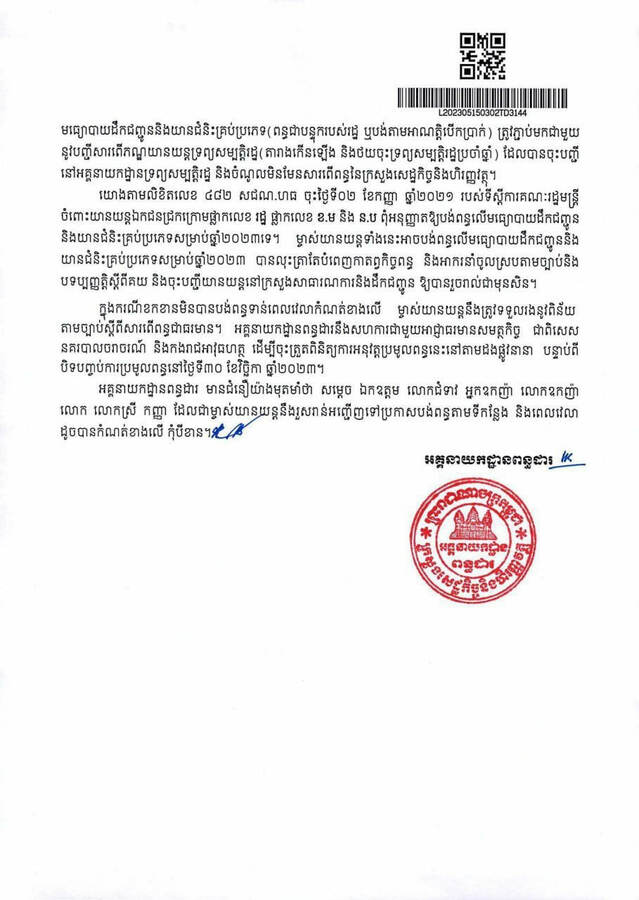 លោក យិន សុធាវី ប្រធានការិយាល័យពន្ធចលនទ្រព្យ នៃអគ្គនាយកដ្ឋានពន្ធដារ ក្រសួងសេដ្ឋកិច្ច និងហិរញ្ញវត្ថុ បានមានប្រសាសន៍ នៅក្នុងកម្មវិធីសន្ទនាមតិ«ជីវិតយើង សង្គមយើង» នៃវិទ្យុជាតិកម្ពុជាឱ្យដឹងថា ការប្រមូលពន្ធលើមធ្យោបាយដឹកជញ្ជូន និងយានជំនិះគ្រប់ប្រភេទ សម្រាប់ឆ្នាំ២០២៣ បានចាប់ផ្តើមពីថ្ងៃទី០១ ខែមិថុនា រហូតដល់ថ្ងៃទី៣០ ខែវិច្ឆិកា ឆ្នាំ២០២៣ តទៅ។ ក្នុងករណីខកខានមិនបានបង់ពន្ធទាន់ពេលវេលាកំណត់ខាងលើ ម្ចាស់យានយន្ត នឹងត្រូវទទួលរងនូវពិន័យ តាមច្បាប់ស្តីពីសារពើពន្ធជាធរមាន។ អគ្គនាយកដ្ឋានពន្ធដារ នឹងសហការជាមួយអាជ្ញាធរមានសមត្ថកិច្ច ជាពិសេស នគរបាលចរាចរណ៍ និងកងរាជអាវុធហត្ថដើម្បីចុះត្រួតពិនិត្យការអនុវត្តន៍ប្រមូលពន្ធនេះ នៅតាមដងផ្លូវនានា បន្ទាប់ពីបិទបញ្ចប់ការប្រមូលពន្ធ នៅថ្ងៃទី៣០ ខែវិច្ឆិកា ឆ្នាំ២០២៣។