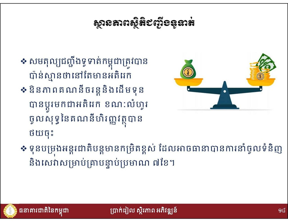 របាយការណ៍នេះ បានបន្តថា កម្រិតខ្ពស់នៃទុនបម្រុងអន្តរជាតិនេះ បង្ហាញពីលទ្ធភាព រក្សាបានស្ថិរភាពអត្រាប្តូរប្រាក់ ទំនុកចិត្តលើរូបិយវត្ថុជាតិ មូលដ្ឋានសម្រាប់ការខ្ចីក្រៅប្រទេស ព្រមទាំងផ្តល់ការការពារគ្រប់គ្រាន់សម្រាប់បំពេញតម្រូវការសន្ទនីយភាពទប់ទល់ នឹង វិបត្តិខាងក្រៅ។បន្ថែមពីនេះ ការវិនិយោគទុនបម្រុងអន្តរជាតិត្រូវបានអនុវត្តដោយមានភាពបត់បែន ហើយហានិភ័យ នសការវិនិយោគត្រូវបានគ្រប់គ្រងនិងតាមដានយ៉ាងហ្មត់ចត់ និងគោរព តាមសេចក្ដីណែនាំការវិនិយោគរបស់ធនាគារជាតិនៃកម្ពុជា ដើម្បីធានាបានការគ្រប់គ្រងទុន បម្រុងអន្តរជាតិប្រកបដោយសុវត្ថិភាព សន្ទនីយភាព និងទទួលបានចំណូលសមស្រប។