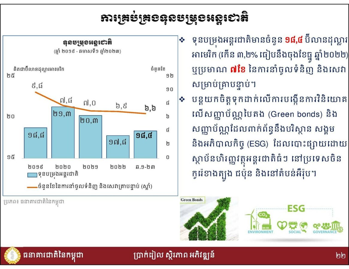 គួរបញ្ជាក់ដែរថា នៅដើមឆ្នាំ២០២៣ នេះ ធនាគារជាតិនៃកម្ពុជា បានធ្វើ បច្ចុប្បន្នកម្មសេចក្ដីណែនាំការវិនិយោគ ដោយបានកែសម្រួលសមាសភាគនៃចំណែក ទុនបម្រុង វិនិយោគ និងរូបិយប័ណ្ណ ដើម្បីឆ្លើយតបនឹងកំណើននៃតម្រូវការសន្ទនីយភាព និងលទ្ធភាពខ្ពស់ក្នុង ការចាប់យកឱកាសពីការប្រែប្រួលនៃអត្រាការប្រាក់នៅលើទីផ្សារ។ ទន្ទឹមនេះ ធនាគារជាតិនៃកម្ពុជាបាន បន្តយកចិត្តទុកដាក់លើការបង្កើនការវិនិ យោគលើសញ្ញាប័ណ្ណបៃតង (Green bonds) និងសញ្ញាប័ណ្ណ ដែលពាក់ព័ន្ធនឹងបរិស្ថាន សង្គម និងអភិបាលកិច្ច(ESG) ដែលបោះផ្សាយដោយស្ថាប័នហិរញ្ញវត្ថុអន្តរជាតិធំៗ នៅប្រទេសចិន កូរ៉េខាងត្បូង ជប៉ុន និងនៅតំបន់អឺរ៉ុប៕