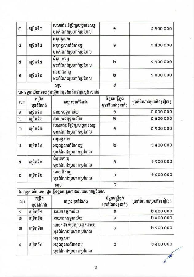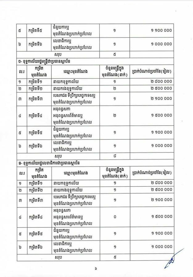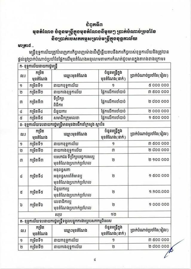 មកដឹងពីប្រាក់បំណាច់ប្រចាំខែរបស់មន្រ្តីខុទ្ទកាល័យ នាយករដ្ឋមន្រ្តី ឧបនាយករដ្ឋមន្រ្តី ទេសរដ្ឋមន្រ្តី រដ្ឋមន្រ្តី និងរដ្ឋលេខាជាប្រធានស្ថាប័ន