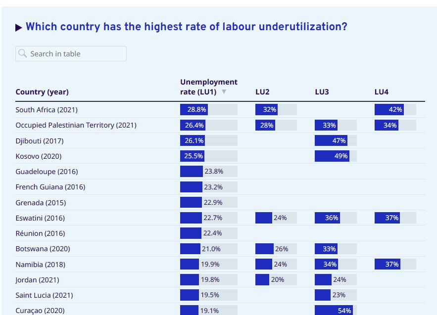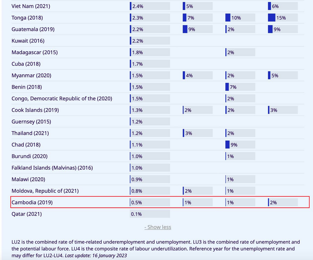 តាមរយៈរបាយការណ៍ដែលអង្គការអន្តរជាតិខាងការងារ ILO បានរកឃើញនេះ គឺធ្វើឡើងនៅក្នុងឆ្នាំ២០១៩ ដោយអង្គការ ILO បានគូសបញ្ជាក់ថា ប្រទេសដែលមានអត្រាការងារធ្វើខ្ពស់ផ្សេងៗទៀត រួមមាន៖ កាតា, ម៉ូលឌូវ៉ា, ម៉ាឡាវី, ប៊ូរួនឌី, ឆាដ, ថៃ, អាល្លឺម៉ង់ ជាដើមសុទ្ធតែជាប្រទេសដែលមានអត្រាអត់ការងារធ្វើតិចតួច។