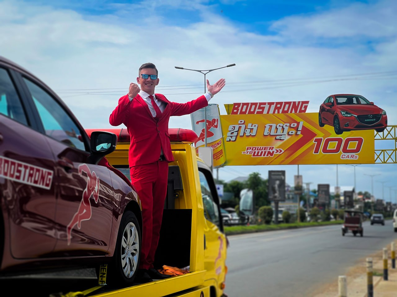 បើយោងតាមការបង្ហោះវីដេអូលើគណនីហ្វេសប៊ុកឈ្មោះ សុខ សាន បានឱ្យដឹងថា មានបងប្រុសពីរនាក់ត្រូវរង្វាន់ឡានខ្លាញ់គោប៊ូសស្រ្តង ១គ្រឿង ដោយម្នាក់ជាអ្នកចេញលុយ ហើយម្នាក់ទៀតជាអ្នកទៅទិញប៊ូសស្រ្តងឱ្យ ២កំប៉ុង ចែកគ្នាញុំា តែចៃដន្យមានមួយកំប៉ុង ត្រូវរង្វាន់ឡាន អមជាមួយនឹងការសរសេររៀបរាប់ថា ខ្ញុំបាទ សុខ សាន្ត និង ឈូក កែម រស់នៅក្រុងប៉ោយប៉ែត សង្កាត់ផ្សារកណ្តាល ខេត្តបន្ទាយមានជ័យ បានត្រូវរង្វាន់ឡាន លេខរៀងទី០៣១ ពីក្រុមហ៊ុនប៊ូសស្រ្តង។ សូមបងប្អូនជួយស៊ែឱ្យក្រុមហ៊ុនបានដឹងផង លេខទូរស័ព្ទ 096 38 63 597។ បន្ថែមពីនេះ បងប្រុស សុខ សាន្ត ក៏បានផ្ញើវីដេអូមកខាងយើងខ្ញុំ ដោយបង្ហាញពីការអុជធូបស្បថ ជាមួយបងប្រុស ឈូក កែម ថានឹងចែកឡានគ្នាស្មើទៀតផង។
