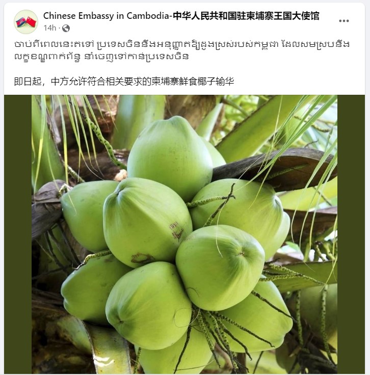 យោងតាមការចុះផ្សាយរបស់ ស្ថានទូតចិនប្រចាំកម្ពុជា កាលពីថ្ងៃទី១៩ ខែកញ្ញា ឆ្នាំ២០២៣ នេះ បានឱ្យដឹងថា ចាប់ពីពេលនេះតទៅ ប្រទេសចិននឹងអនុញ្ញាតឱ្យដូងស្រស់របស់កម្ពុជា ដែលសមស្របនឹងលក្ខខណ្ឌពាក់ព័ន្ធ នាំចេញទៅកាន់ប្រទេសចិន។