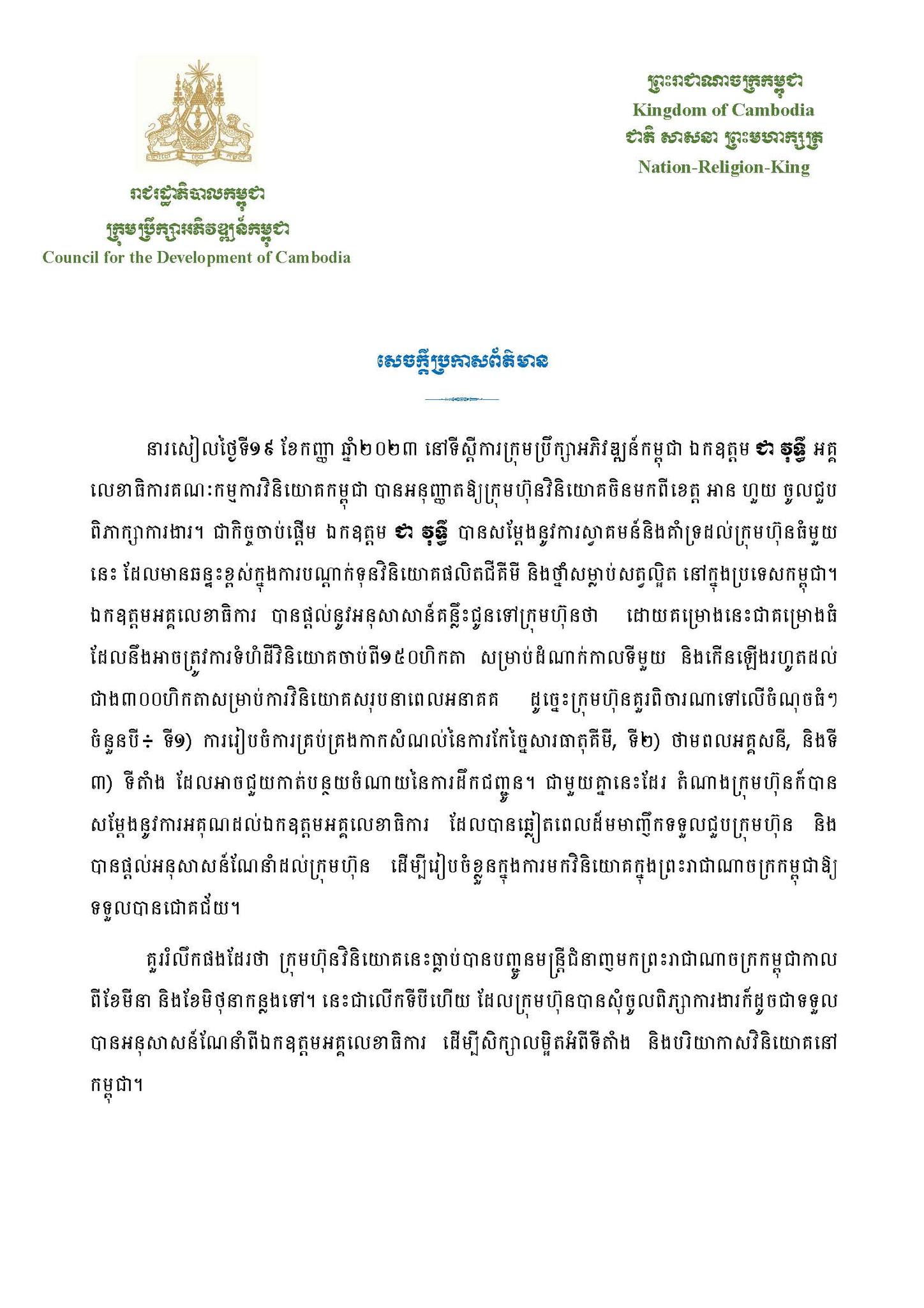 យោងតាមសេចក្ដីប្រកាសព័ត៌មាន បានឱ្យដឹងថា នារសៀលថ្ងៃទី១៩ ខែកញ្ញា ឆ្នាំ២០២៣ នៅទីស្តីការក្រុមប្រឹក្សាអភិវឌ្ឍន៏កម្ពុជា ឯកឧត្តម ជា វុទ្ធី អគ្គ លេខាធិការគណៈកម្មការវិនិយោគកម្ពុជា បានអនុញ្ញាតឱ្យក្រុមហ៊ុនវិនិយោគចិនមកពីខេត្ត អាន ហួយ ចូលជួប ពិភាក្សាការងារ។ ជាកិច្ចចាប់ផ្តើម ឯកឧត្តម ជា វុទ្ធី បានសម្ដែងនូវការស្វាគមន៍និងគាំទ្រដល់ក្រុមហ៊ុនមួយ នេះ ដែលមានឆន្ទះខ្ពស់ក្នុងការបណ្ដាក់ទុនវិនិយោគផលិតជីគីមី និងថ្នាំសម្លាប់សត្វល្អិត នៅក្នុងប្រទេសកម្ពុជា។