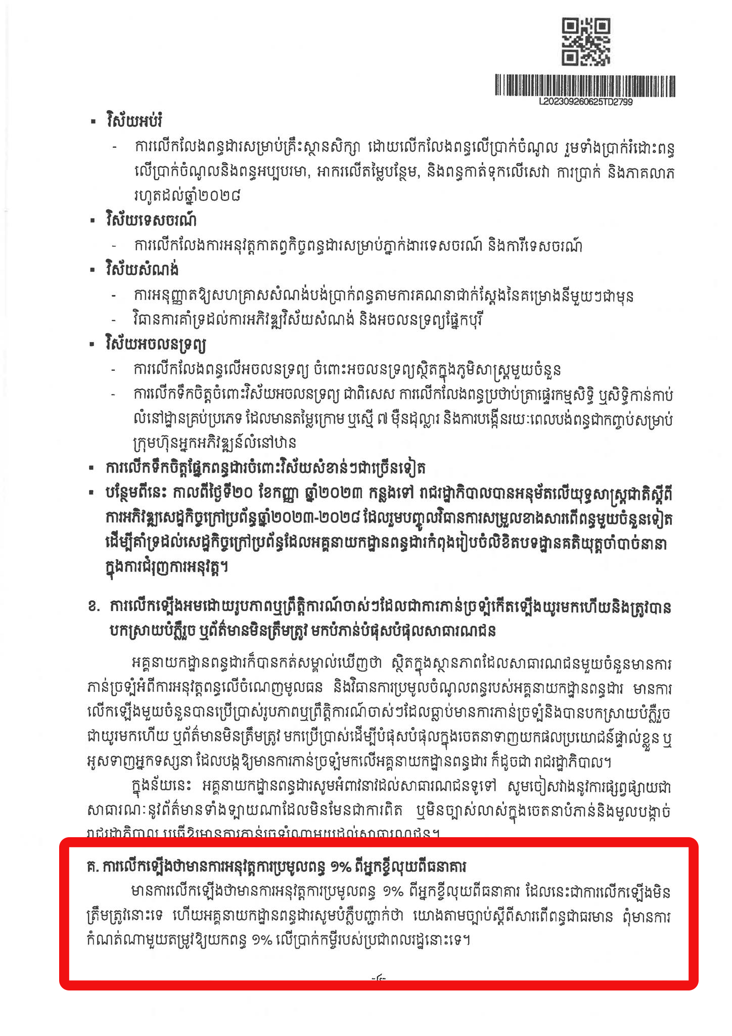 អគ្គនាយកដ្ឋានពន្ធដារ បានច្រានចោល ការលើកឡើងថា មានការអនុវត្តការប្រមូលពន្ធ ១% ពីអ្នកខ្ចីលុយពីធនាគារ នេះបើយោងតាមសេចក្ដីបំភ្លឺរបស់ អគ្គនាយកដ្ឋានពន្ធដារ ដែលបានចុះផ្សាយនៅថ្ងៃទី២៧ ខែកញ្ញា ឆ្នាំ២០២៣ នេះ។