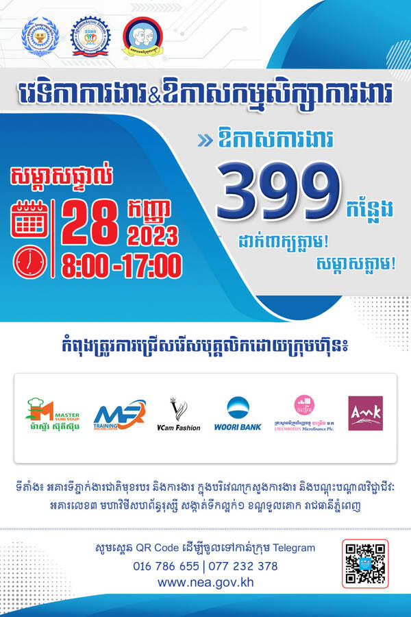 យោងតាមការចុះផ្សាយរបស់ ក្រសួងព័ត៌មាន បានឱ្យដឹងថា ក្រុមហ៊ុនធំៗចំនួន ៦ នឹងផ្តល់ឱកាសការងារថ្មីបន្ថែមទៀតសរុបចំនួន ៣៩៩ កន្លែង សម្រាប់យុវជនសិស្ស/និស្សិត និងអ្នកកំពុងស្វែងរកការងារធ្វើក្នុងវេទិកាការងារប្រចាំខែរបស់ទីភ្នាក់ងារជាតិមុខរបរ និងការងារ (NEA) នៃក្រសួងការងារ និងបណ្តុះបណ្តាលវិជ្ជាជីវៈ។ យុវជន សិស្ស/និស្សិត និងអ្នកកំពុងតែស្វែងរកការងារធ្វើ ឬចង់ផ្លាស់ប្តូរការងារអាចយកប្រវត្តិរូបសង្ខេប (CV) ដើម្បីចូលរួមដាក់ពាក្យ និងសម្ភាសផ្ទាល់ជាមួយតំណាងក្រុមហ៊ុនទាំងនោះបាន ចាប់ពីម៉ោង ៨:០០ព្រឹក ដល់ម៉ោង ០៥:០០ល្ងាច នៅអគារ NEA ស្ថិតក្នុងបរិវេណក្រសួងការងារ និងបណ្តុះបណ្តាលវិជ្ជាជីវៈ នាថ្ងៃព្រហស្បតិ៍ ទី២៨ ខែកញ្ញា ឆ្នាំ២០២៣ ស្អែកនេះ។
