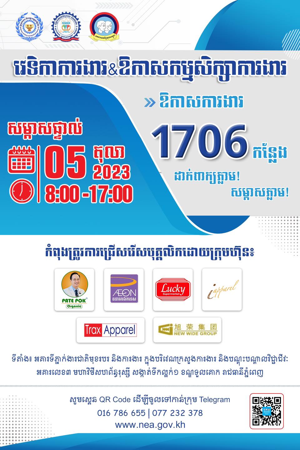 ក្រុមហ៊ុន រោងចក្រ សហគ្រាសធំៗ ៦ បន្តសហការជាមួយ NEA ដោយនាំយកឱកាសការងារថ្មីបន្ថែមចំនួន ១៧០៦កន្លែង សម្រាប់យុវជន សិស្ស/និស្សិត និងអ្នកស្វែងរកការងារ នៅក្នុងវេទិកាការងារ នាថ្ងៃព្រហស្បតិ៍ ទី០៥ ខែតុលា នេះ ចាប់ពីម៉ោង ៨ ព្រឹក ដល់ ៥ ល្ងាច ដាក់ពាក្យភ្លាម បានសម្ភាសភ្លាមៗ! អត់បទពិសោធន៍ ក៏អាចដាក់ពាក្យបានដែរ។