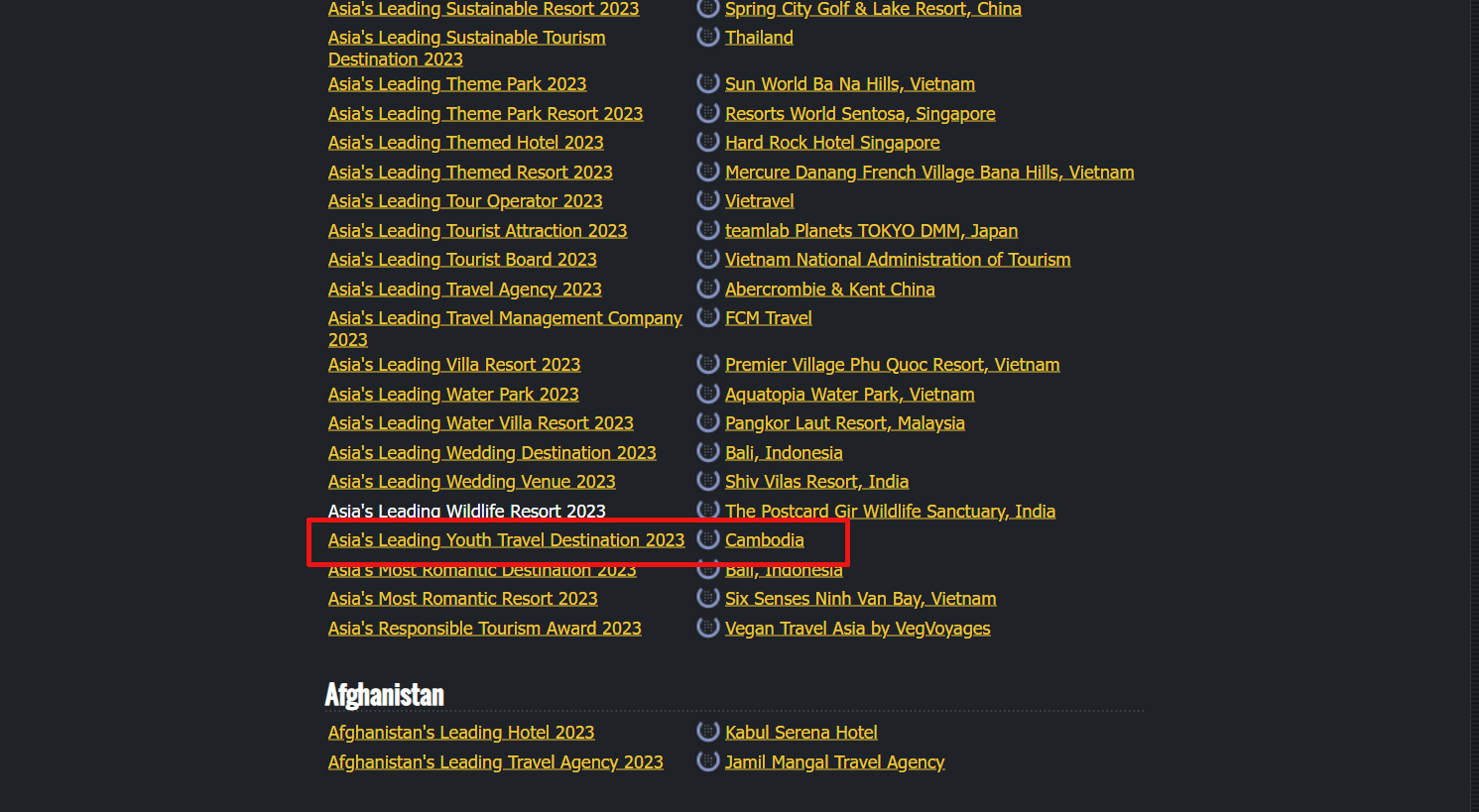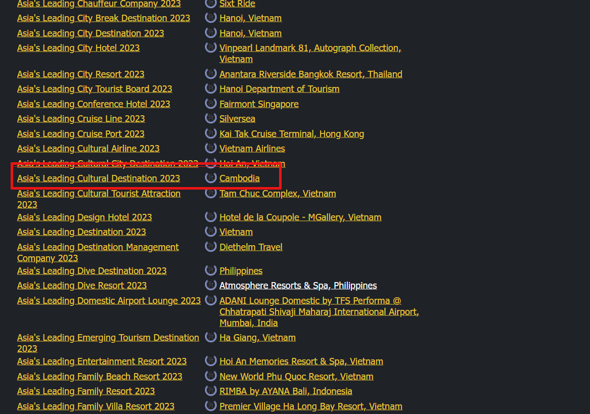 យោងតាមការចុះផ្សាយរបស់គេហទំព័រ World Travel Awards ជ័យលាភី ចំនួន ២ ខាងលើនេះរួមមាន៖ ១. កម្ពុជា ជាគោលដៅទេសចរណ៍វប្បធម៌ឈានមុខគេនៅតំបន់អាស៊ី (Asia’s Leading Cultural Destination) និង ២. កម្ពុជា ជាគោលដៅទេសចរណ៍យុវជនឈានមុខគេនៅតំបន់អាស៊ី (Asia’s Leading Youth Travel Destination)៕