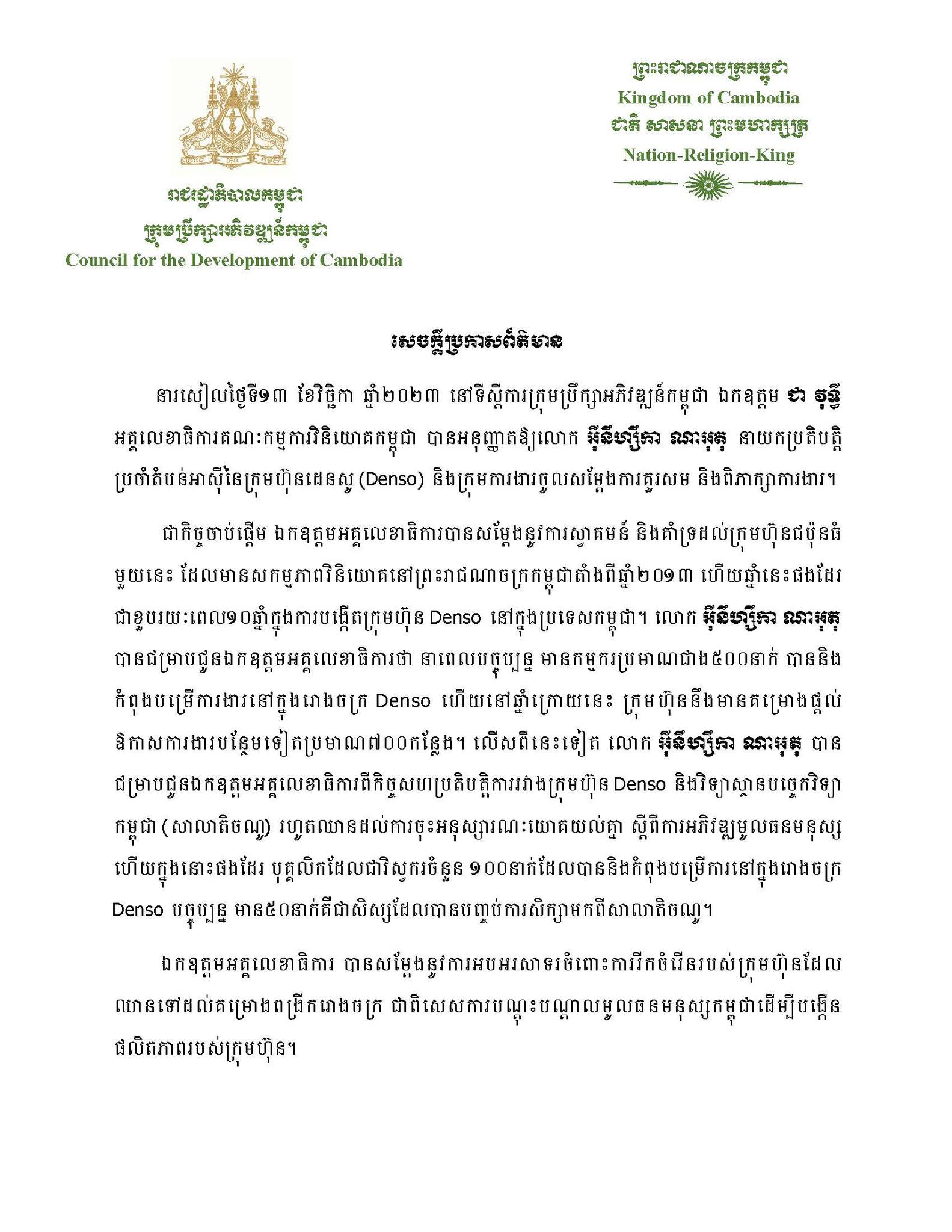 សេចក្ដីប្រកាសព័ត៌មានខាងលើ បានឱ្យដឹងថា កាលពីរសៀលថ្ងៃទី១៣ ខែវិច្ឆិកា ឆ្នាំ២០២៣ ឯកឧត្តម ជា ចុន្ទី អគ្គលេខាធិការគណះកម្មការវិនិយោគកម្ពុជា បានអនុញ្ញាតឱ្យលោក ម៉ីនីហ្ស៊ីកា ណាអូតូ នាយកប្រតិបត្តិ ប្រចាំតំបន់អាស៊ីនៃក្រុមហ៊ុនដេនស្ទ (Denso) និងក្រុមការងារចូលសម្តែងការគួរសម និងពិភាក្សាការងារ។