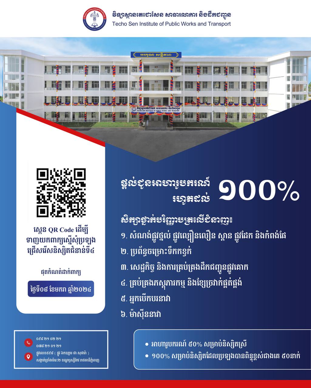 បញ្ជាក់៖ កាលបរិច្ឆេទបើកទទួលពាក្យប្រឡង ចាប់ពីថ្ងៃទី៣០ ខែវិច្ឆិកា ឆ្នាំ២០២៣ វេលាម៉ោង ៨:០០នាទីព្រឹកតទៅ នៅការិយាល័យសិក្សា នៃវិទ្យាស្ថានតេជោសែន សាធារណការ និងដឹកជញ្ជូន។