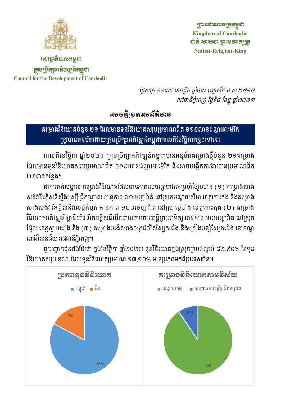 កាលពីខែវិច្ឆិកា ឆ្នាំ២០២៣ កន្លងទៅនេះ ក្រុមប្រឹក្សាអភិវឌ្ឍន៍កម្ពុជាបានអុនម័តគម្រោងថ្មីចំនួន ២១ ដែលមានទុនវិនិយោគសរុបប្រមាណជិត ៦១៩លានដុល្លារអាម៉េរិក និងអាចបង្កើតការងារបានប្រមាណជិត ២២ពាន់កន្លែង។ នេះបើយោងតាមសេចក្ដីប្រកាសព័ត៌មានរបស់ក្រុមប្រឹក្សាអភិវឌ្ឍន៍កម្ពុជានៅថ្ងៃទី០៨ ខែធ្នូ ឆ្នាំ២០២៣ នេះ។