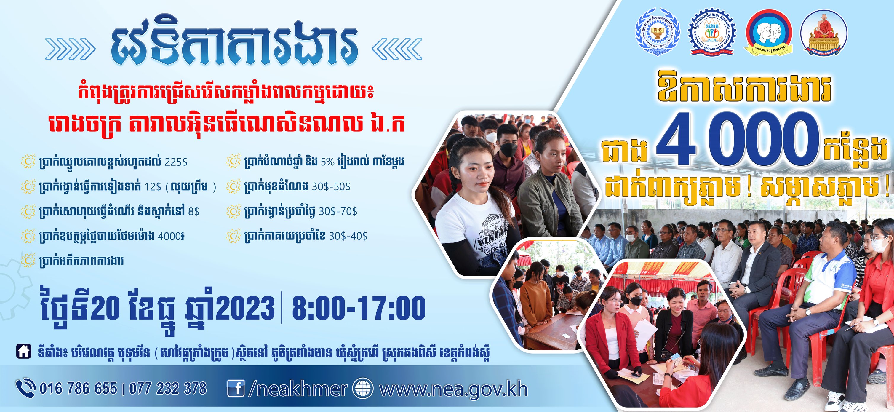 សម្រាប់បងប្អូនប្រជាពលរដ្ឋ ដែលកំពុងស្វែងរកការងារ ឬចង់ផ្លាស់ប្តូរការងារនៅគ្រប់រាជធានី-ខេត្តទូទាំងប្រទេស ឬចង់ចុះឈ្មោះសិក្សាជំនាញវិជ្ជាជីវៈ និងបច្ចេកទេស សូមទាក់ទងមកកាន់ NEA តាមរយៈលេខ ០១២ ៩០៦ ៦៦៤ / ០១៦៧៨៦៦៥៥ (Telegram) ឬ គេហទំព័រ www.nea.gov.kh និងទំព័រ Facebook (neakhmer)៕