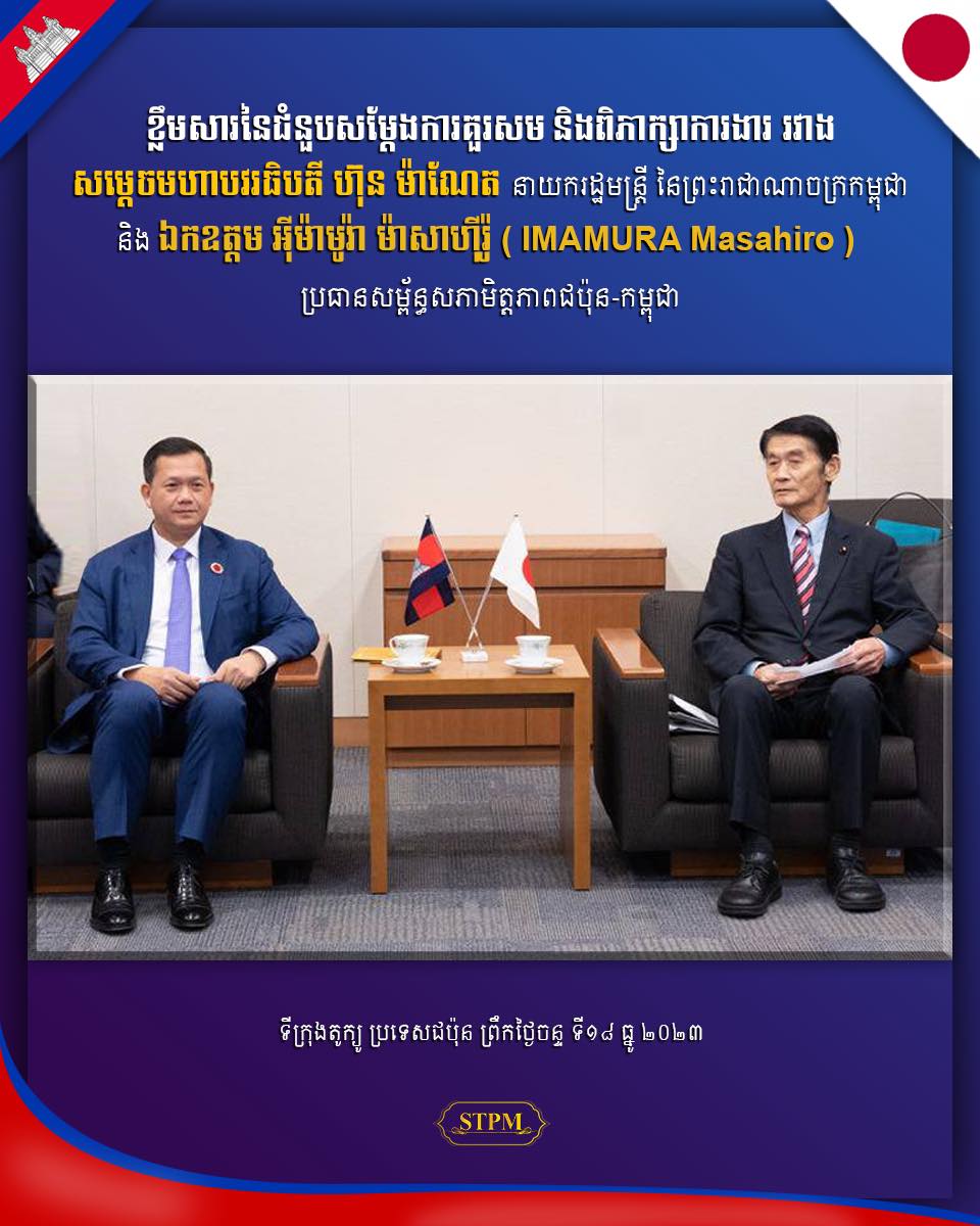 (ទីក្រុងតូក្យូ)៖ នាព្រឹកថ្ងៃទី១៨ ខែធ្នូ ឆ្នាំ២០២៣ សម្តេចមហាបវរធិបតី ហ៊ុន ម៉ាណែត នាយករដ្ឋមន្រ្តី នៃព្រះរាជាណាចក្រកម្ពុជា បានអនុញ្ញាតឱ្យ ឯកឧត្តម អ៉ីម៉ាមូរ៉ា ម៉ាសាហ៊ីរ៉ូ (IMAMURA Masahiro) ប្រធានសម្ព័ន្ធសភាមិត្តភាពជប៉ុន-កម្ពុជា ចូលជួបសម្តែងការគួរសម និងពិភាក្សាការងារ ក្នុងឱកាសនៃការចូលរួមកិច្ចប្រជុំកំពូលរំឭកខួបអនុស្សាវរីយ៍អាស៊ាន-ជប៉ុន លើកទី៥០ ចាប់ពីថ្ងៃទី១៥-១៩ ខែធ្នូ ឆ្នាំ២០២៣ នៅទីក្រុងតូក្យូ ប្រទេសជប៉ុន ។