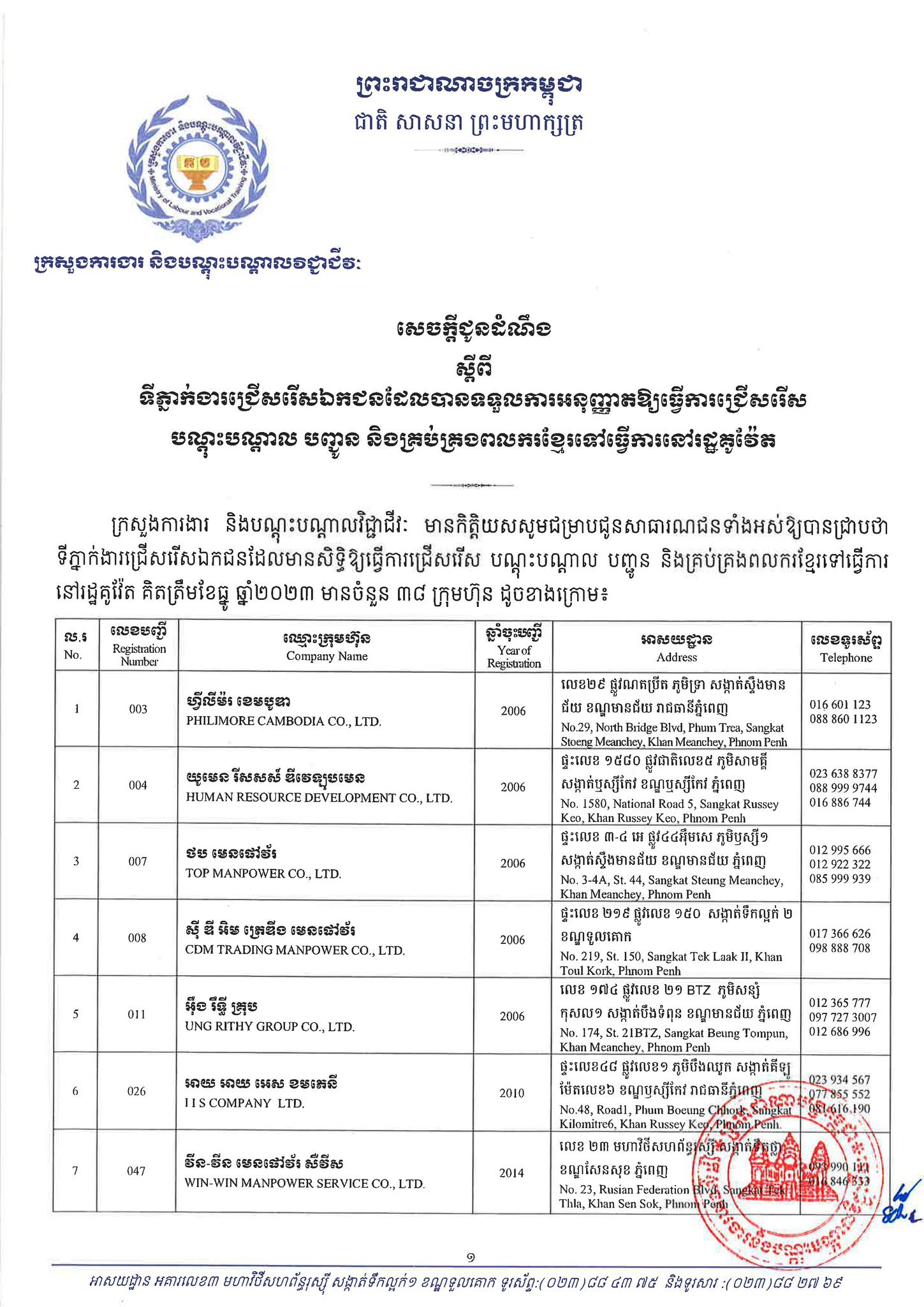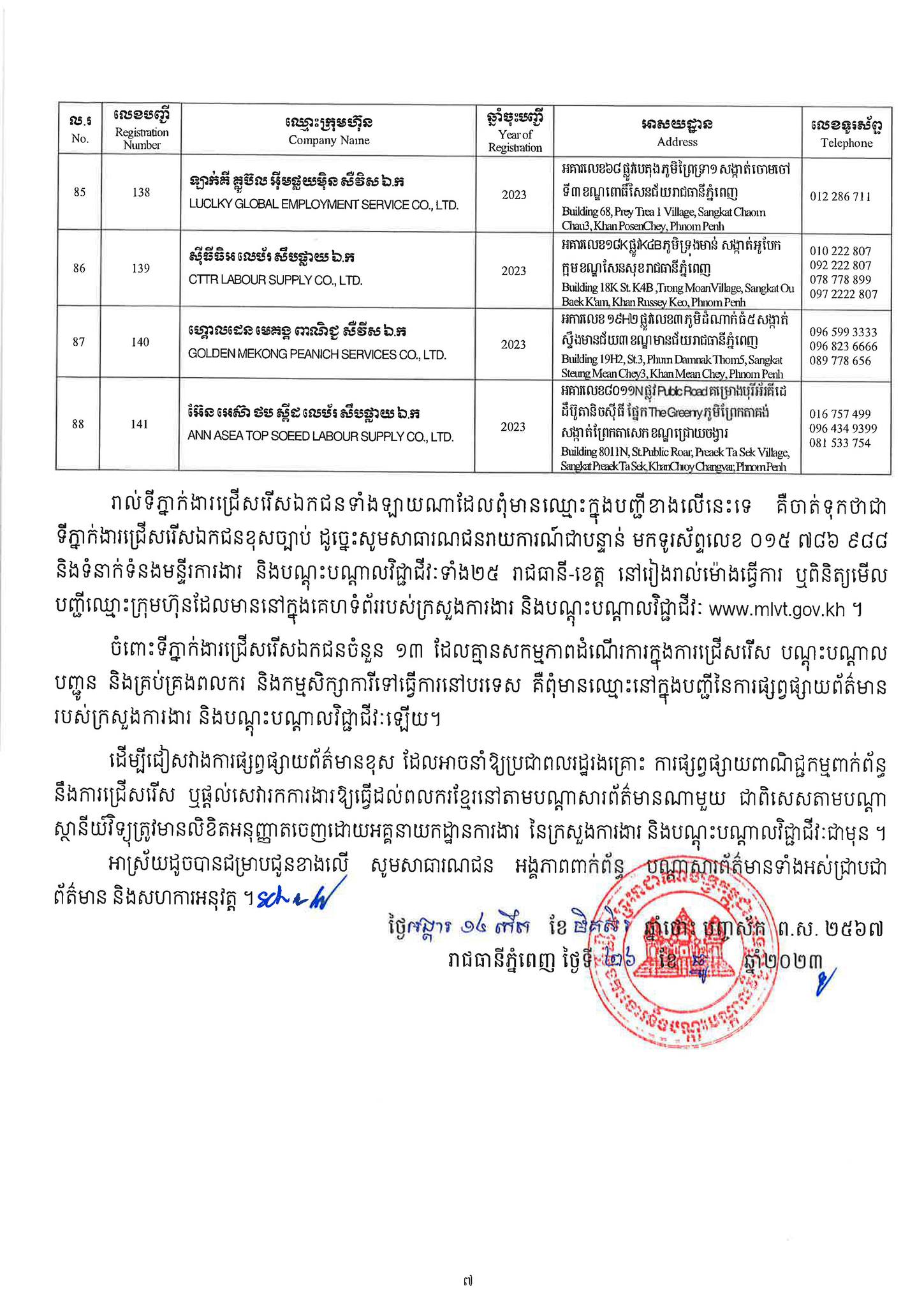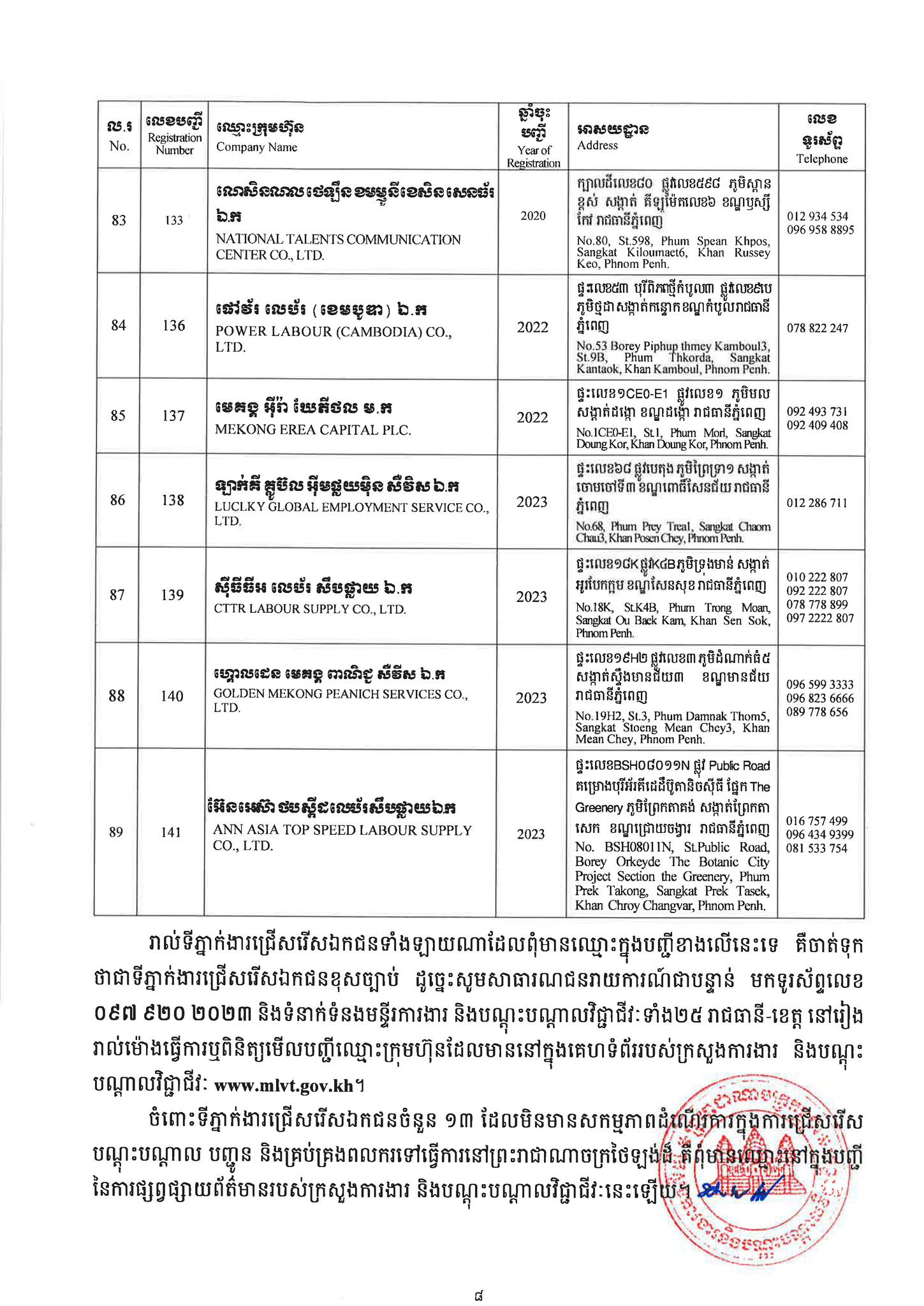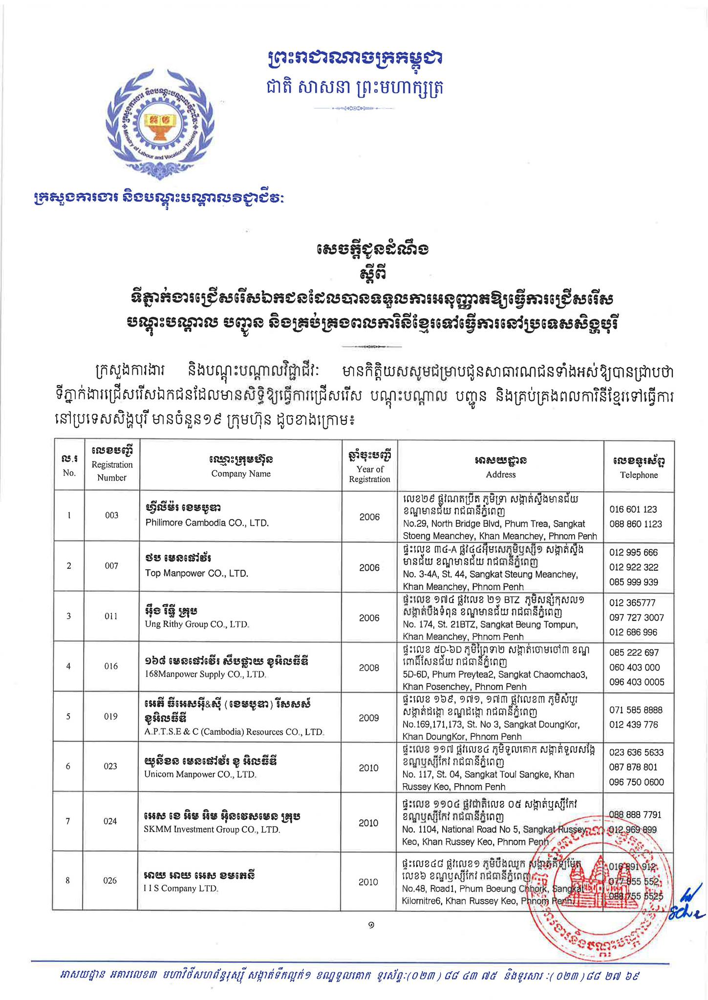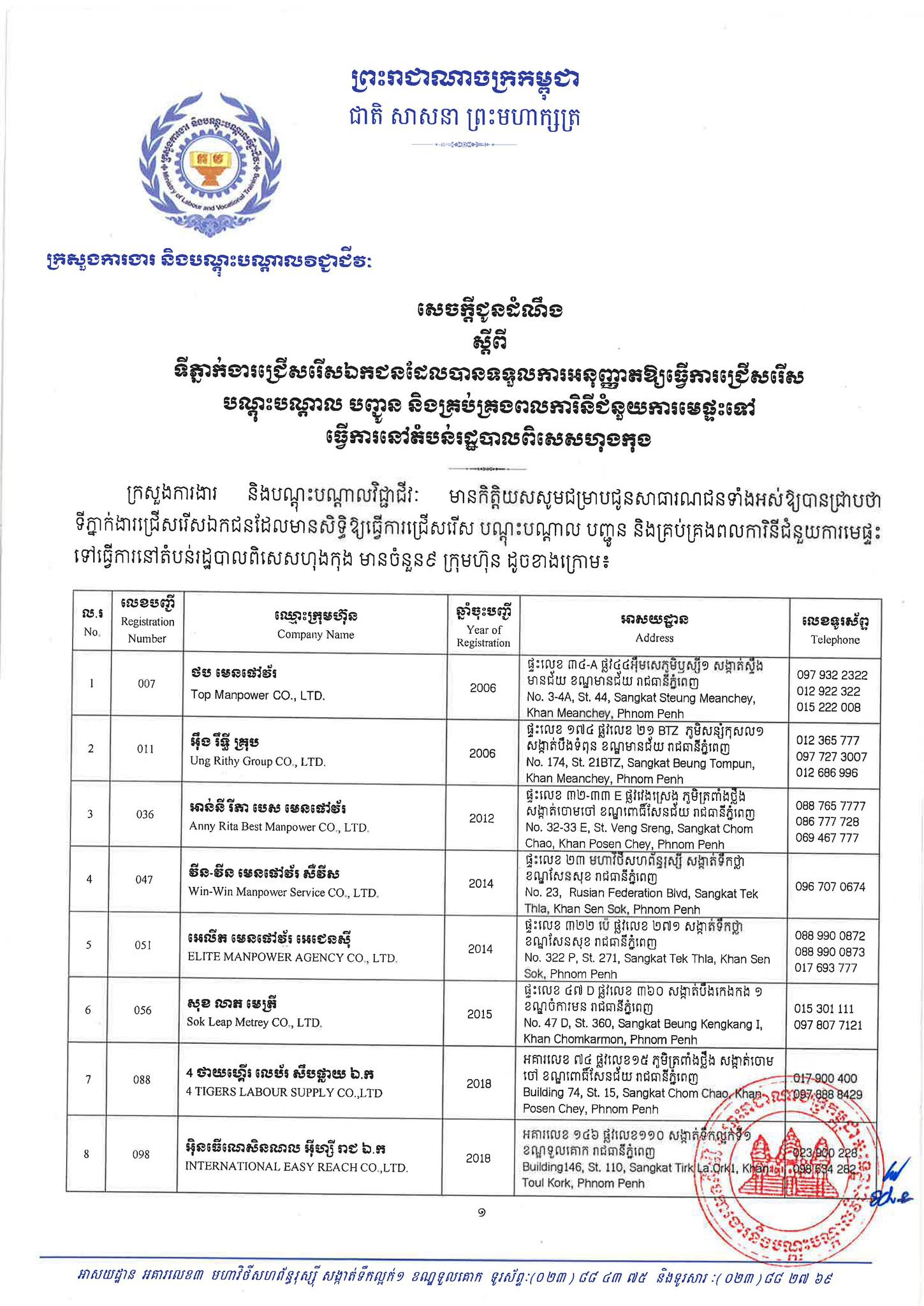 ជាមួយគ្នានេះដែរ ក្រសួងការងារក៏បានបញ្ជាក់ផងដែរថា រាល់ទីភ្នាក់ងារជ្រើសរើសឯកជនទាំងឡាយណាដែលពុំមានឈ្នោះក្នុងបញ្ជីខាងក្រោមនេះ គឺចាត់ទុកថាជាទីភ្នាក់ងារជ្រើសរើសឯកជនខុសច្បាប់ ដូច្នេះសូមសាធារណជនរាយការណ៍ជាបន្ទាន់ មកទូរស័ព្ទលេខ 089 957 789 និងទំនាក់ទំនងមន្ទីរការងារ និងបណ្តុះបណ្តាលវិជ្ជាជីវៈទាំង២៥ រាជធានី-ខេត្ត នៅរៀងរាល់ម៉ោងធ្វើការ ឬពិនិត្យមើលបញ្ជីឈ្មោះក្រុមហ៊ុនដែលមាននៅក្នុងគេហទំព័ររបស់ក្រសួងការងារនិងបណ្តុះបណ្តាលវិជ្ជាជីវៈ www.mlvt.gov.kh ។ សូមពិនិត្យបញ្ជីទីភ្នាក់ងារជ្រើសរើសឯកជនលម្អិតនៅខាងក្រោម៖
