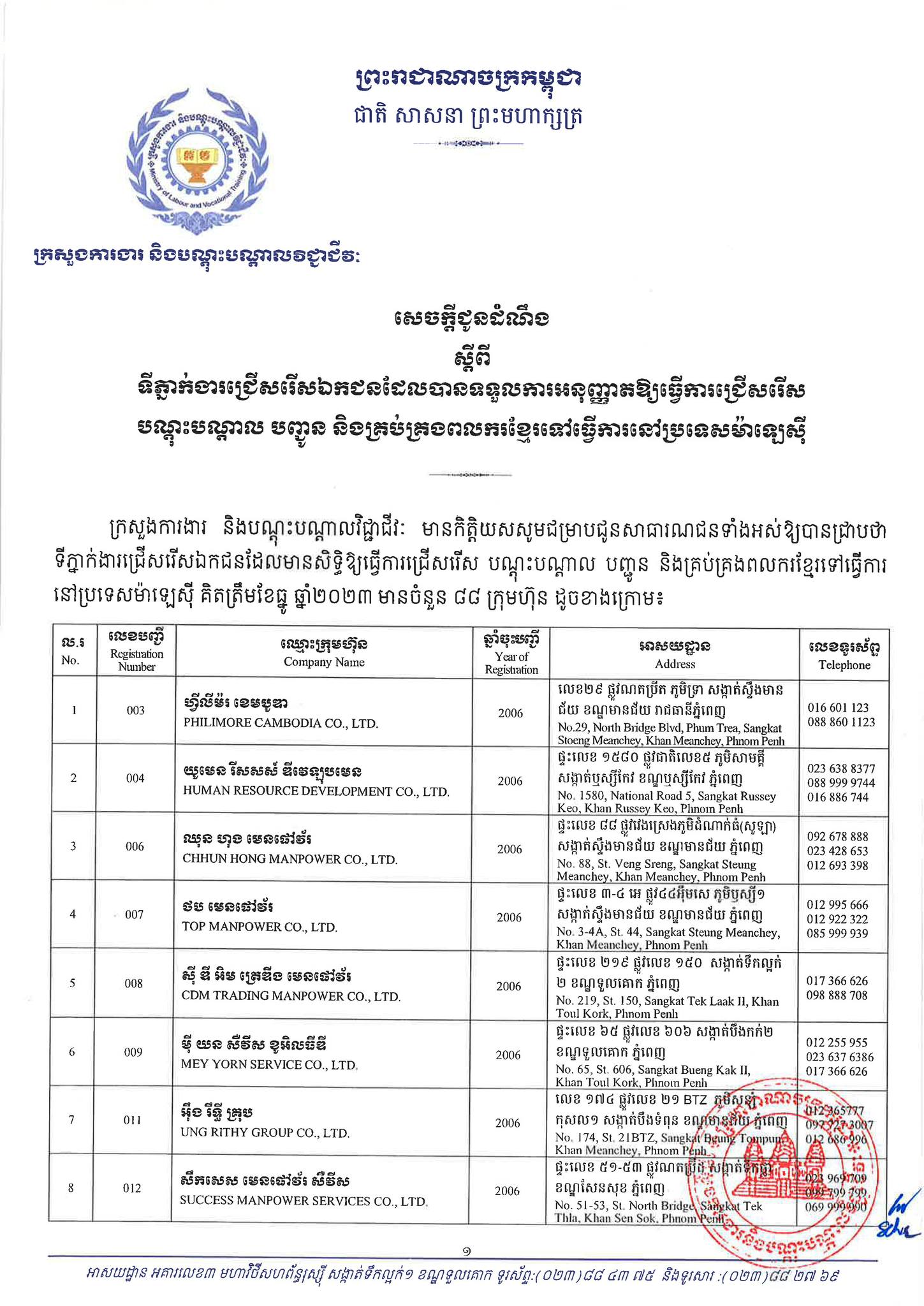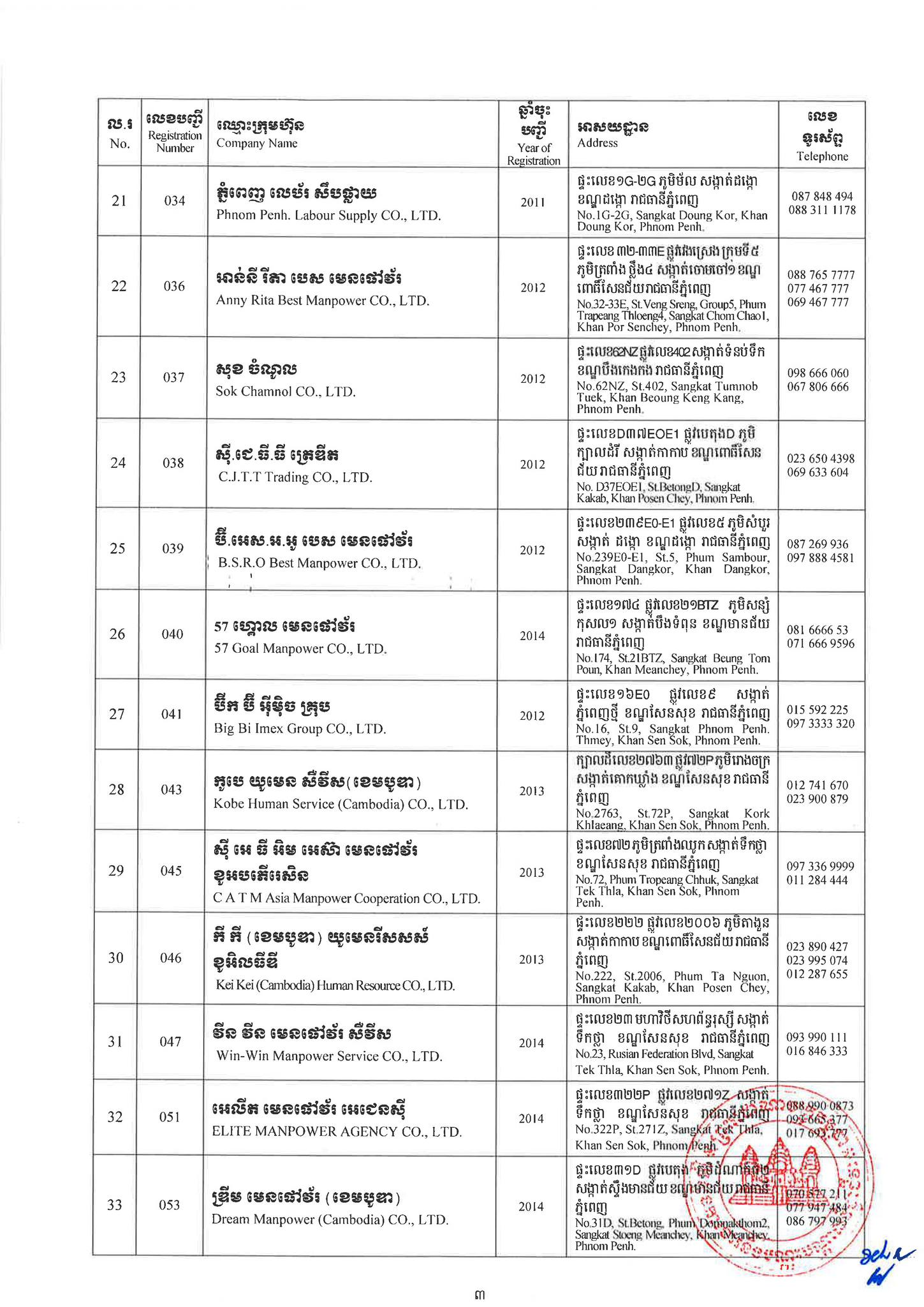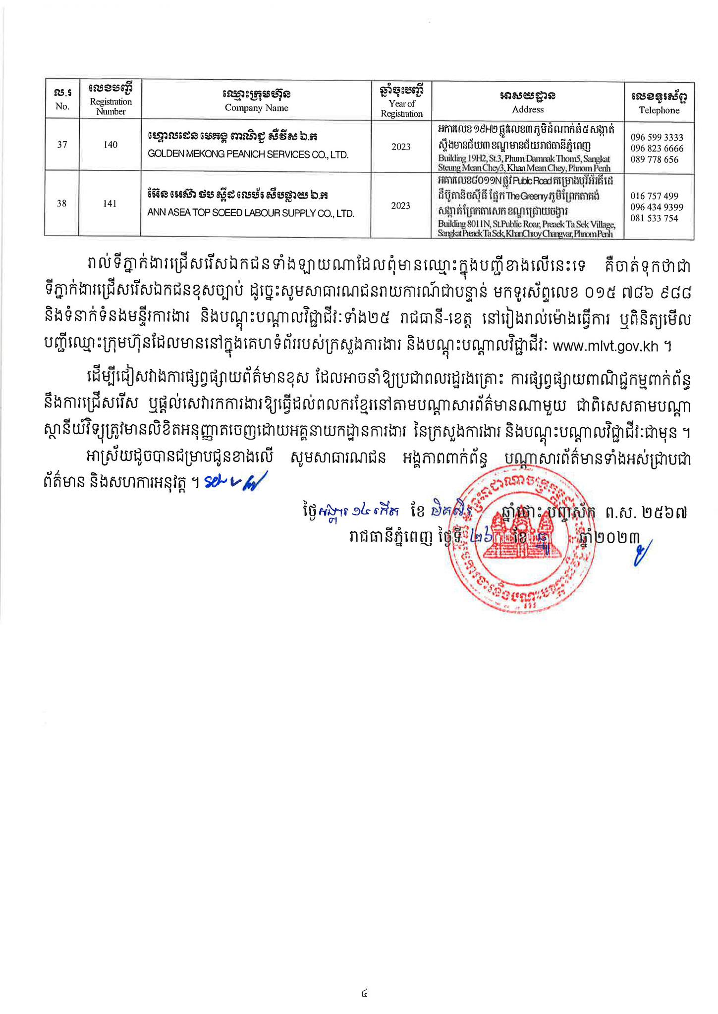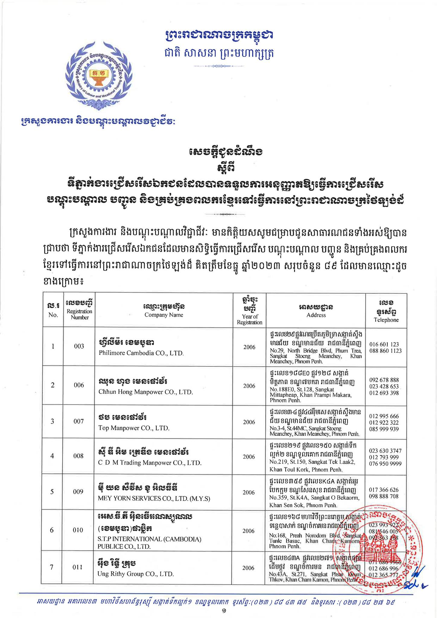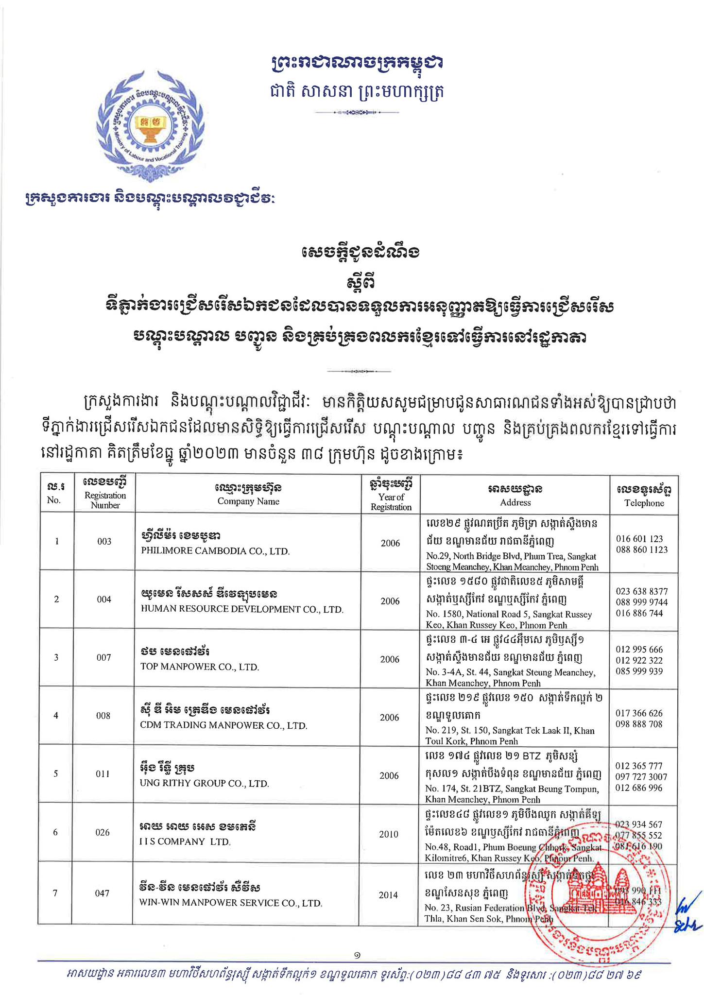 ជាមួយគ្នានេះដែរ ក្រសួងការងារក៏បានបញ្ជាក់ផងដែរថា រាល់ទីភ្នាក់ងារជ្រើសរើសឯកជនទាំងឡាយណាដែលពុំមានឈ្នោះក្នុងបញ្ជីខាងក្រោមនេះ គឺចាត់ទុកថាជាទីភ្នាក់ងារជ្រើសរើសឯកជនខុសច្បាប់ ដូច្នេះសូមសាធារណជនរាយការណ៍ជាបន្ទាន់ មកទូរស័ព្ទលេខ 089 957 789 និងទំនាក់ទំនងមន្ទីរការងារ និងបណ្តុះបណ្តាលវិជ្ជាជីវៈទាំង២៥ រាជធានី-ខេត្ត នៅរៀងរាល់ម៉ោងធ្វើការ ឬពិនិត្យមើលបញ្ជីឈ្មោះក្រុមហ៊ុនដែលមាននៅក្នុងគេហទំព័ររបស់ក្រសួងការងារនិងបណ្តុះបណ្តាលវិជ្ជាជីវៈ www.mlvt.gov.kh ។ សូមពិនិត្យបញ្ជីទីភ្នាក់ងារជ្រើសរើសឯកជនលម្អិតនៅខាងក្រោម៖