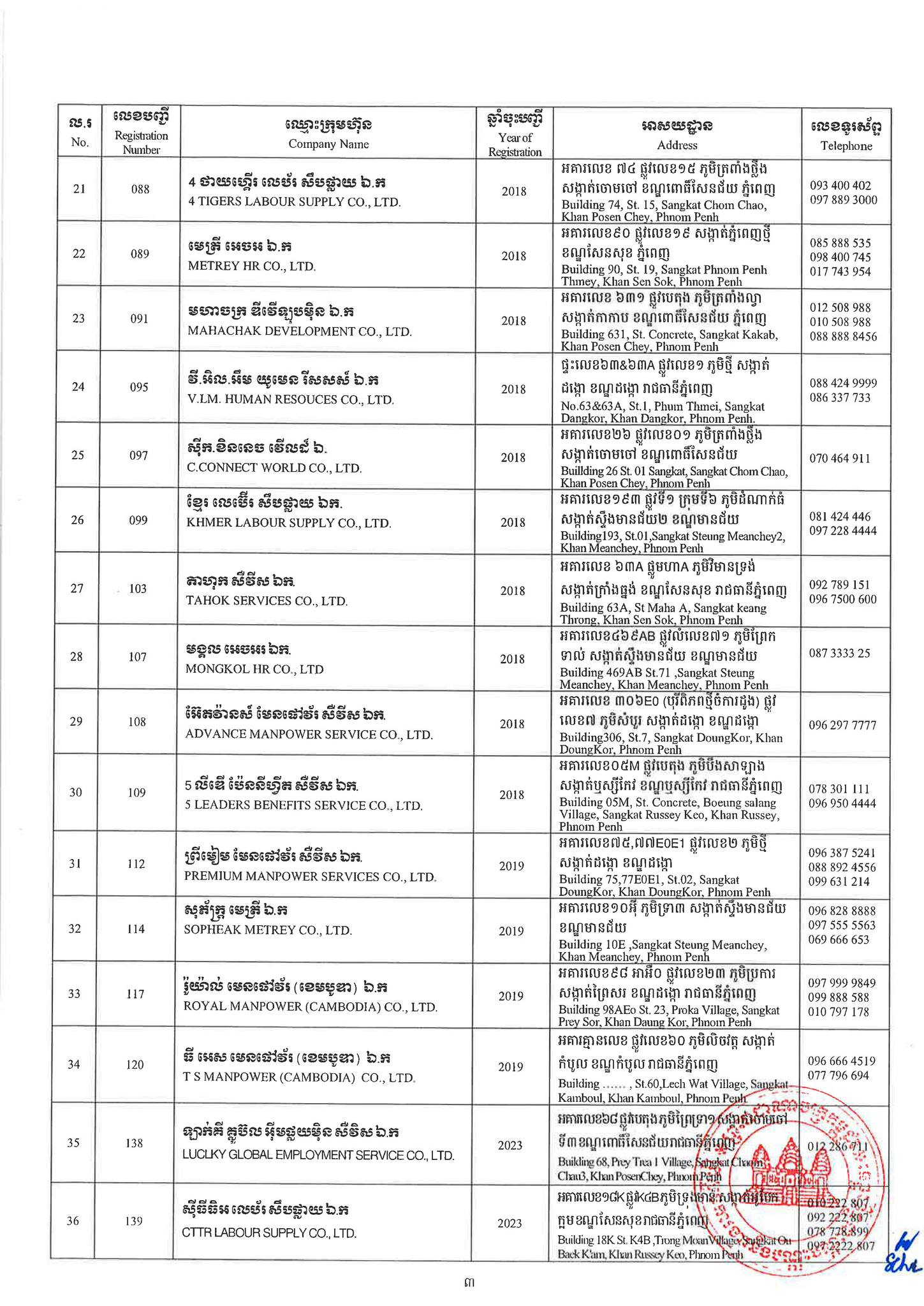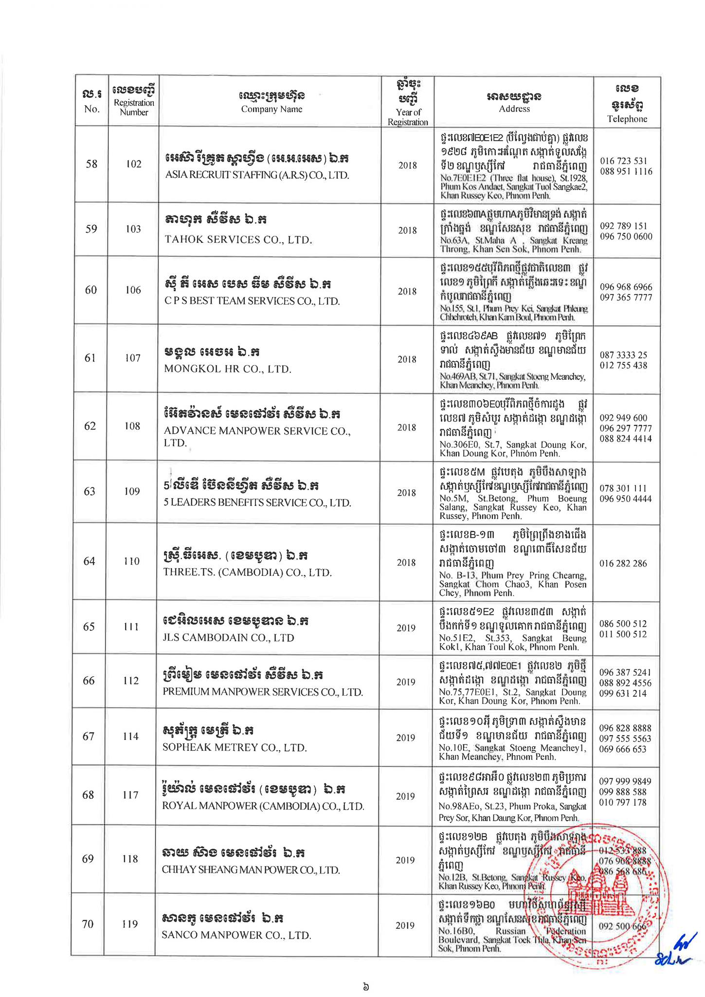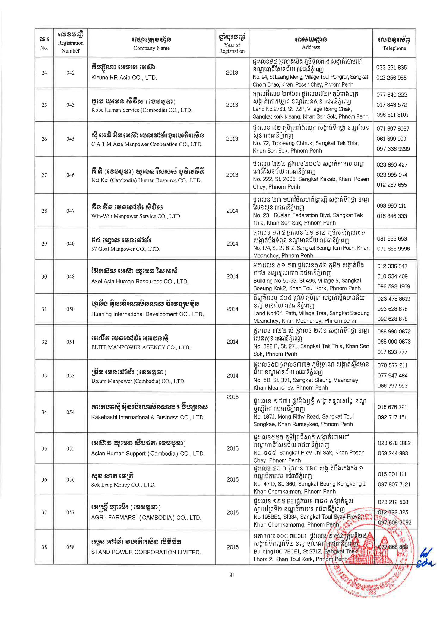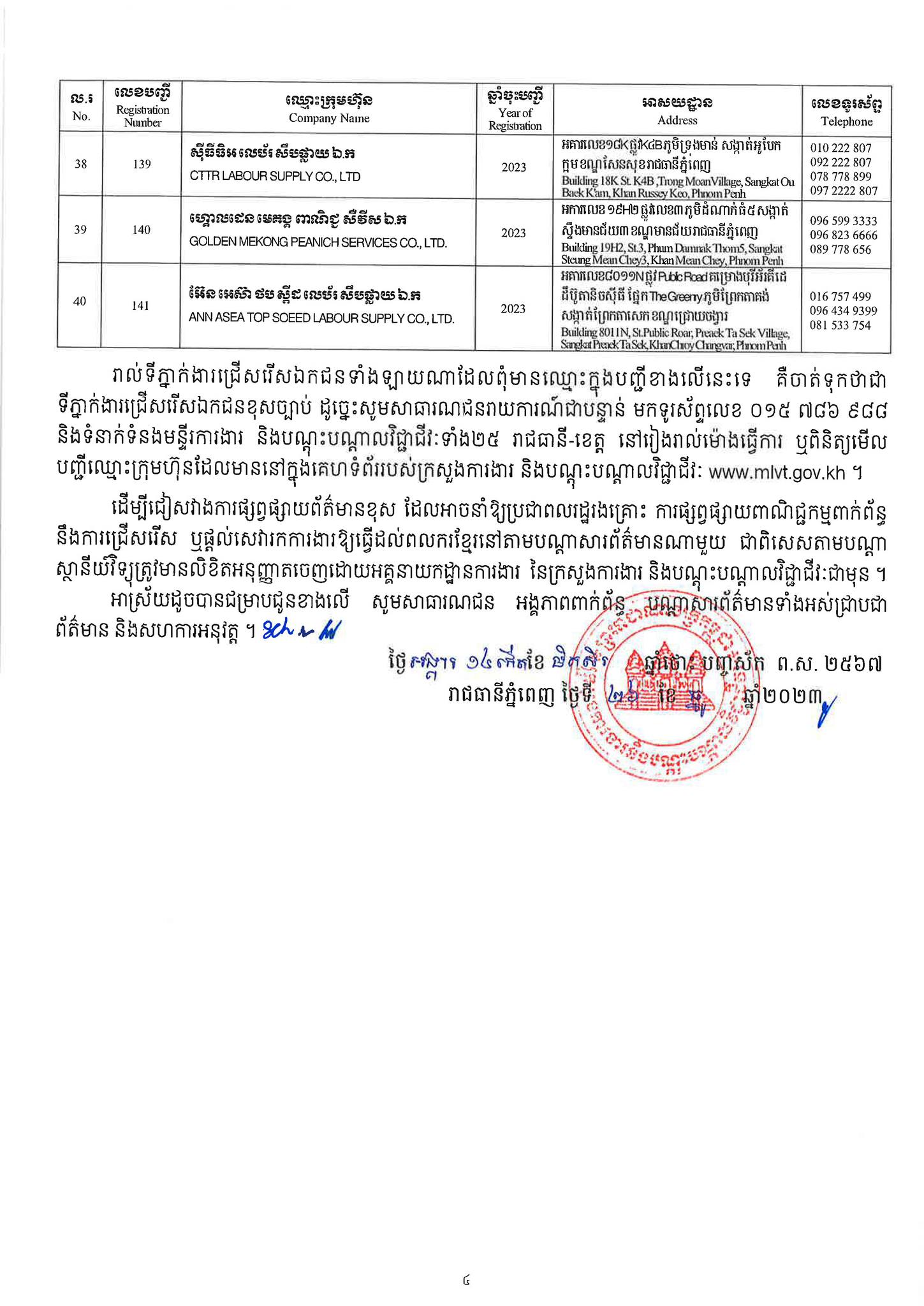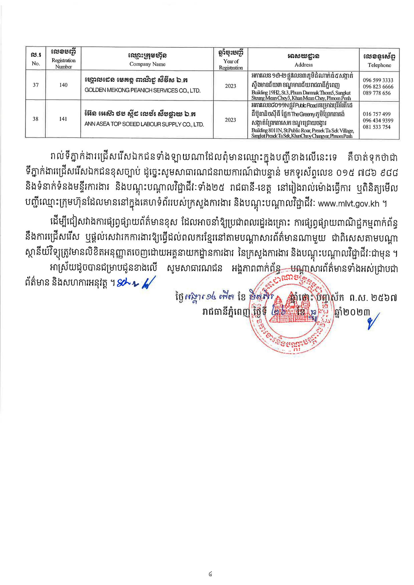 ជាមួយគ្នានេះដែរ ក្រសួងការងារក៏បានបញ្ជាក់ផងដែរថា រាល់ទីភ្នាក់ងារជ្រើសរើសឯកជនទាំងឡាយណាដែលពុំមានឈ្នោះក្នុងបញ្ជីខាងក្រោមនេះ គឺចាត់ទុកថាជាទីភ្នាក់ងារជ្រើសរើសឯកជនខុសច្បាប់ ដូច្នេះសូមសាធារណជនរាយការណ៍ជាបន្ទាន់ មកទូរស័ព្ទលេខ 089 957 789 និងទំនាក់ទំនងមន្ទីរការងារ និងបណ្តុះបណ្តាលវិជ្ជាជីវៈទាំង២៥ រាជធានី-ខេត្ត នៅរៀងរាល់ម៉ោងធ្វើការ ឬពិនិត្យមើលបញ្ជីឈ្មោះក្រុមហ៊ុនដែលមាននៅក្នុងគេហទំព័ររបស់ក្រសួងការងារនិងបណ្តុះបណ្តាលវិជ្ជាជីវៈ www.mlvt.gov.kh ។ សូមពិនិត្យបញ្ជីទីភ្នាក់ងារជ្រើសរើសឯកជនលម្អិតនៅខាងក្រោម៖