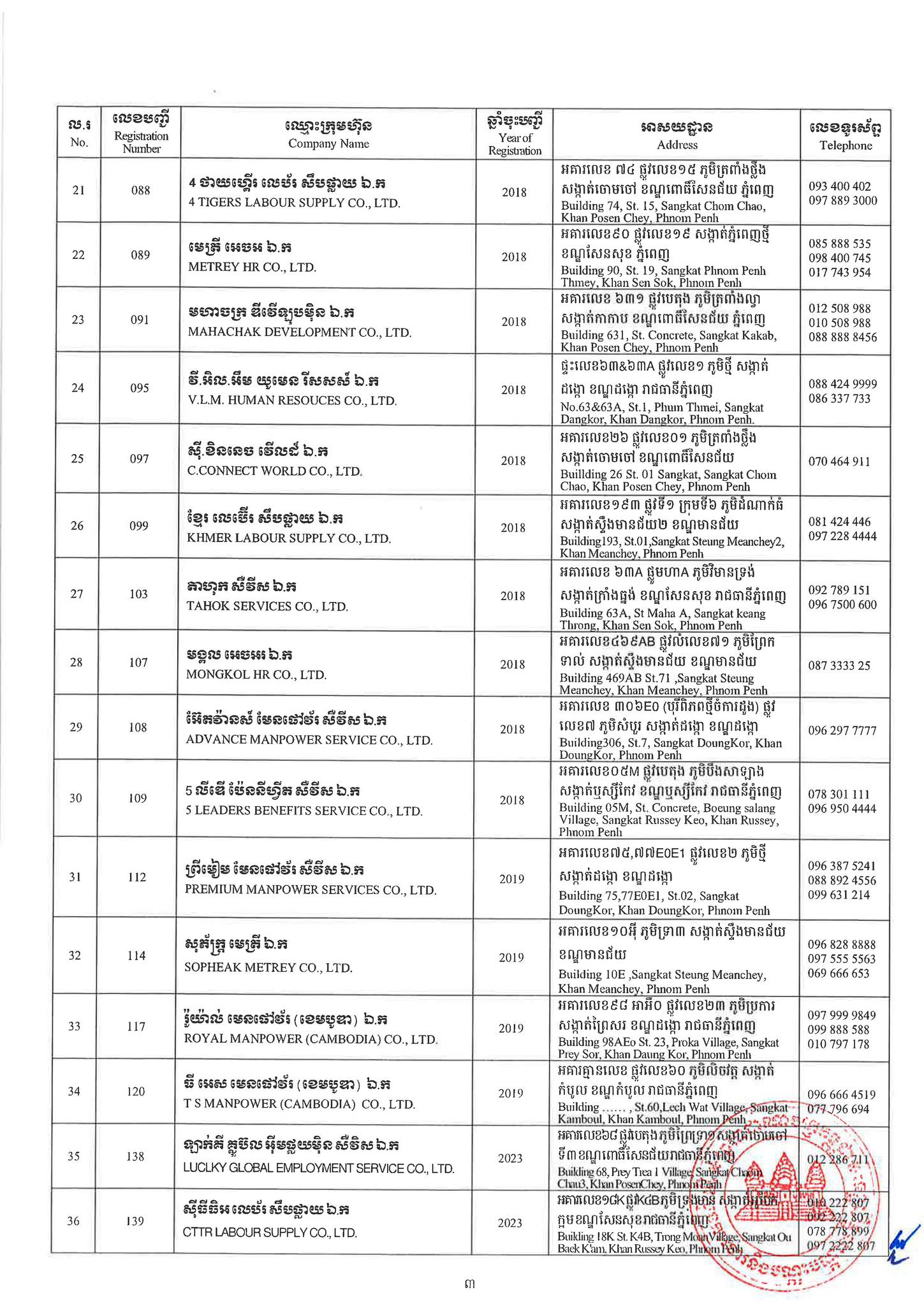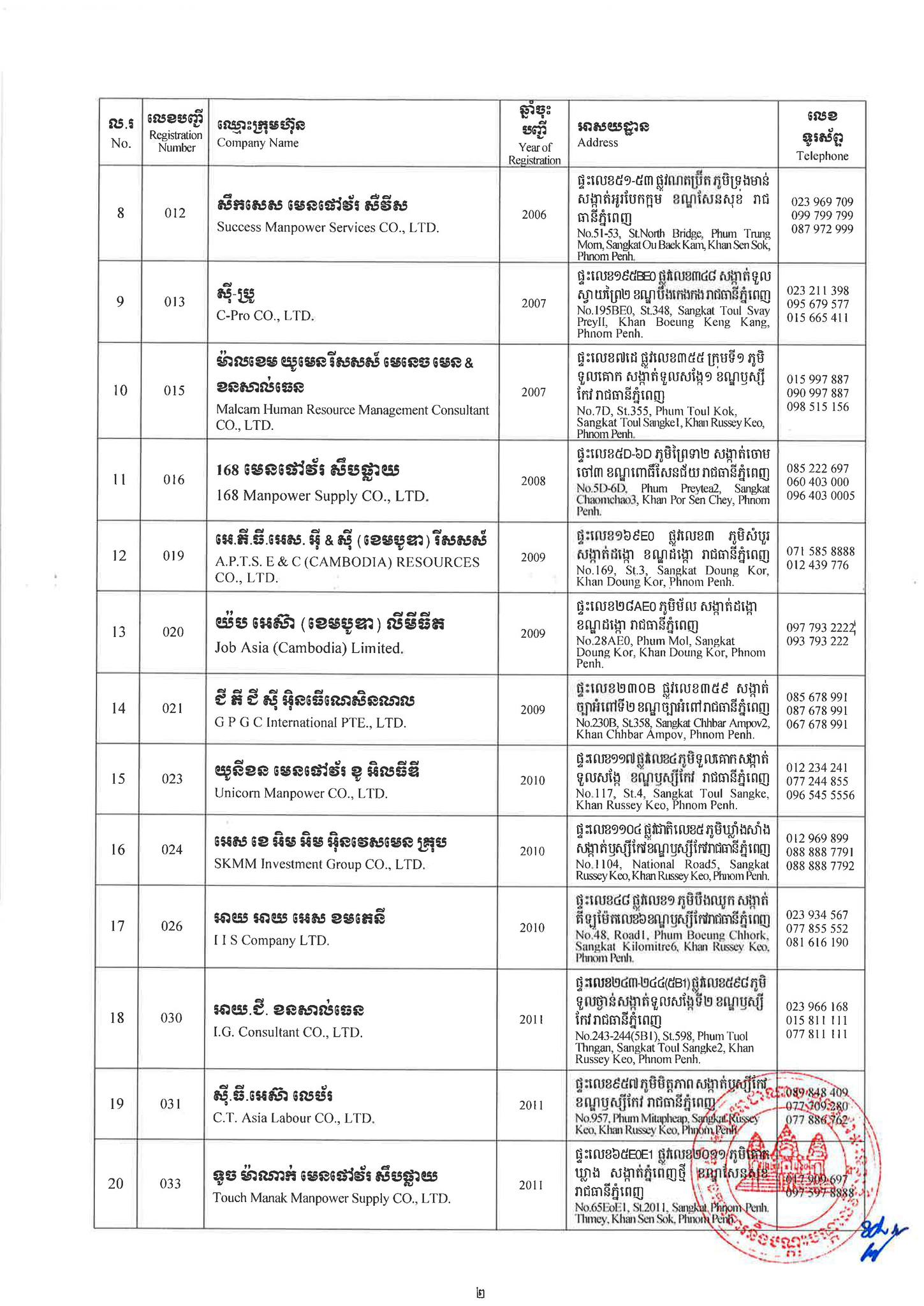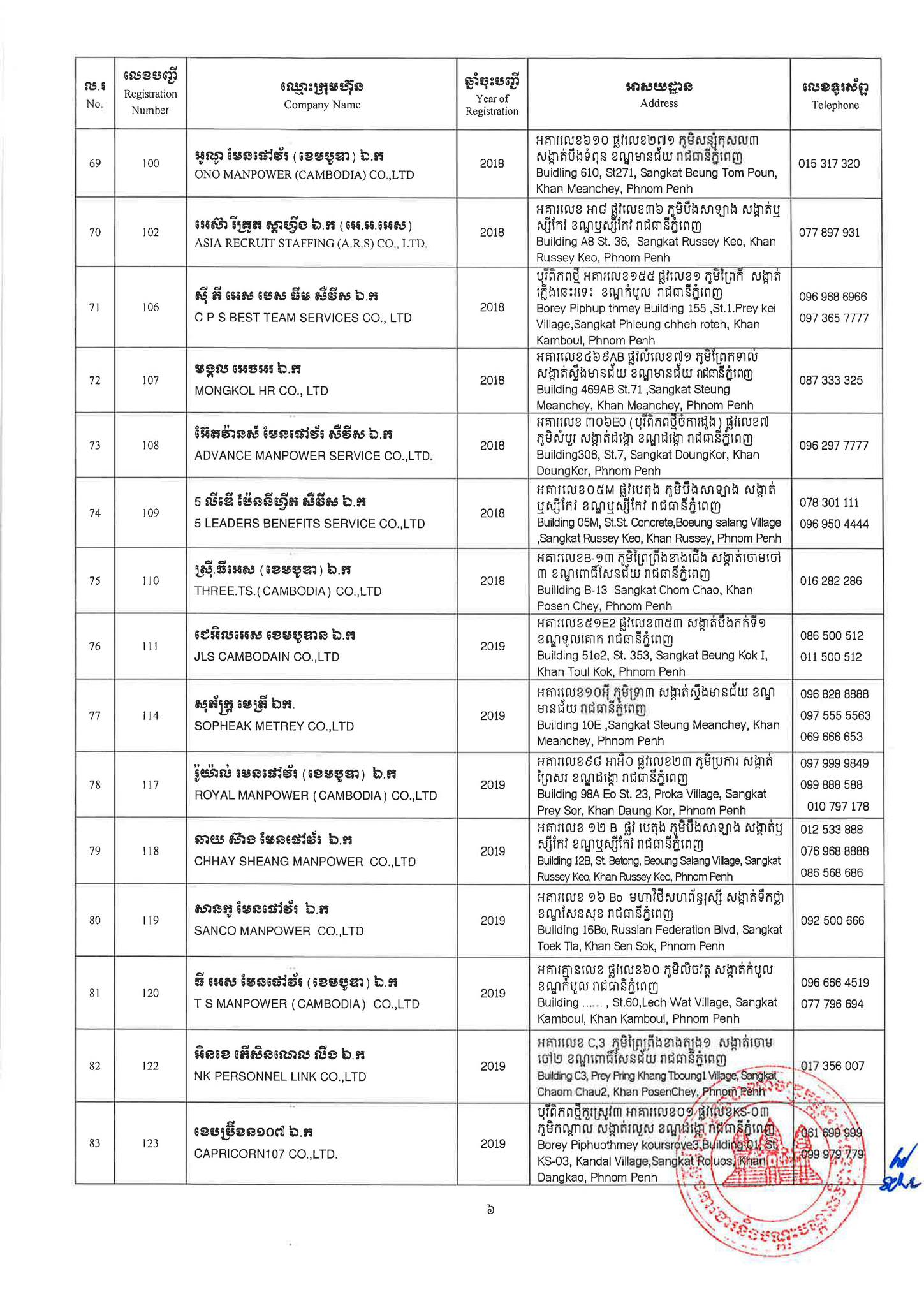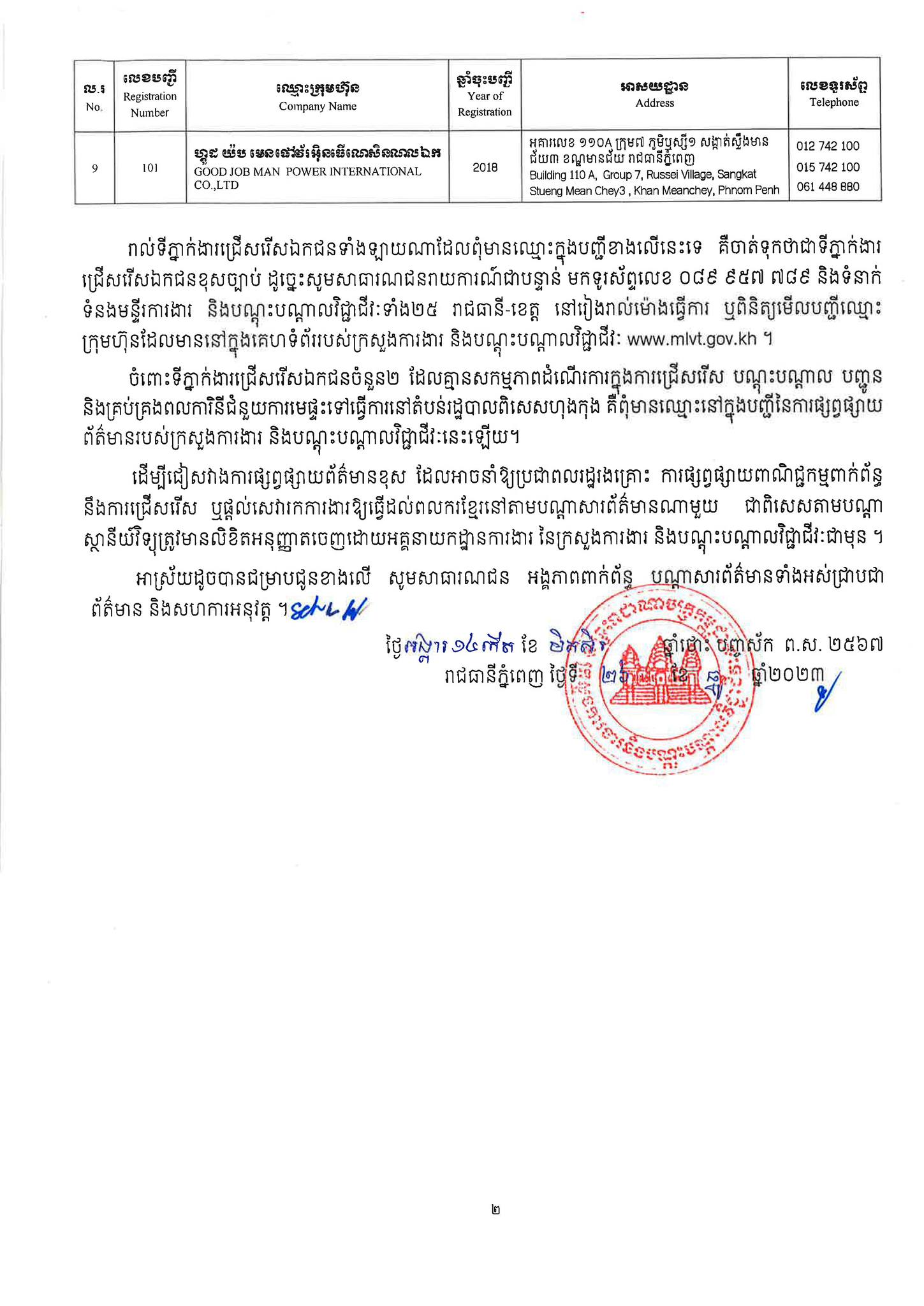 ជាមួយគ្នានេះដែរ ក្រសួងការងារក៏បានបញ្ជាក់ផងដែរថា រាល់ទីភ្នាក់ងារជ្រើសរើសឯកជនទាំងឡាយណាដែលពុំមានឈ្នោះក្នុងបញ្ជីខាងក្រោមនេះ គឺចាត់ទុកថាជាទីភ្នាក់ងារជ្រើសរើសឯកជនខុសច្បាប់ ដូច្នេះសូមសាធារណជនរាយការណ៍ជាបន្ទាន់ មកទូរស័ព្ទលេខ 089 957 789 និងទំនាក់ទំនងមន្ទីរការងារ និងបណ្តុះបណ្តាលវិជ្ជាជីវៈទាំង២៥ រាជធានី-ខេត្ត នៅរៀងរាល់ម៉ោងធ្វើការ ឬពិនិត្យមើលបញ្ជីឈ្មោះក្រុមហ៊ុនដែលមាននៅក្នុងគេហទំព័ររបស់ក្រសួងការងារនិងបណ្តុះបណ្តាលវិជ្ជាជីវៈ www.mlvt.gov.kh ។ សូមពិនិត្យបញ្ជីទីភ្នាក់ងារជ្រើសរើសឯកជនលម្អិតនៅខាងក្រោម៖