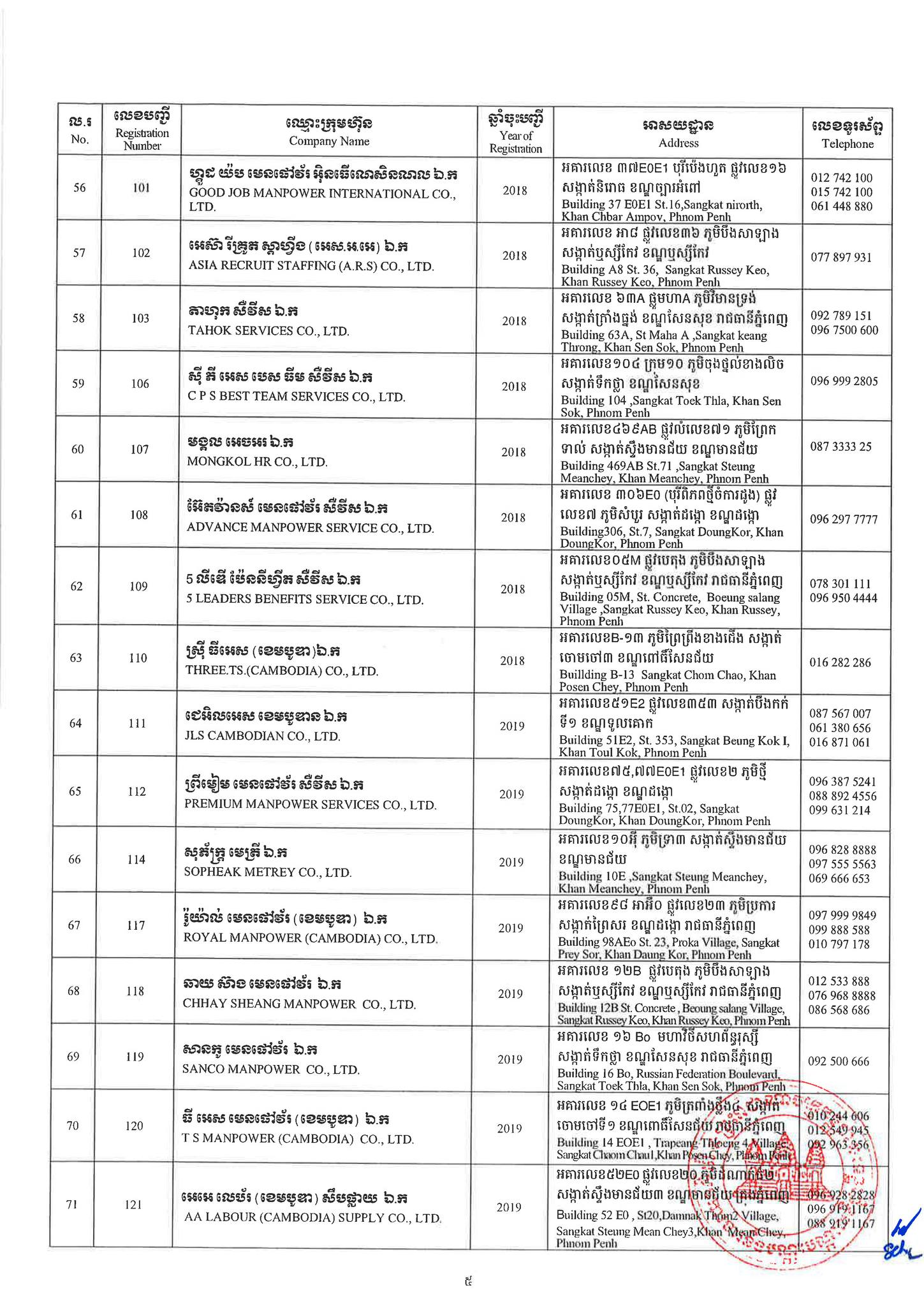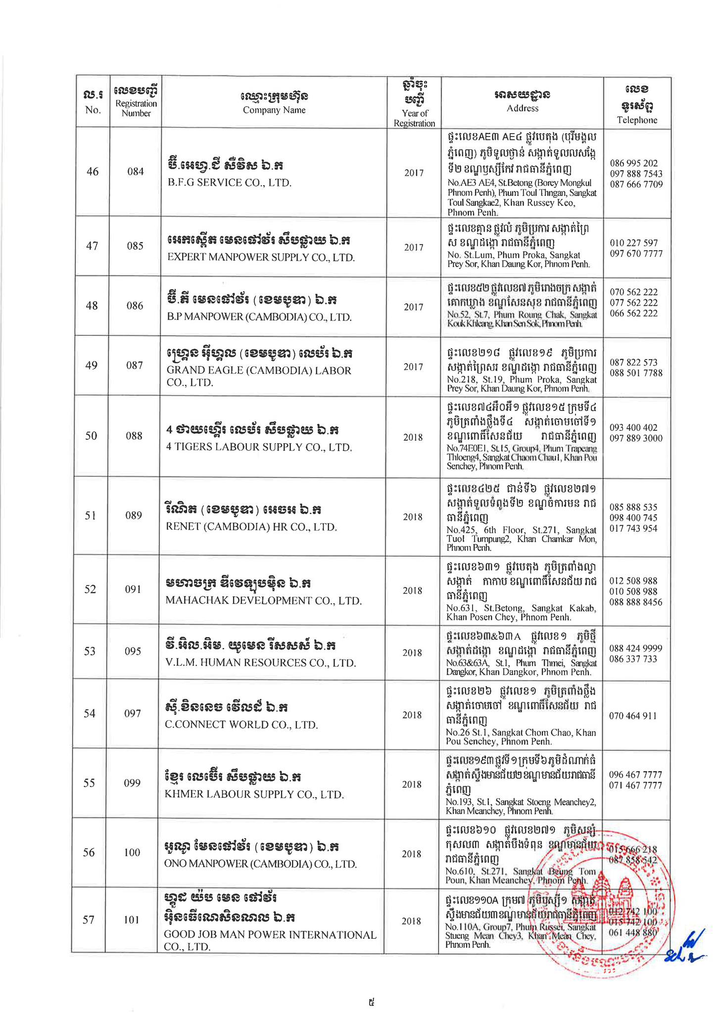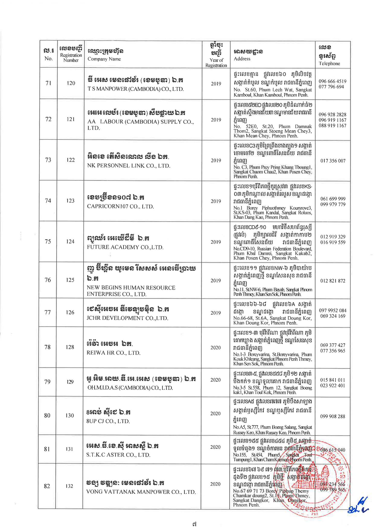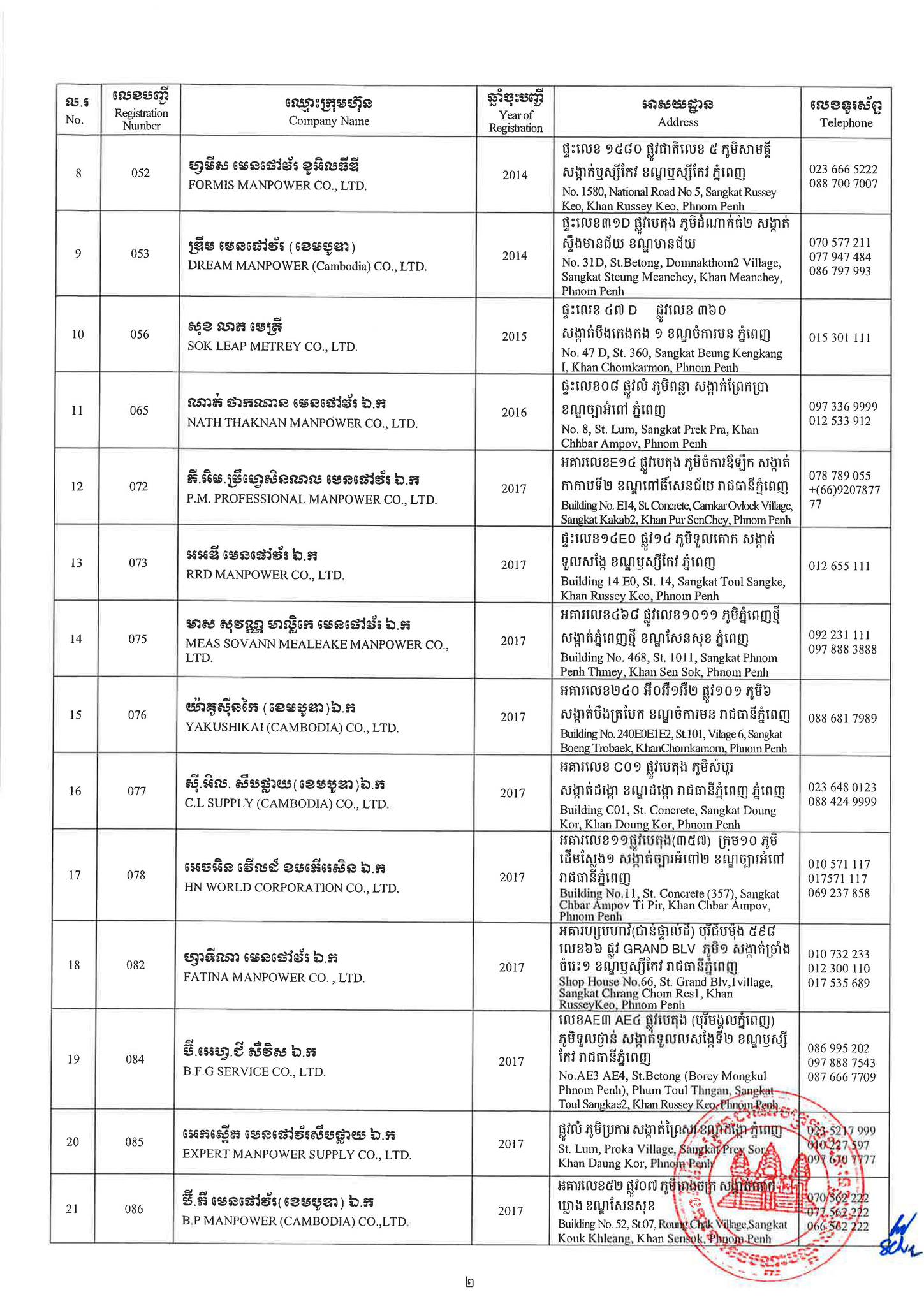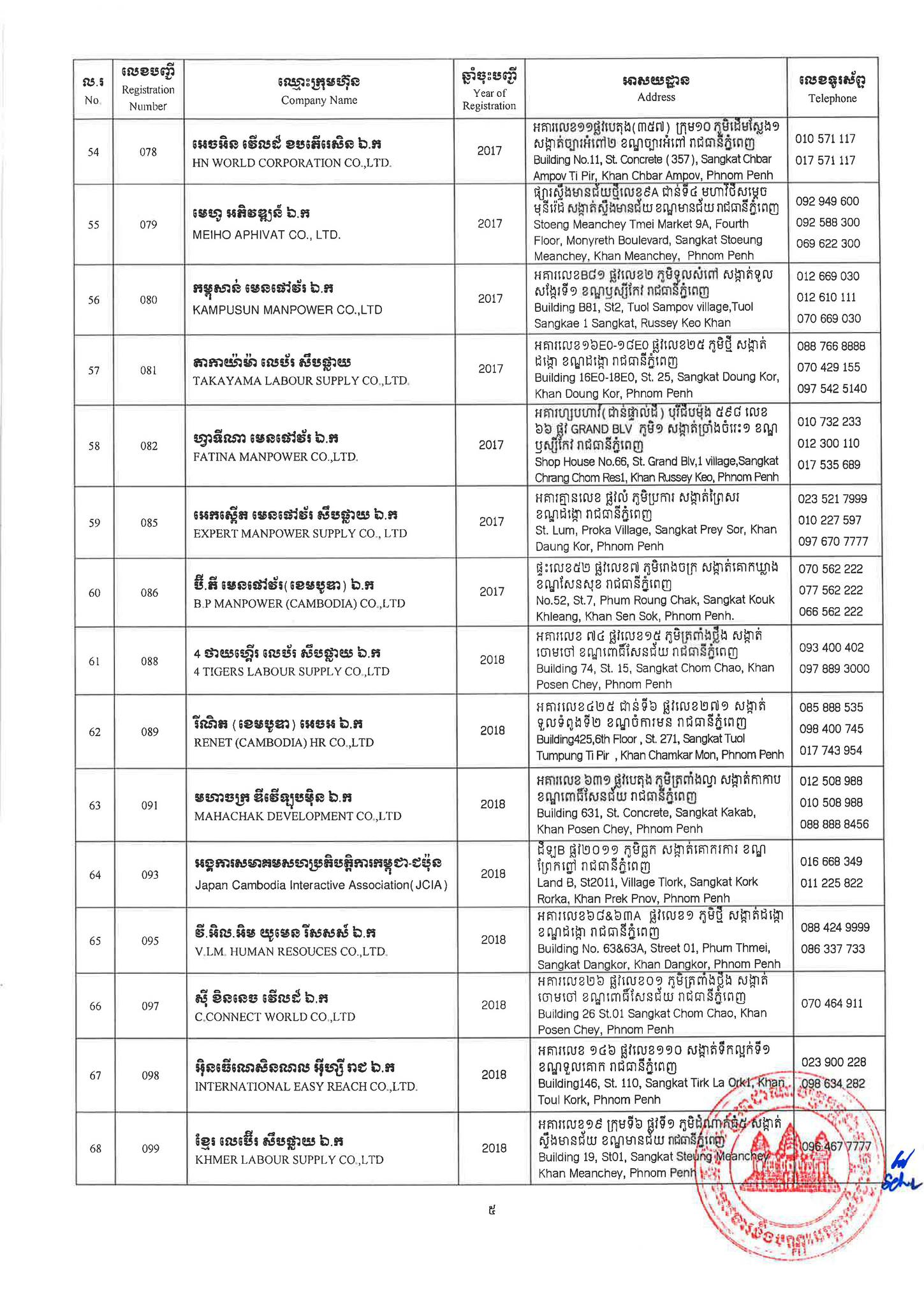 ជាមួយគ្នានេះដែរ ក្រសួងការងារក៏បានបញ្ជាក់ផងដែរថា រាល់ទីភ្នាក់ងារជ្រើសរើសឯកជនទាំងឡាយណាដែលពុំមានឈ្នោះក្នុងបញ្ជីខាងក្រោមនេះ គឺចាត់ទុកថាជាទីភ្នាក់ងារជ្រើសរើសឯកជនខុសច្បាប់ ដូច្នេះសូមសាធារណជនរាយការណ៍ជាបន្ទាន់ មកទូរស័ព្ទលេខ 089 957 789 និងទំនាក់ទំនងមន្ទីរការងារ និងបណ្តុះបណ្តាលវិជ្ជាជីវៈទាំង២៥ រាជធានី-ខេត្ត នៅរៀងរាល់ម៉ោងធ្វើការ ឬពិនិត្យមើលបញ្ជីឈ្មោះក្រុមហ៊ុនដែលមាននៅក្នុងគេហទំព័ររបស់ក្រសួងការងារនិងបណ្តុះបណ្តាលវិជ្ជាជីវៈ www.mlvt.gov.kh ។ សូមពិនិត្យបញ្ជីទីភ្នាក់ងារជ្រើសរើសឯកជនលម្អិតនៅខាងក្រោម៖