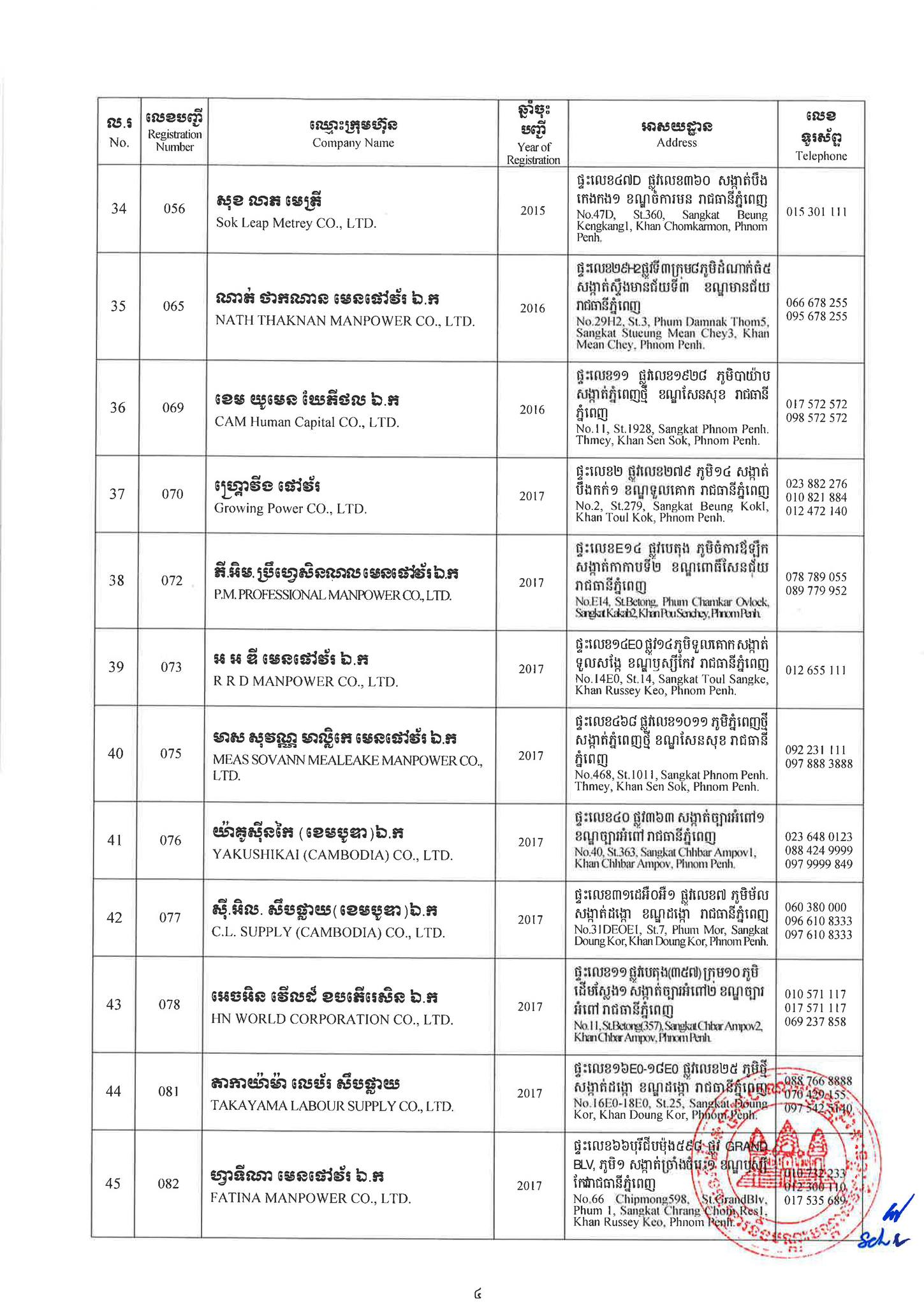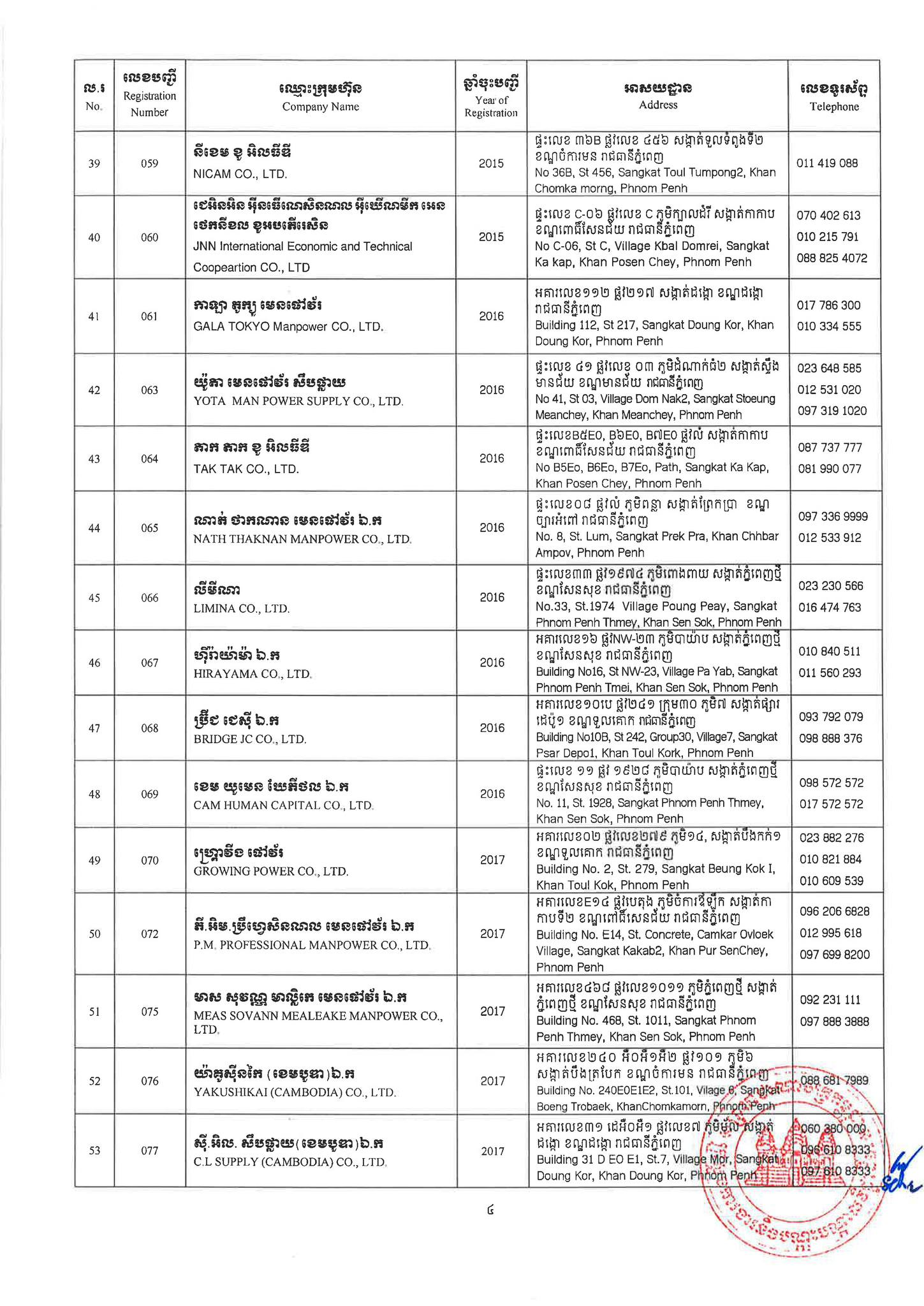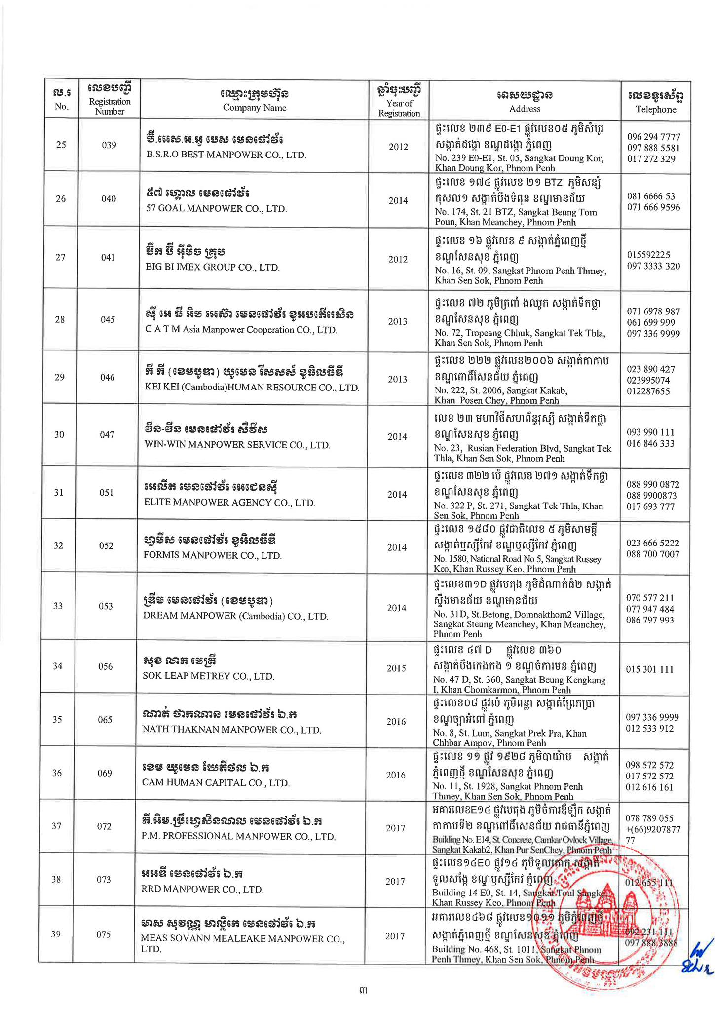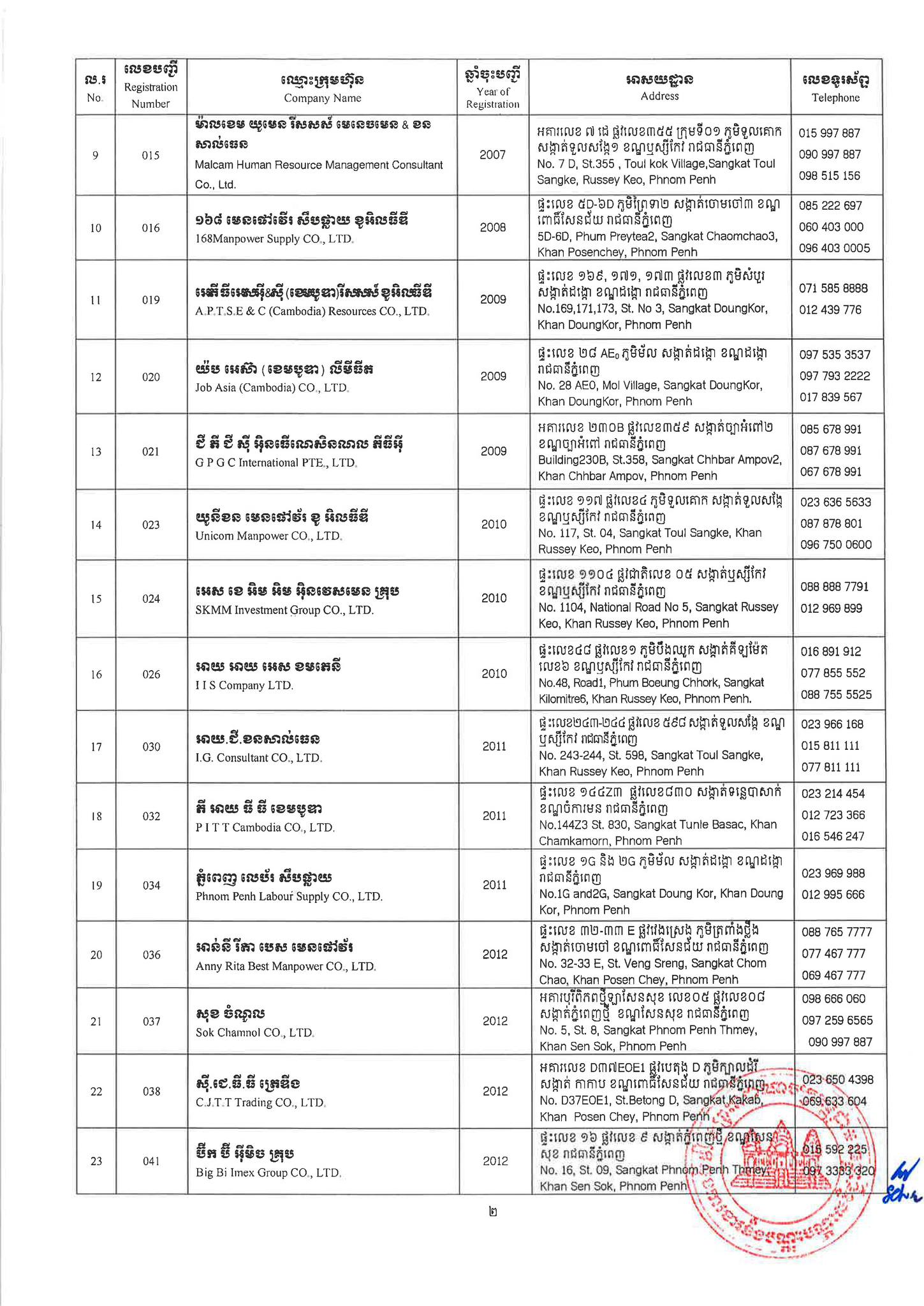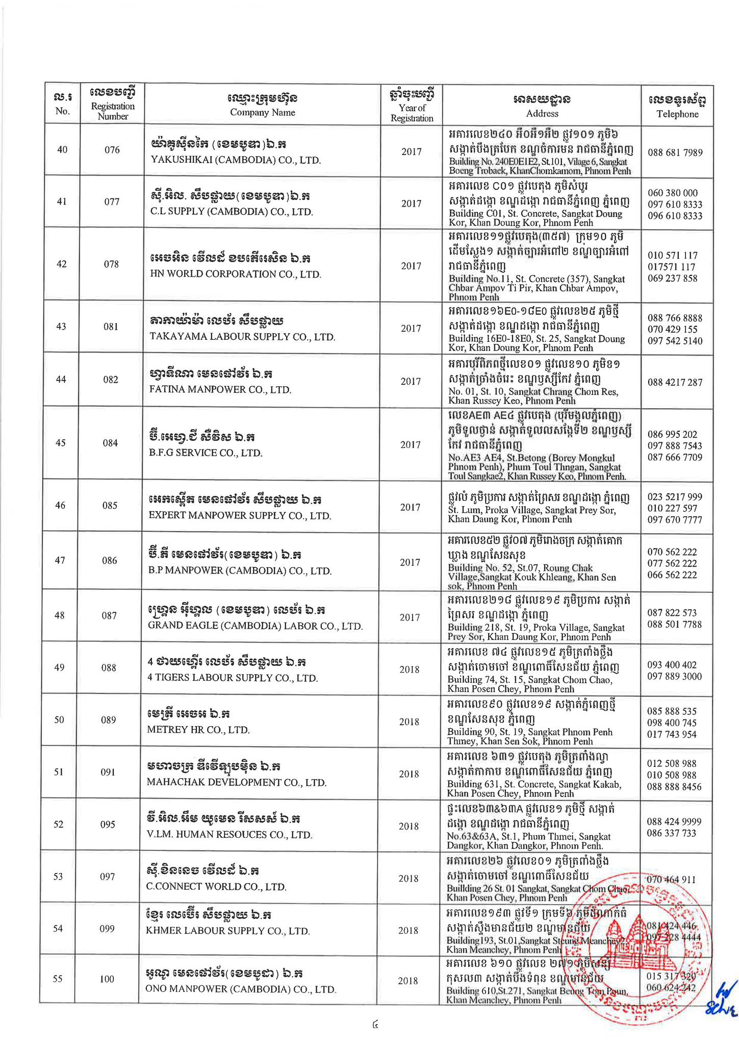 ជាមួយគ្នានេះដែរ ក្រសួងការងារក៏បានបញ្ជាក់ផងដែរថា រាល់ទីភ្នាក់ងារជ្រើសរើសឯកជនទាំងឡាយណាដែលពុំមានឈ្នោះក្នុងបញ្ជីខាងក្រោមនេះ គឺចាត់ទុកថាជាទីភ្នាក់ងារជ្រើសរើសឯកជនខុសច្បាប់ ដូច្នេះសូមសាធារណជនរាយការណ៍ជាបន្ទាន់ មកទូរស័ព្ទលេខ 089 957 789 និងទំនាក់ទំនងមន្ទីរការងារ និងបណ្តុះបណ្តាលវិជ្ជាជីវៈទាំង២៥ រាជធានី-ខេត្ត នៅរៀងរាល់ម៉ោងធ្វើការ ឬពិនិត្យមើលបញ្ជីឈ្មោះក្រុមហ៊ុនដែលមាននៅក្នុងគេហទំព័ររបស់ក្រសួងការងារនិងបណ្តុះបណ្តាលវិជ្ជាជីវៈ www.mlvt.gov.kh ។ សូមពិនិត្យបញ្ជីទីភ្នាក់ងារជ្រើសរើសឯកជនលម្អិតនៅខាងក្រោម៖