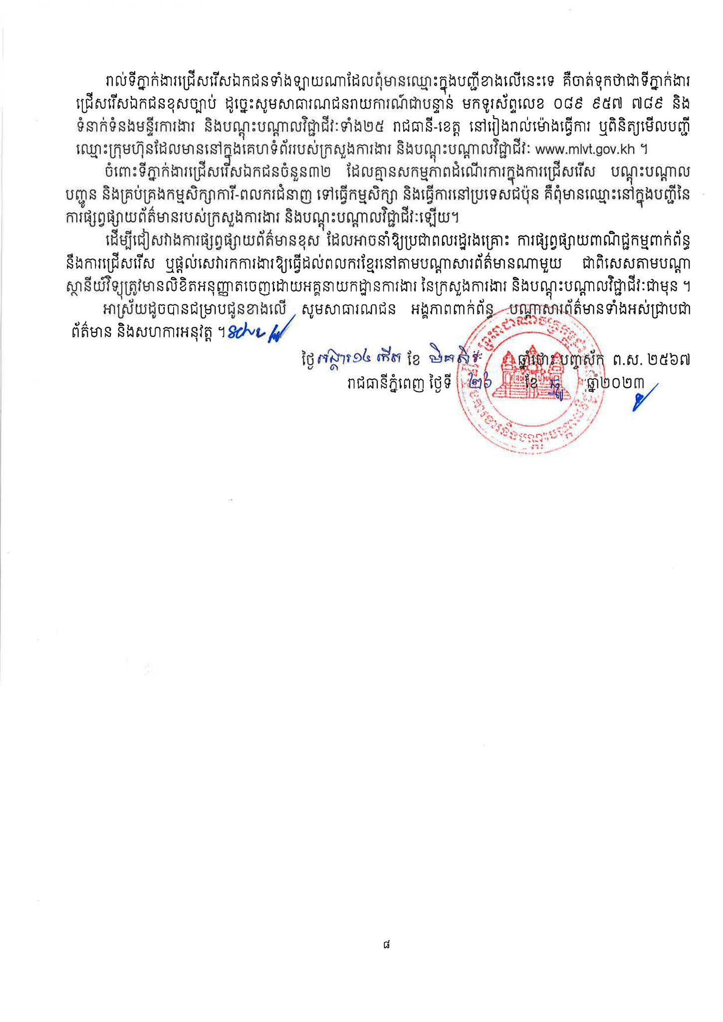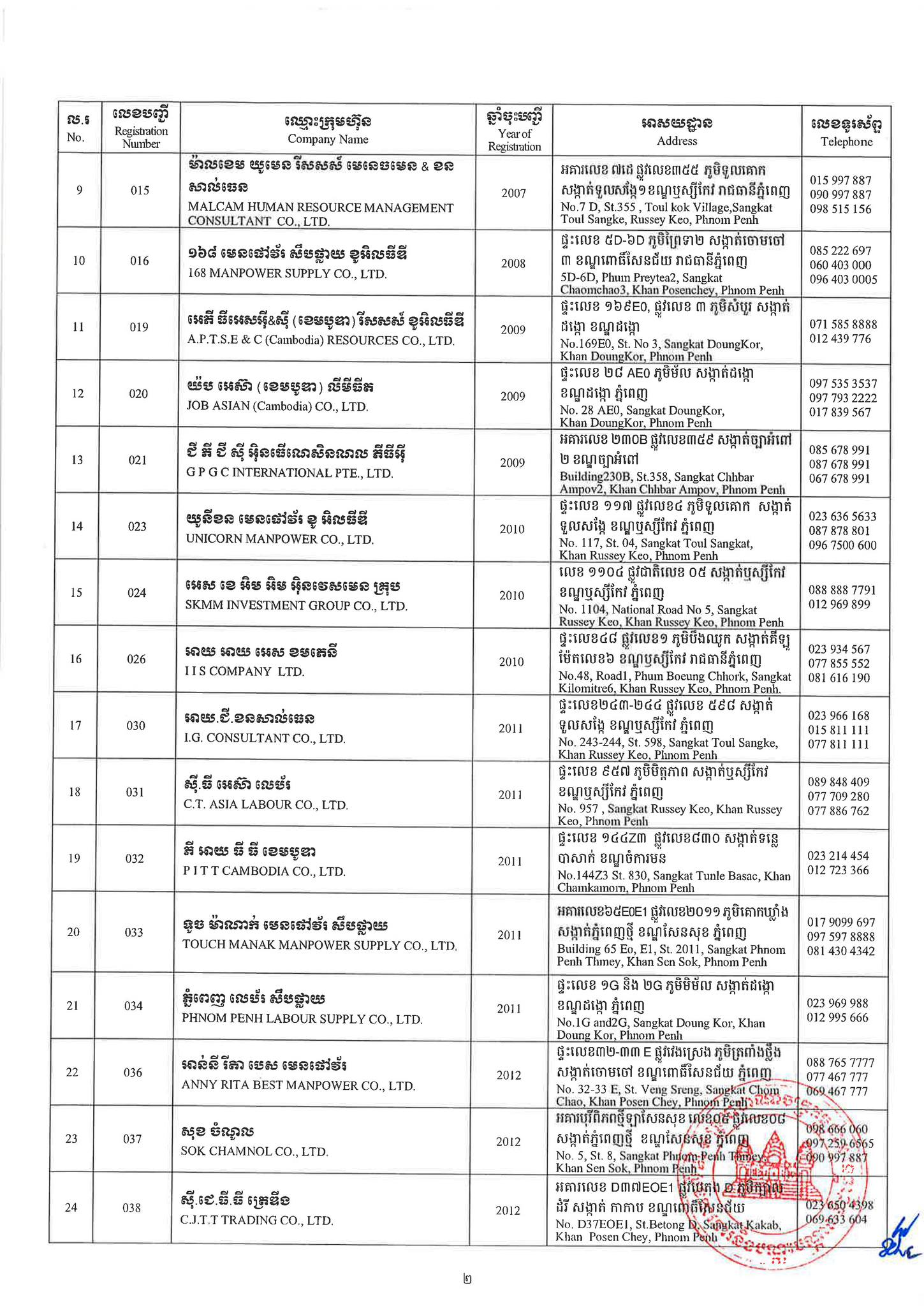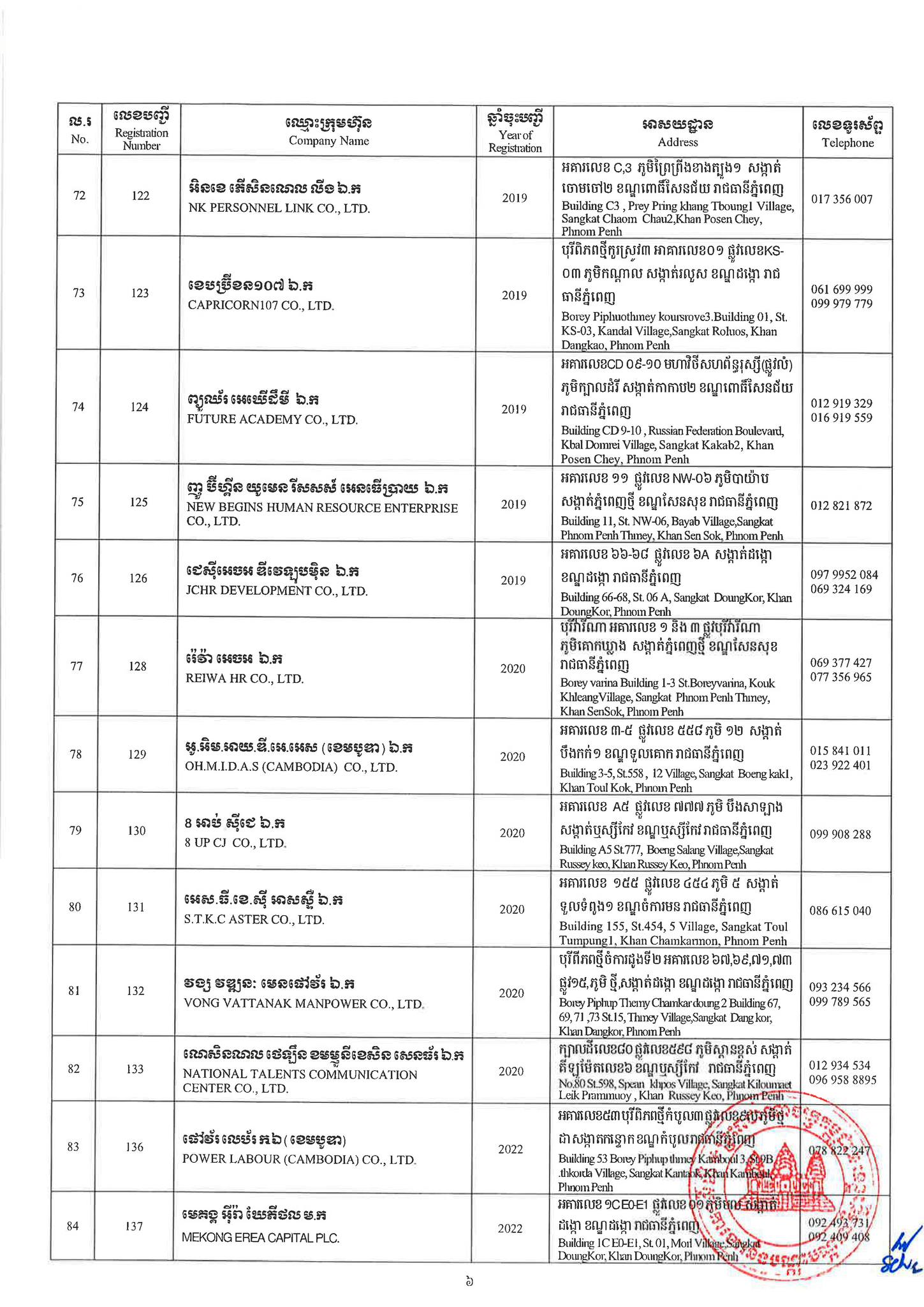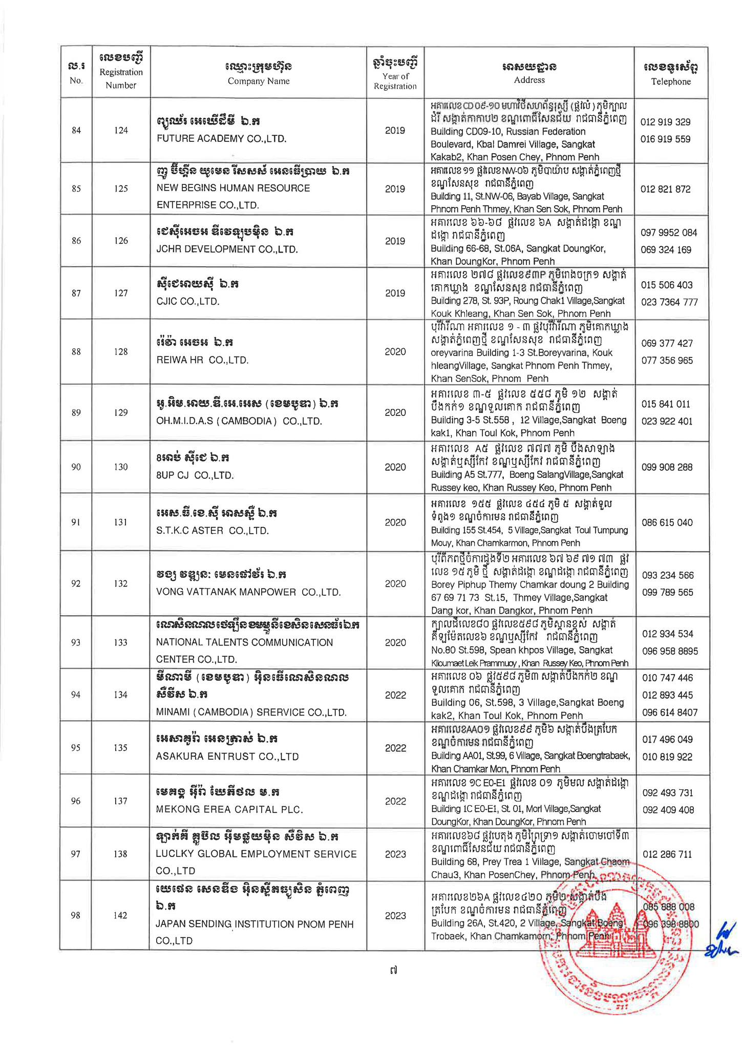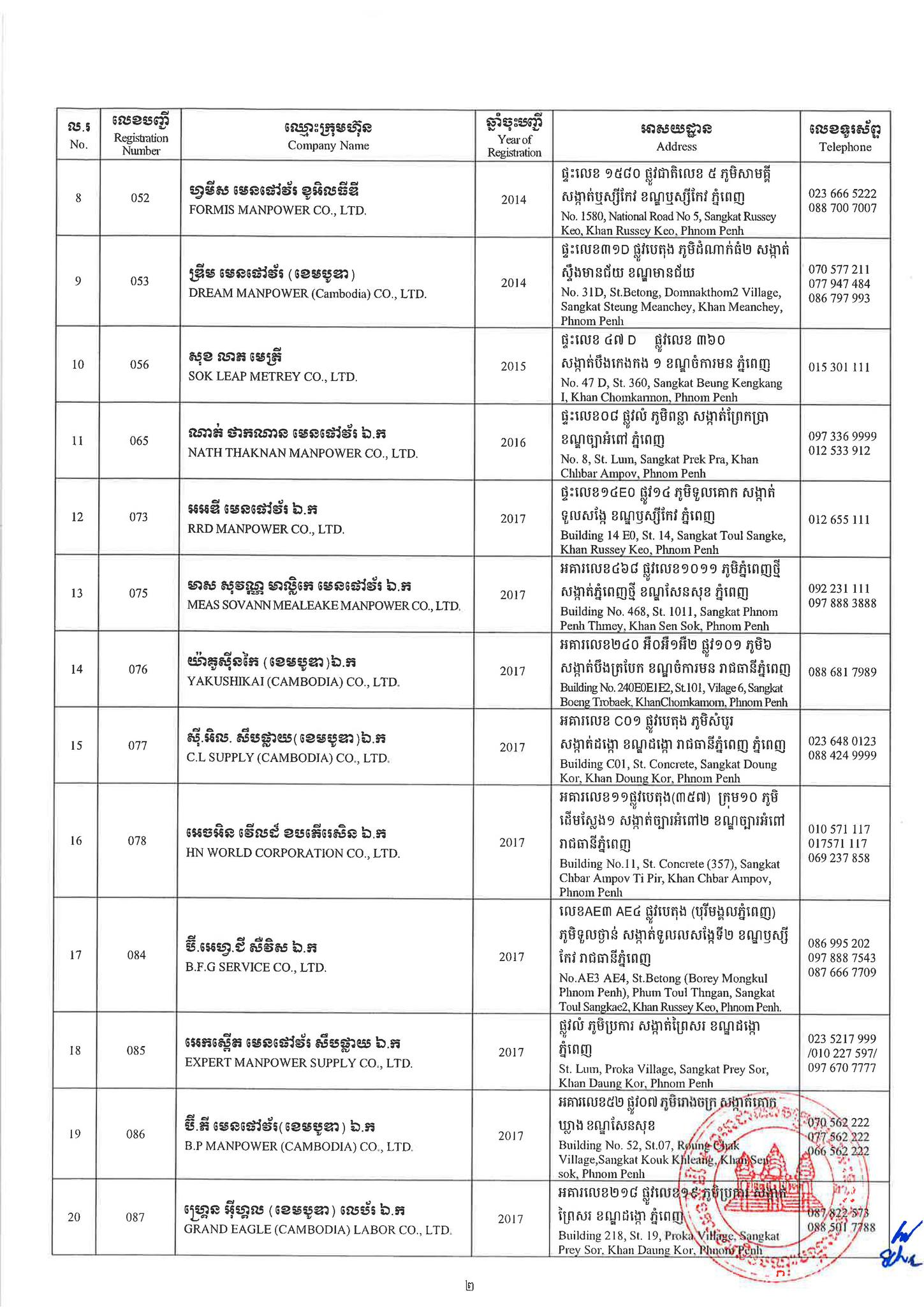ជាមួយគ្នានេះដែរ ក្រសួងការងារក៏បានបញ្ជាក់ផងដែរថា រាល់ទីភ្នាក់ងារជ្រើសរើសឯកជនទាំងឡាយណាដែលពុំមានឈ្នោះក្នុងបញ្ជីខាងក្រោមនេះ គឺចាត់ទុកថាជាទីភ្នាក់ងារជ្រើសរើសឯកជនខុសច្បាប់ ដូច្នេះសូមសាធារណជនរាយការណ៍ជាបន្ទាន់ មកទូរស័ព្ទលេខ 089 957 789 និងទំនាក់ទំនងមន្ទីរការងារ និងបណ្តុះបណ្តាលវិជ្ជាជីវៈទាំង២៥ រាជធានី-ខេត្ត នៅរៀងរាល់ម៉ោងធ្វើការ ឬពិនិត្យមើលបញ្ជីឈ្មោះក្រុមហ៊ុនដែលមាននៅក្នុងគេហទំព័ររបស់ក្រសួងការងារនិងបណ្តុះបណ្តាលវិជ្ជាជីវៈ www.mlvt.gov.kh ។ សូមពិនិត្យបញ្ជីទីភ្នាក់ងារជ្រើសរើសឯកជនលម្អិតនៅខាងក្រោម៖