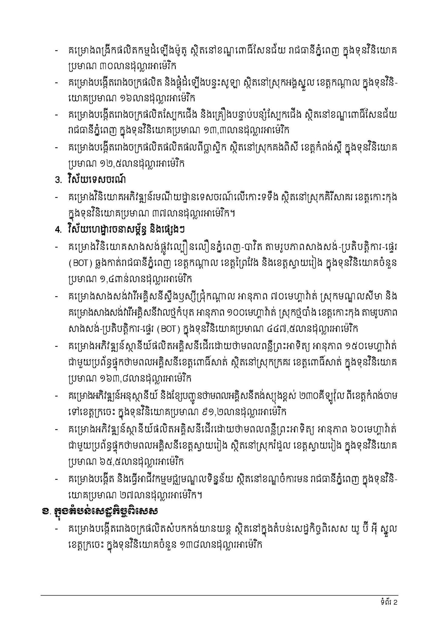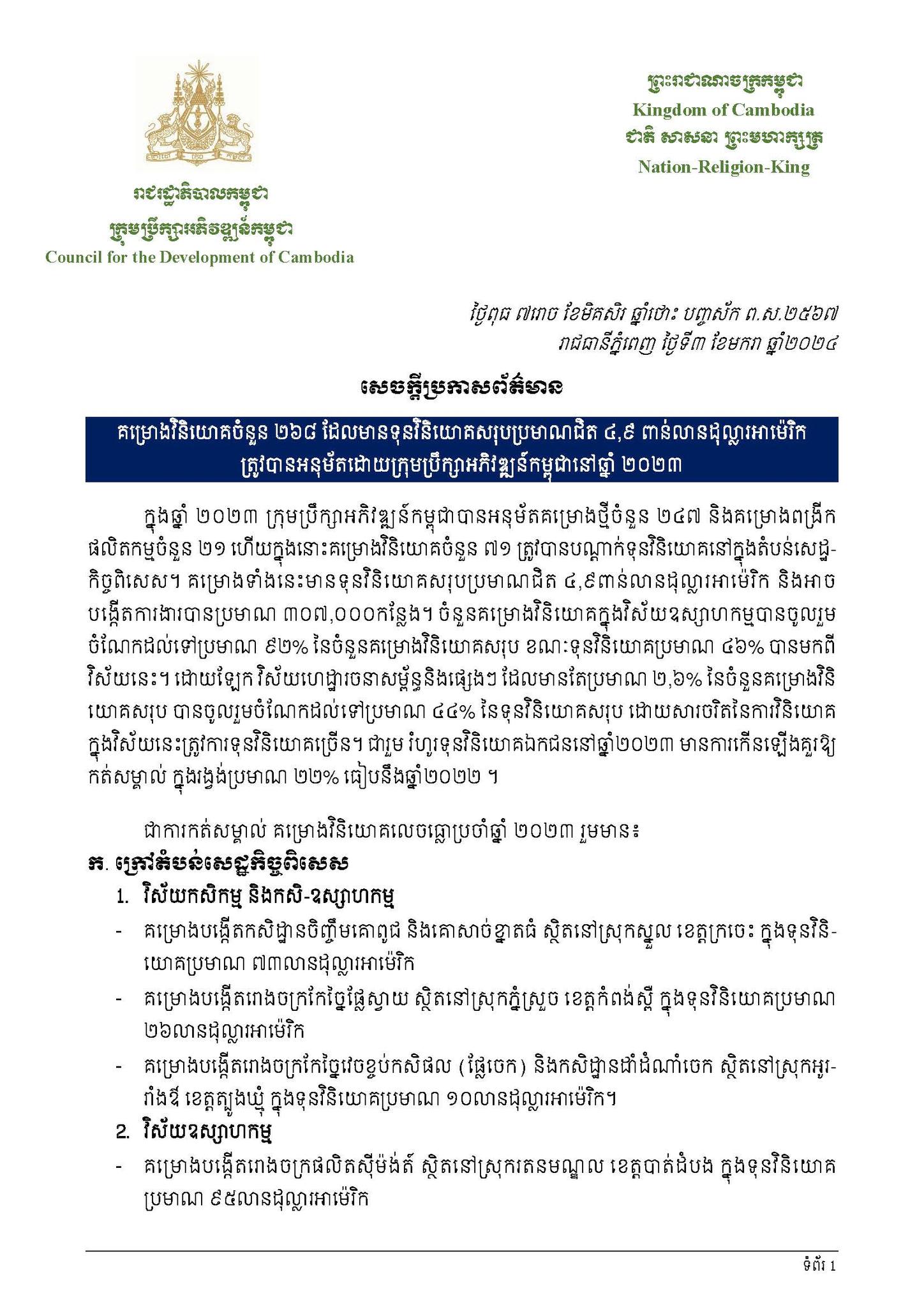 តាមរយៈការបង្ហោះនៅលើផេកផ្លូវការ ក្រុមប្រឹក្សាអភិវឌ្ឍន៍កម្ពុជា បានបញ្ជាក់ថា ក្នុងឆ្នាំ ២០២៣ ក្រុមប្រឹក្សាអភិវឌ្ឍន៍កម្ពុជាបានអនុម័តគម្រោងថ្មីចំនួន ២៤៧ និងគម្រោងពង្រីកផលិតកម្មចំនួន ២១ ហើយក្នុងនោះគម្រោងវិនិយោគចំនួន ៧១ ត្រូវបានបណ្តាក់ទុនវិនិយោគនៅក្នុងតំបន់សេដ្ឋកិច្ចពិសេស។ គម្រោងទាំងនេះមានទុនវិនិយោគសរុបប្រមាណជិត ៤,៩ពាន់លានដុល្លារអាម៉េរិក និងអាចបង្កើតការងារបានប្រមាណ ៣០៧,០០០កន្លែង។ ចំនួនគម្រោងវិនិយោគក្នុងវិស័យឧស្សាហកម្មបានចូលរួម ចំណែកដល់ទៅប្រមាណ ៩២% នៃចំនួនគម្រោងវិនិយោគសរុប ខណៈទុនវិនិយោគប្រមាណ ៤៦% បានមកពីវិស័យនេះ។ ដោយឡែក វិស័យហេដ្ឋារចនាសម្ព័ន្ធនឹងផ្សេងៗ ដែលមានតែប្រមាណ ២,៦% នៃចំនួនគម្រោងវិនិយោគសរុប បានចូលរួមចំណែកដល់ទៅប្រមាណ ៤៤% នៃទុនវិនិយោគសរុប ដោយសារចរិតនៃការវិនិយោគ ក្នុងវិស័យនេះត្រូវការទុនវិនិយោគច្រើន។ ជារួម រំហូរទុនវិនិយោគឯកជននៅឆ្នាំ២០២៣ មានការកើនឡើងគួរឱ្យកត់សម្គាល់ក្នុងរង្វង់ប្រមាណ ២២% ធៀបនឹងឆ្នាំ២០២២។