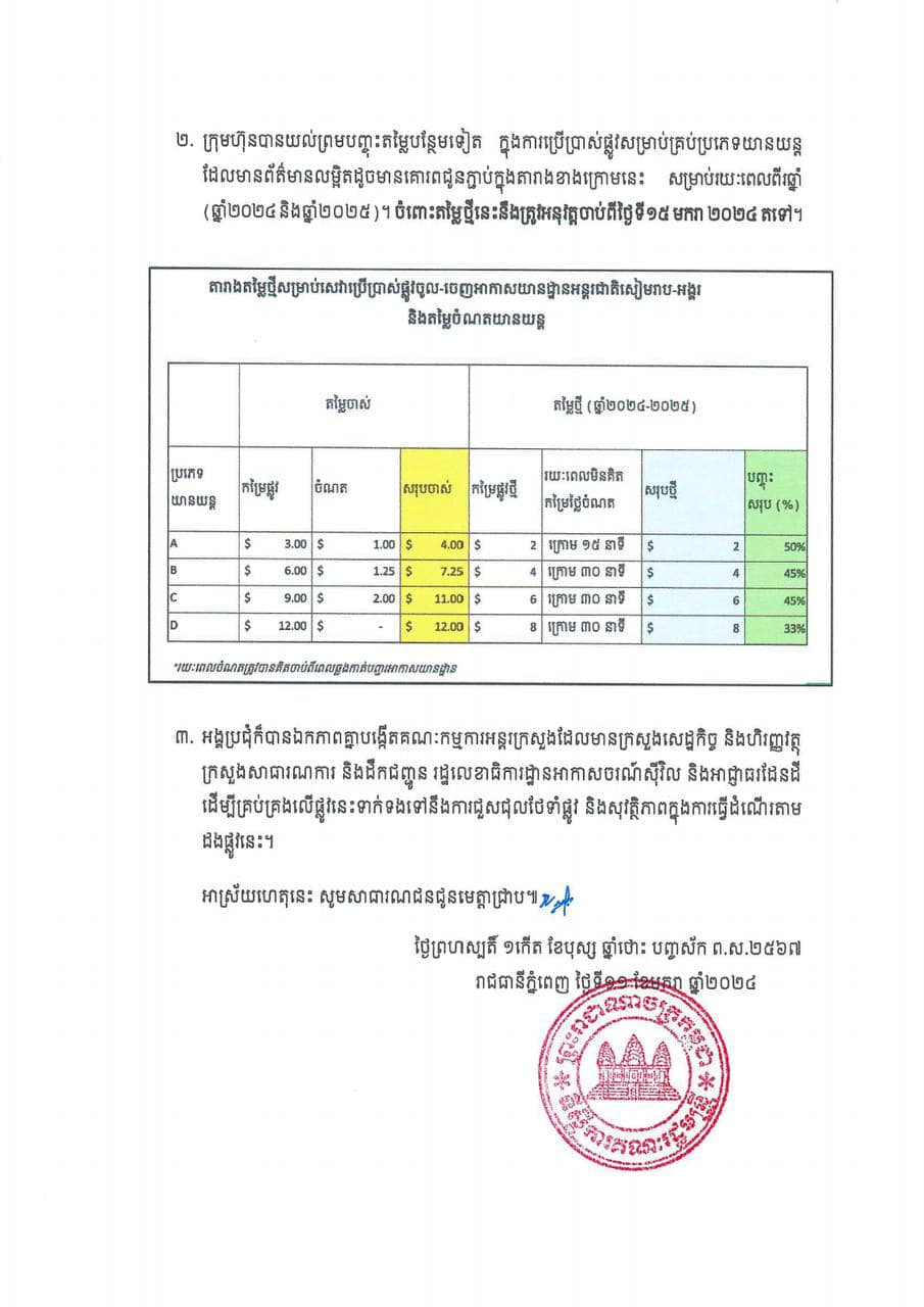 ២. ក្រុមហ៊ុនបានយល់ព្រមធ្វើការបញ្ចុះតម្លៃបន្ថែម ក្នុងការប្រើប្រាស់ផ្លូវ សម្រាប់គ្រប់ប្រភេទយានយន្តមួយចំនួន សម្រាប់រយៈពេលពីរឆ្នាំចាប់ពីឆ្នាំ២០២៤ និងឆ្នាំ២០២៥។