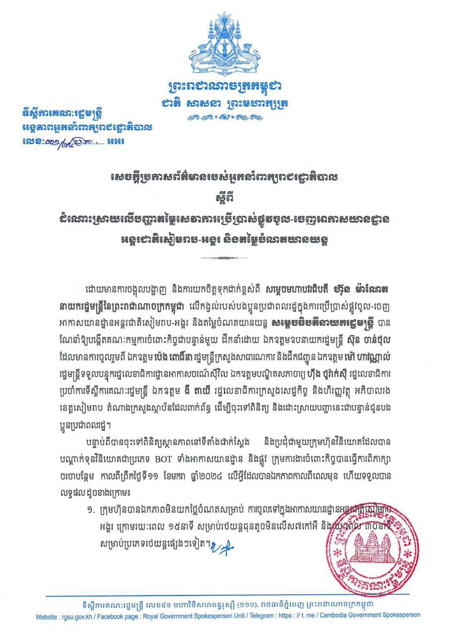 យោងតាមសេចក្តីប្រកាសព័ត៌មាន របស់អង្គភាពអ្នកនាំពាក្យរាជរដ្ឋាភិបាល បានបញ្ជាក់ថា ដោយមានការចង្អុលបង្ហាញ និងការយកចិត្តទុកដាក់ខ្ពស់ពី សម្ដេចមហាបវរធិបតី ហ៊ុន ម៉ាណែត នាយករដ្ឋមន្ត្រីនៃព្រះរាជាណាចក្រកម្ពុជា លើកង្វល់របស់បងប្អូនប្រជាពលរដ្ឋក្នុងការប្រើប្រាស់ផ្លូវចូល-ចេញ អាកាសយានដ្ឋានអន្តរជាតិសៀមរាប-អង្គរ និងតម្លៃចំណតយានយន្ត សម្តេចធិបតីនាយករដ្ឋមន្ត្រី បាន ណែនាំឱ្យបង្កើតគណៈកម្មការចំពោះកិច្ចជាបន្ទាន់មួយ ដឹកនាំដោយ ឯកឧត្តមឧបនាយករដ្ឋមន្ត្រី ស៊ុន ចាន់ថុល ដែលមានការចូលរួមពី ឯកឧត្តម ប៉េង ពោធិ៍នា រដ្ឋមន្ត្រីក្រសួងសាធារណការ និងដឹកជញ្ជូន ឯកឧត្ដម ម៉ៅ ហាវណ្ណាល់ រដ្ឋមន្ត្រីទទួលបន្ទុករដ្ឋលេខាធិការដ្ឋានអាកាសចរណ៍ស៊ីវិល ឯកឧត្តមបណ្ឌិតសភាចារ្យ ហ៊ីង ថូរ៉ាក់ស៊ី រដ្ឋលេខាធិការ ប្រចាំការទីស្ដីការគណៈរដ្ឋមន្ត្រី ឯកឧត្តម ងី តាយី រដ្ឋលេខាធិការក្រសួងសេដ្ឋកិច្ច និងហិរញ្ញវត្ថុ អភិបាលរង ខេត្តសៀមរាប តំណាងក្រសួងស្ថាប័នដែលពាក់ព័ន្ធ ដើម្បីចុះទៅពិនិត្យ និងដោះស្រាយបញ្ហានេះជាបន្ទាន់ជូនបង ប្អូនប្រជាពលរដ្ឋ។