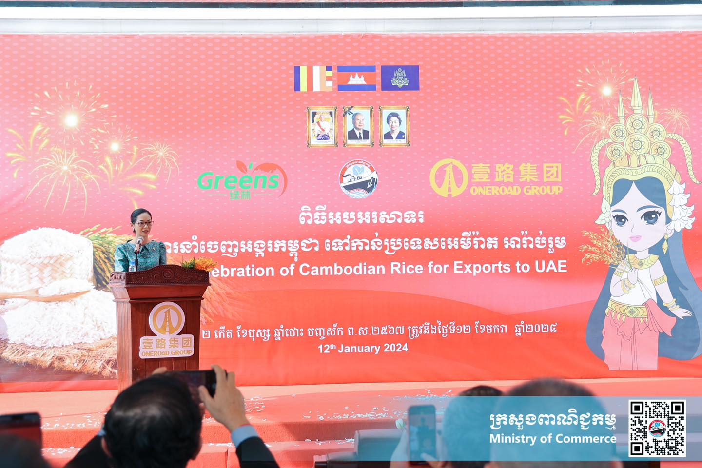 ថ្លែងក្នុងពិធីអបអរសាទរការនាំចេញអង្ករកម្ពុជា ទៅកាន់ទីផ្សារប្រទេសអេមីរ៉ាតអារ៉ាប់រួម លោកជំទាវរដ្ឋមន្ត្រី បានសម្ដែងនូវការអបអរសាទរ និងវាយតម្លៃខ្ពស់ចំពោះក្រុមហ៊ុន វ័នរ៉ូដ គ្រុប ដែលបានទទួលជោគជ័យក្នុងការបញ្ជាទិញ និងនាំចេញអង្ករកម្ពុជាទៅកាន់ទីផ្សារប្រទេសអេមីរ៉ាតអារ៉ាប់រួម និងការដឹកជញ្ជូនលើកទី១ ចំនួន ៥០០ តោន ដោយការបញ្ជាទិញក្នុងកម្រិតចំនួន ៦០០០០ តោន ស្មើនឹង ៥៤ លានដុល្លារអាម៉េរិក។