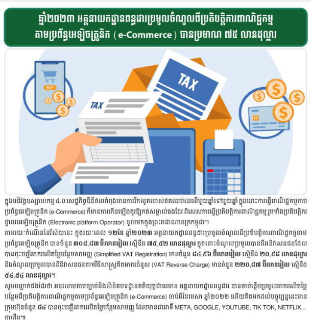 ក្នុងឆ្នាំ២០២៣ ពន្ធដារប្រមូលចំណូលពីប្រតិបត្តិការពាណិជ្ជកម្មតាមប្រព័ន្ធអេឡិចត្រូនិក បាន ៧៥លានដុល្លារ ខណៈបច្ចុប្បន្នមានក្រុមហ៊ុន៨៤ បានចុះបញ្ជីអាករលើតម្លៃបន្ថែម