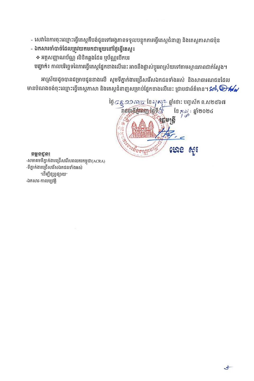 នៅក្នុងសេចក្ដីជូនដំណឹង បានបញ្ជាក់ថា កាលបរិច្ឆេទធ្វើតេស្ត ​បែងចែកជា ៤លើក គឺលើកទី១ នៅថ្ងៃទី០៤ ,០៨ និង០៩ ខែកុម្ភៈ។ លើកទី២ ថ្ងៃទី១៥ , ១៦​ និង១៨ ខែកុម្ភៈ។ លើកទី៣ ថ្ងៃទី២៤ និង២៥ ខែកុម្ភៈ។ លើកទី៤ នៅថ្ងៃទី២ ,៣ ,៦ និងទី៧ ខែមីនា ឆ្នាំ២០២៤ ខាងមុខនេះ។ ចំពោះទីតាំងធ្វើតេស្ត គឺនៅមណ្ឌល វិទ្យាស្ថានវិស័យអបរំ (EDI) តម្លៃ ១៤ដុល្លារ។