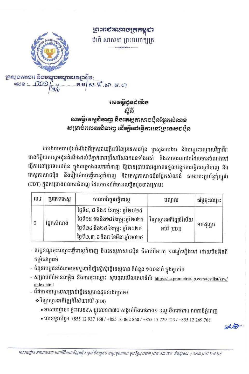 ក្រសួងការងារ និងបណ្ដុះបណ្ដាលវិជ្ជាជីវៈ នៅថ្ងៃទី០៦ ខែកុម្ភៈ ឆ្នាំ២០២៤ នេះ​ បានចេញសេចក្ដីជូនដំណឹង ស្តីពីការធ្វេីតេស្តជំនាញ​ និងតេស្តភាសាជប៉ុនផ្នែកសំណង់​ សម្រាប់ពលករជំនាញ​ ដេីម្បីទៅធ្វេីការនៅប្រទេសជប៉ុន។