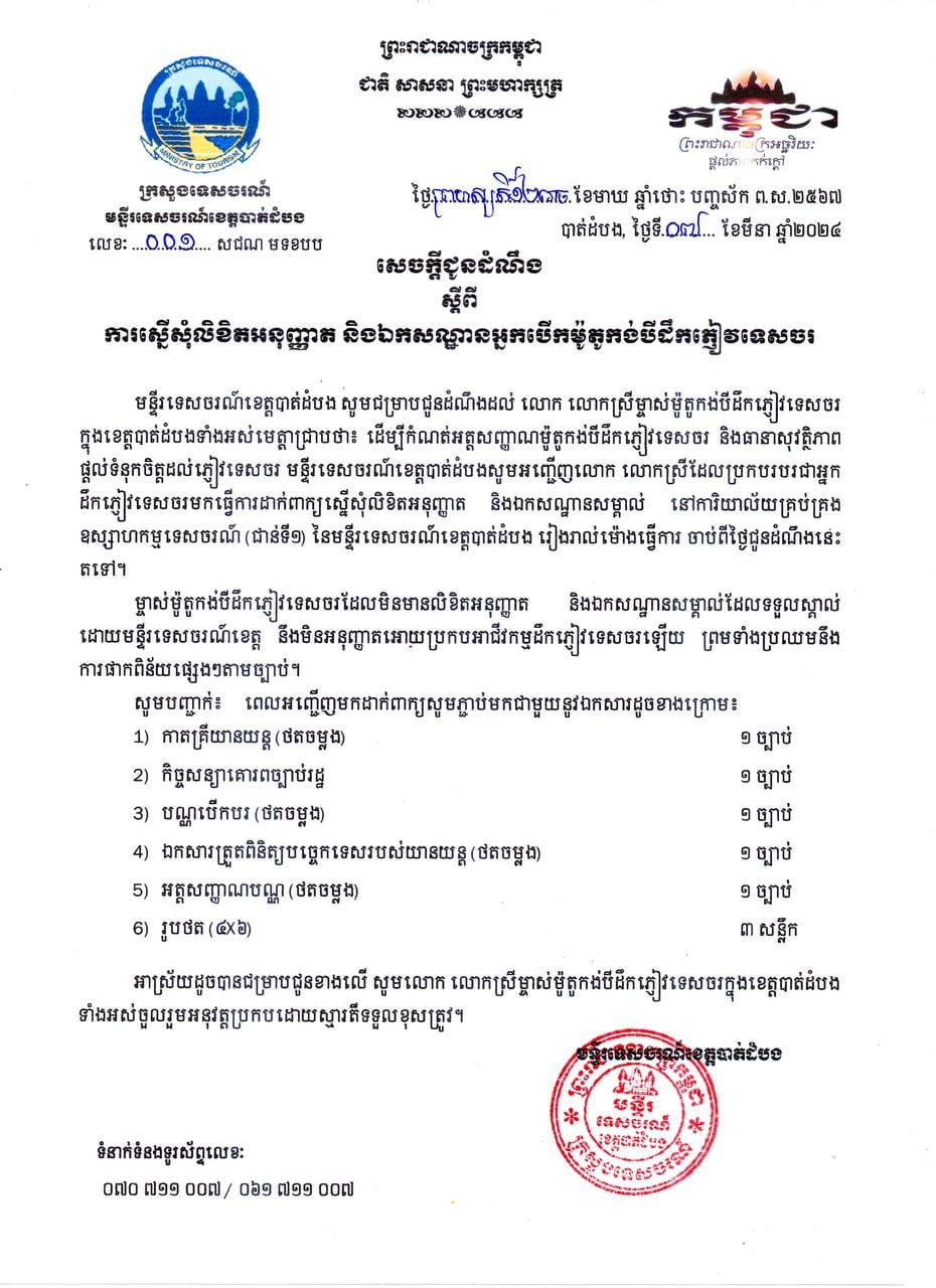 មន្ទីរទេសចរណ៍ខេត្តបាត់ដំបង នៅថ្ងៃទី១១ ខែមីនា ឆ្នាំ២០២៤ នេះ បានចេញសេចក្ដីជូនដំណឹង ស្ដីពីការស្នើសុំលិខិតអនុញ្ញាត និងឯកសណ្ឋានអ្នកបើកម៉ូតូកង់បីដឹកភ្ញៀវទេសចរ ដោយអ្នកដែលមកស្នើសុំ ១០០នាក់ដំបូង នឹងទទួលបានឯកសណ្ឋានអាវ ដោយឥតគិតថ្លៃ។