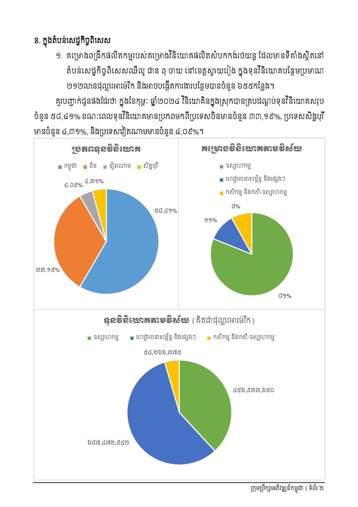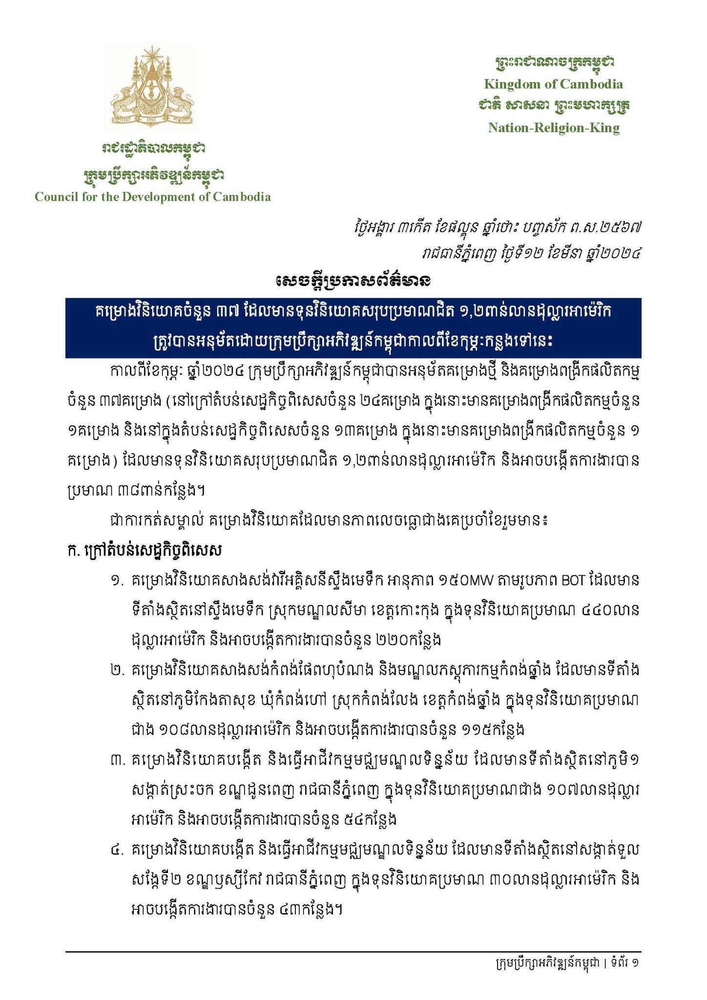 បើតាមការបញ្ជាក់នៅក្នុងសេចក្ដីប្រកាសព័ត៌មានរបស់ ក្រុមប្រឹក្សាអភិវឌ្ឍន៍កម្ពុជា នាល្ងាចថ្ងៃទី១២ ខែមីនា ឆ្នាំ២០២៤ នេះ ក្នុងចំណោគម្រោងថ្មីៗខាងលើនេះ នៅក្រៅតំបន់សេដ្ឋកិច្ចពិសេសមានចំនួន ២៤គម្រោង ក្នុងនោះមានគម្រោងពង្រីកផលិតកម្មចំនួន ១គម្រោង និងនៅក្នុងតំបន់សេដ្ឋកិច្ចពិសេសចំនួនមាន ១៣គម្រោង ក្នុងនោះមានគម្រោងពង្រីកផលិតកម្មចំនួន ១គម្រោង។