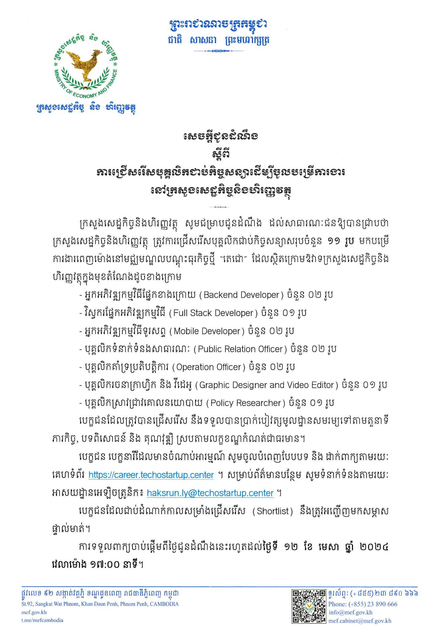 ក្រសួងសេដ្ឋកិច្ច បានបញ្ជាក់ថា ការទទួលពាក្យចាប់ផ្ដើមពីថ្ងៃជូនដំណឹងនេះរហូតដល់ថ្ងៃទី ១២ ខែ មេសា ឆ្នាំ ២០២៤ វេលាម៉ោង ១៧:០០ នាទី ឬ អាចចូលទៅក្នុងគេហទំព័រសម្រាប់ដាក់ពាក្យ៖ https://career.techostartup.center ។ សូមអានសេចក្ដីជូនដំណឹងនៅខាងក្រោម៖