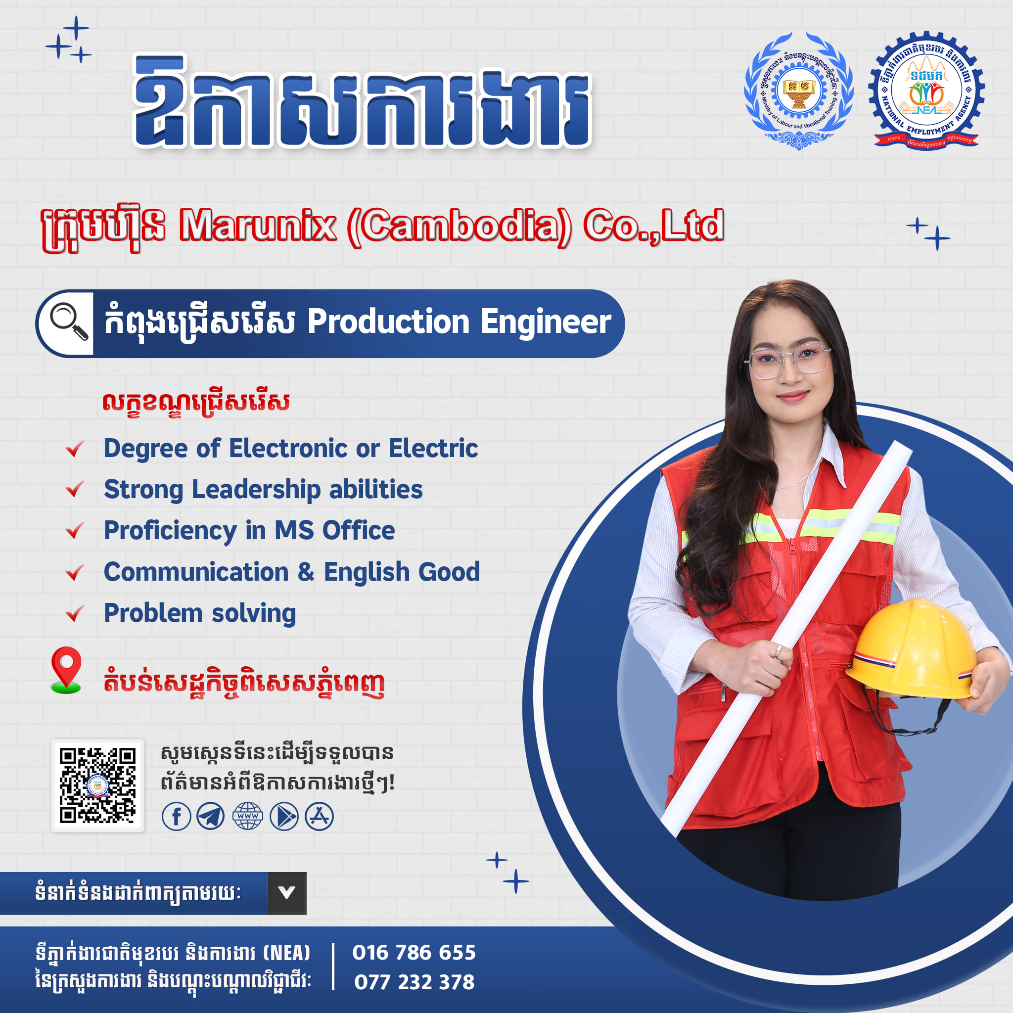 ក្រុមហ៊ុនជប៉ុន Marunix (Cambodia) Co.,Ltd ដែលស្ថិតនៅក្នុងតំបន់សេដ្ឋកិច្ចពិសេសភ្នំពេញ កំពុងត្រូវការជ្រើសរើសបុគ្គលិកជាច្រើននាក់ ផ្នែក វិស្វករ ផលិតកម្ម ។ នេះបើយោងតាមការចុះផ្សាយរបស់ ទីភ្នាក់ងារជាតិមុខរបរ និងការងារ (NEA) នៃក្រសួងការងារ និងបណ្តុះបណ្តាលវិជ្ជាជីវៈ នាថ្ងៃទី០៣ ខែមេសា ឆ្នាំ២០២៤។