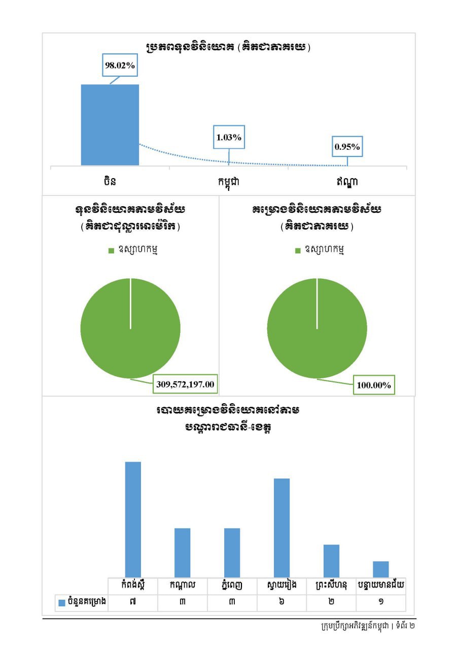 បើតាមរបាយគម្រោងវិនិយោគនៅតាមបណ្ដារាជធានី-ខេត្ត ឃើញថា ខេត្តកំពង់ស្ពឺ ទទួលបានគម្រោងច្រើនជាងគេរហូតទៅដល់ ៧គម្រោង បន្ទាប់មកខេត្តស្វាយរៀងទទួលបាន ៦គម្រោង ខេត្តកណ្ដាល ៣គម្រោង ទីក្រុងភ្នំពេញ ៣គម្រោង ខេត្តព្រះសីហនុ ២គម្រោង និងបន្ទាយមានជ័យ ១គម្រោង។ គួរគូសរំលេចផងដែរថា ក្នុងខែមេសា ឆ្នាំ២០២៤ នេះ ការវិនិយោគមកពីប្រទេសចិនស្ថិតនៅលំដាប់លេខរៀងទី១ ដោយបានរួមចំណែករហូតទៅដល់ប្រមាណ ៩៨% នៃទុនវិនិយោគ៕