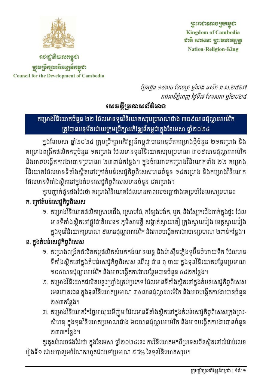 យោងតាមការចុះផ្សាយរបស់ ក្រុមប្រឹក្សាអភិវឌ្ឍន៍កម្ពុជា នាថ្ងៃទី០៧ ខែឧសភាព ឆ្នាំ២០២៤ នេះ បានឱ្យដឹងថា ក្នុងខែមេសា ឆ្នាំ២០២៤ ក្រុមប្រឹក្សាអភិវឌ្ឍន៍កម្ពុជាបានអនុម័តគម្រោងថ្មី និងគម្រោងពង្រីកផលិតកម្មចំនួន ២២គម្រោង ដែលមានទុនវិនិយោគសរុបប្រមាណជាង ៣០៩លានដុល្លារ និងអាចបង្កើតការងារបានប្រមាណ ២៣ពាន់កន្លែង។